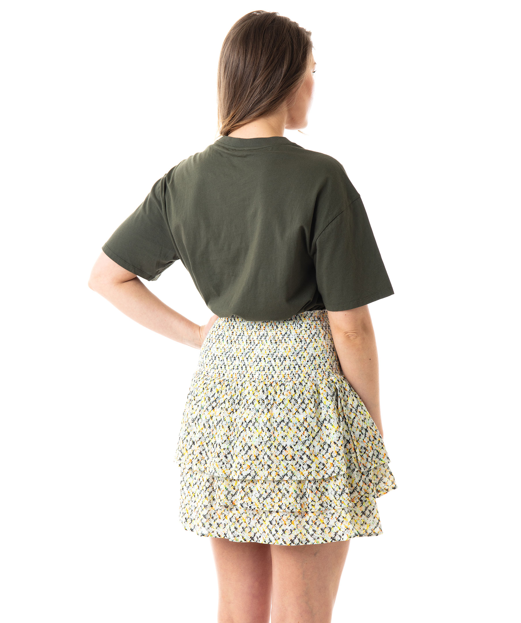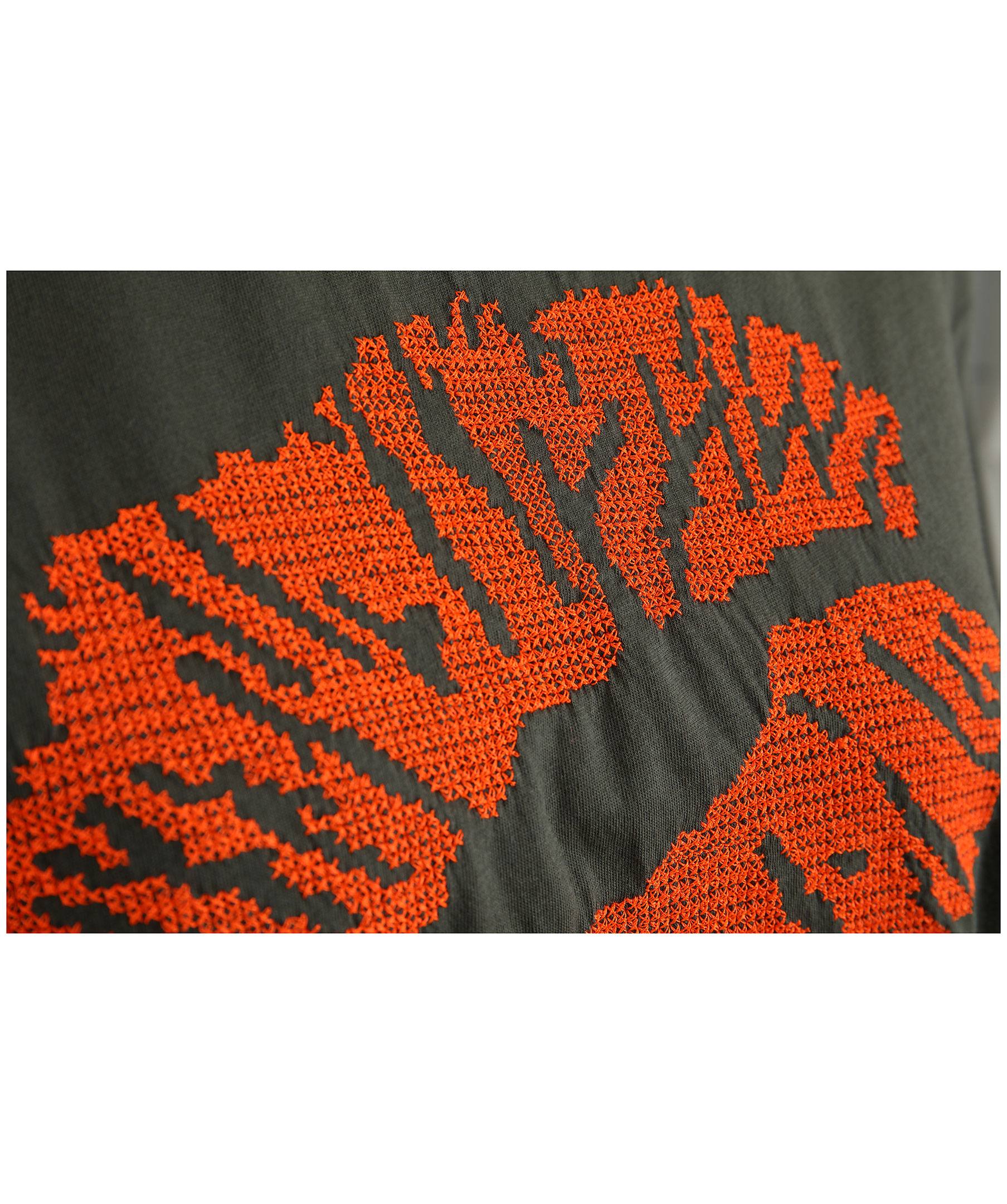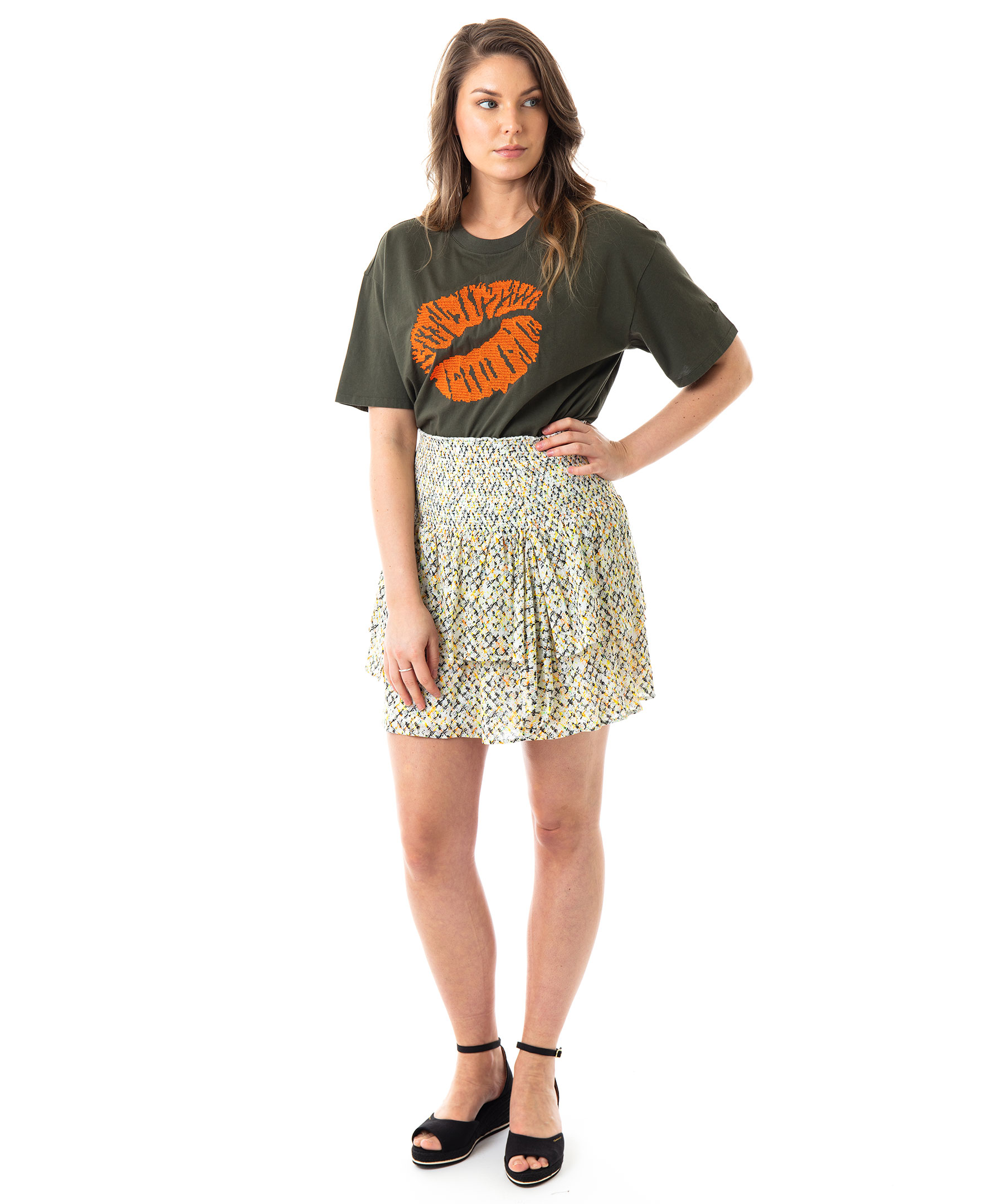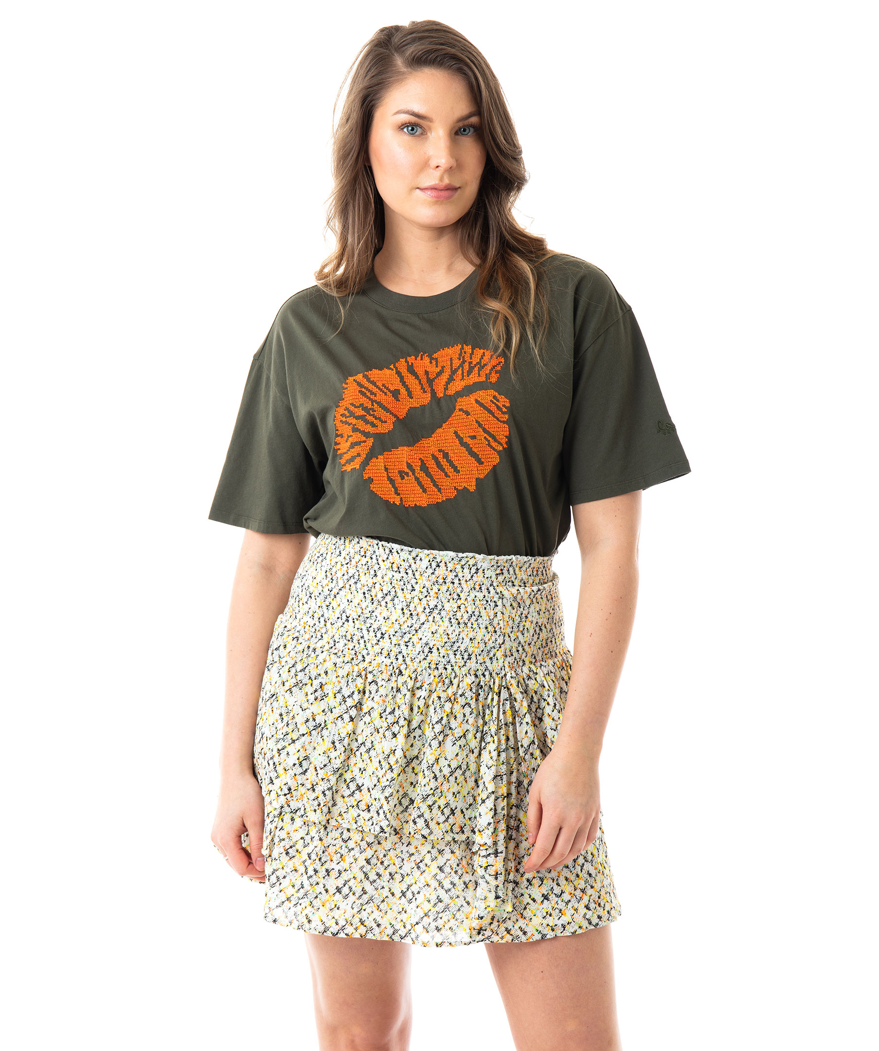 Militärgrön, vid t-shirt från La La Berlin. Orangea korsstygn som bildar en pussmun över bröstet. Korta ärmar och rundad halsringning. Tillverkad i 100% bomull. Modellen är 175 cm lång och bär storlek S.