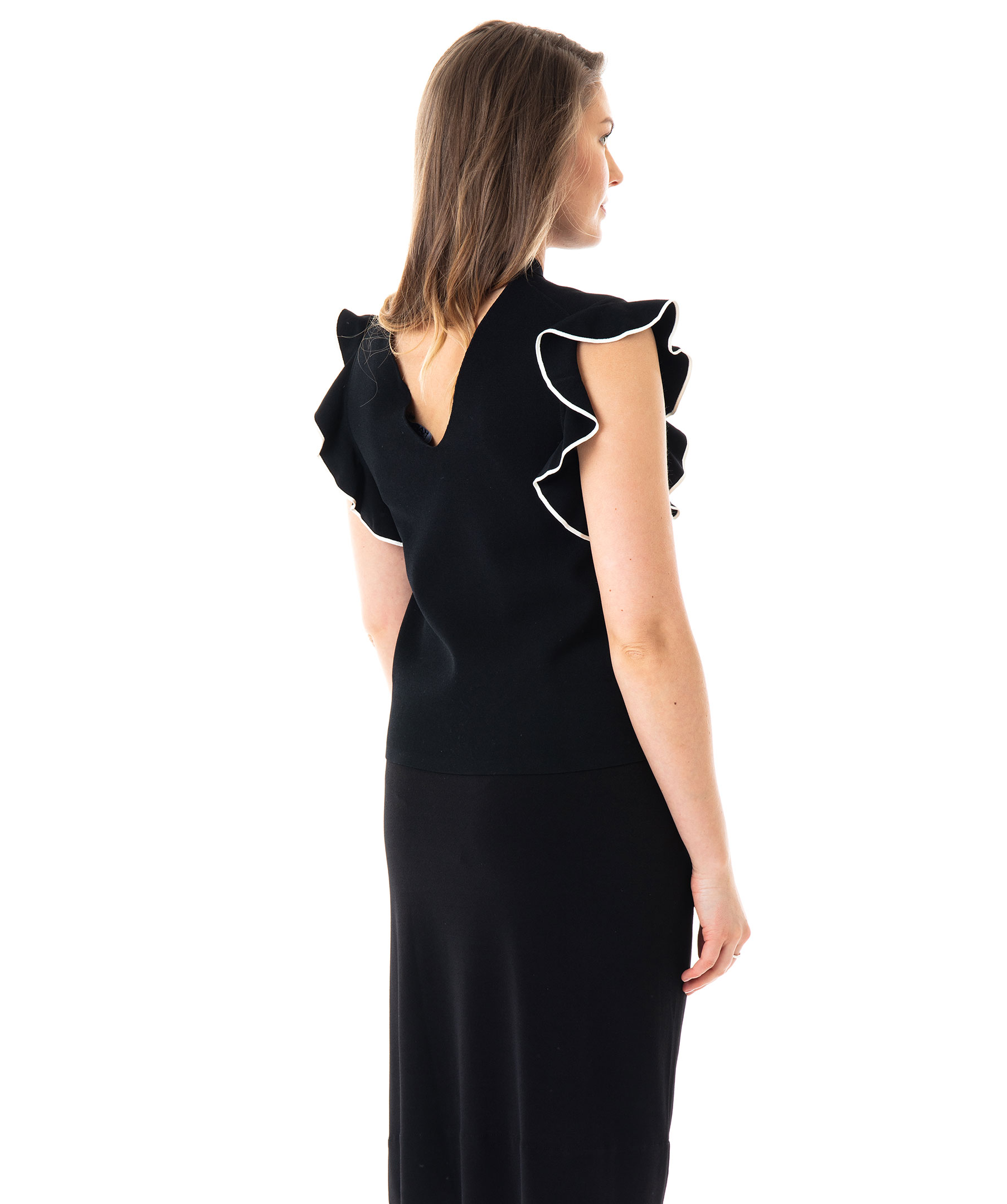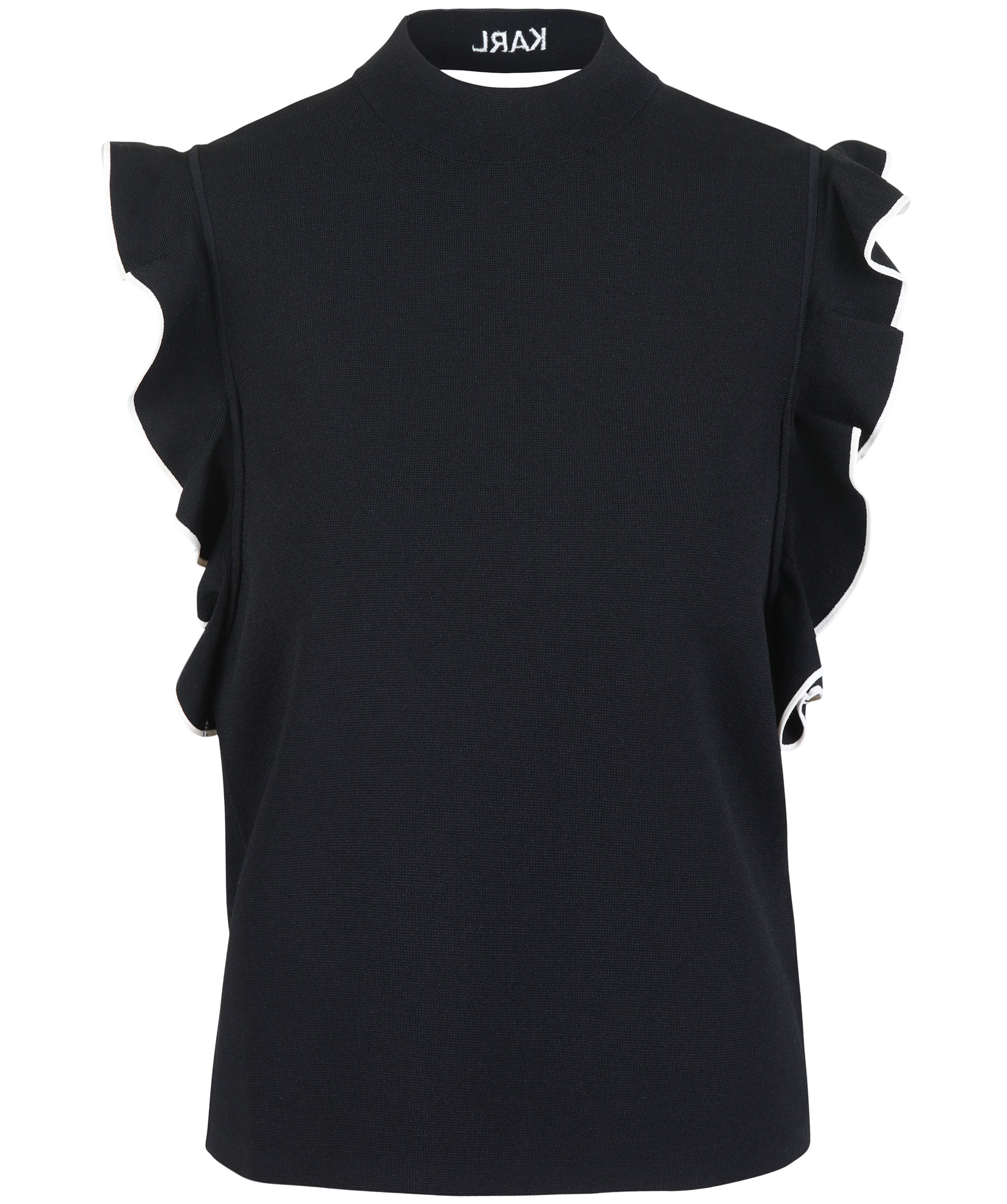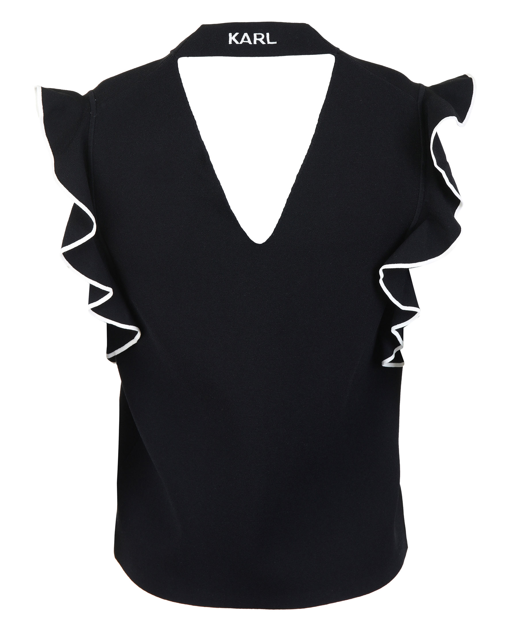 Svart finstickad kortärmad topp i smal passform från Karl Lagerfeld. Tillverkad i en stretchig viskosmix, volangkanter vid ärmslut och utskuren v-form i ryggen. Broderad med 'KARL' i nacken. Modellen är 175 cm lång och bär storlek S.