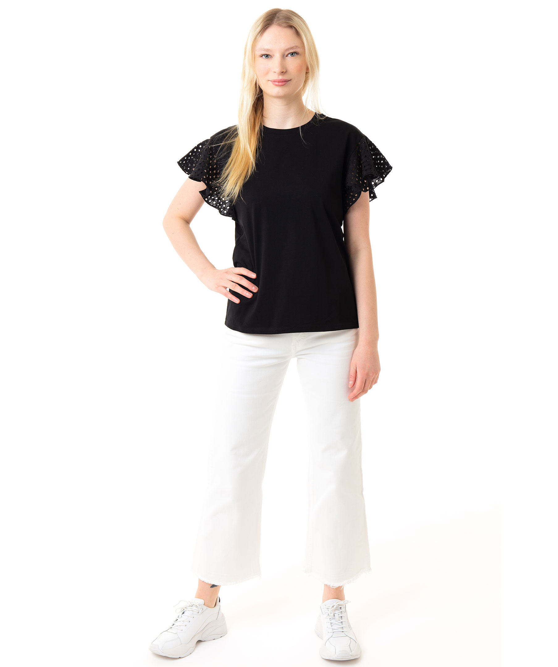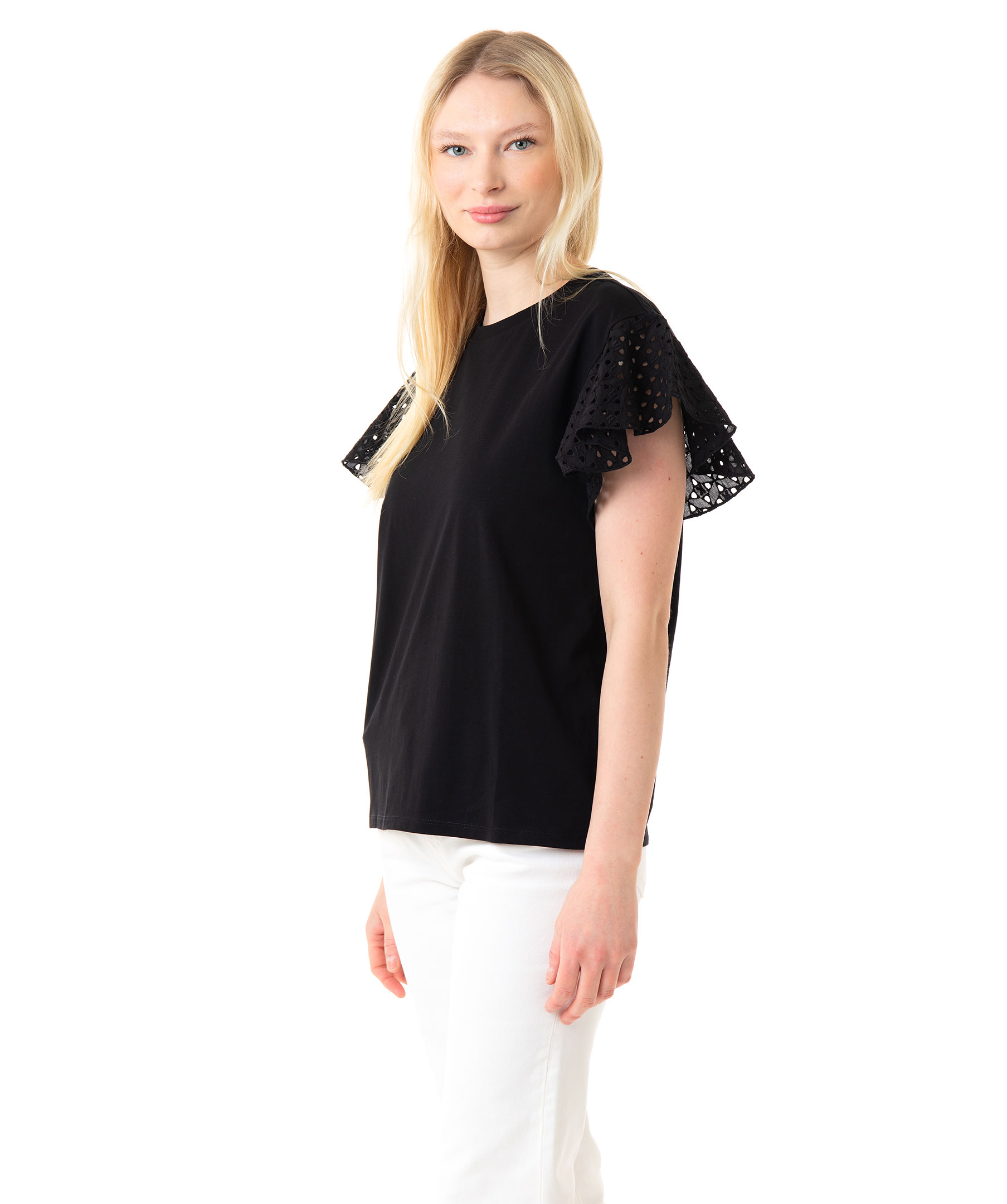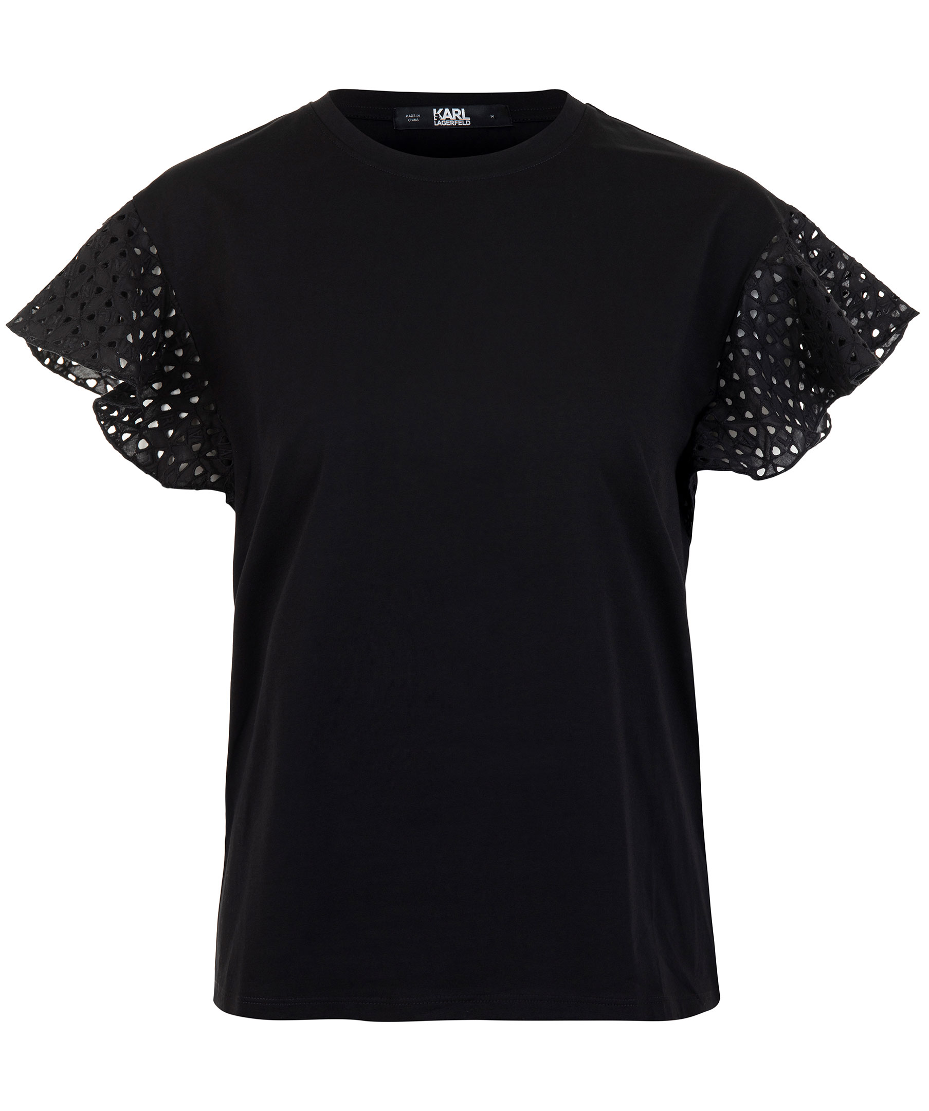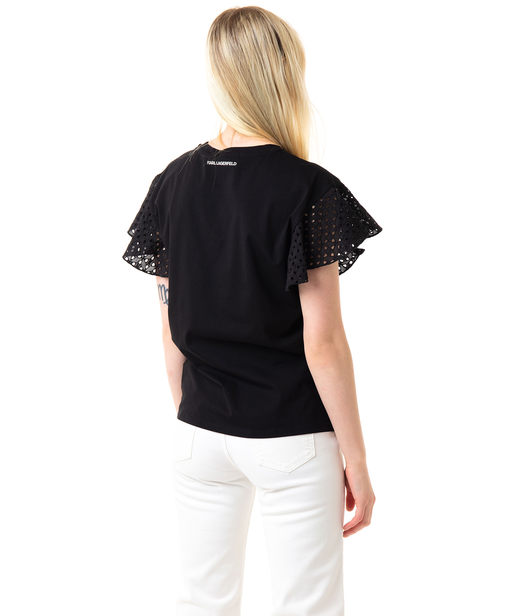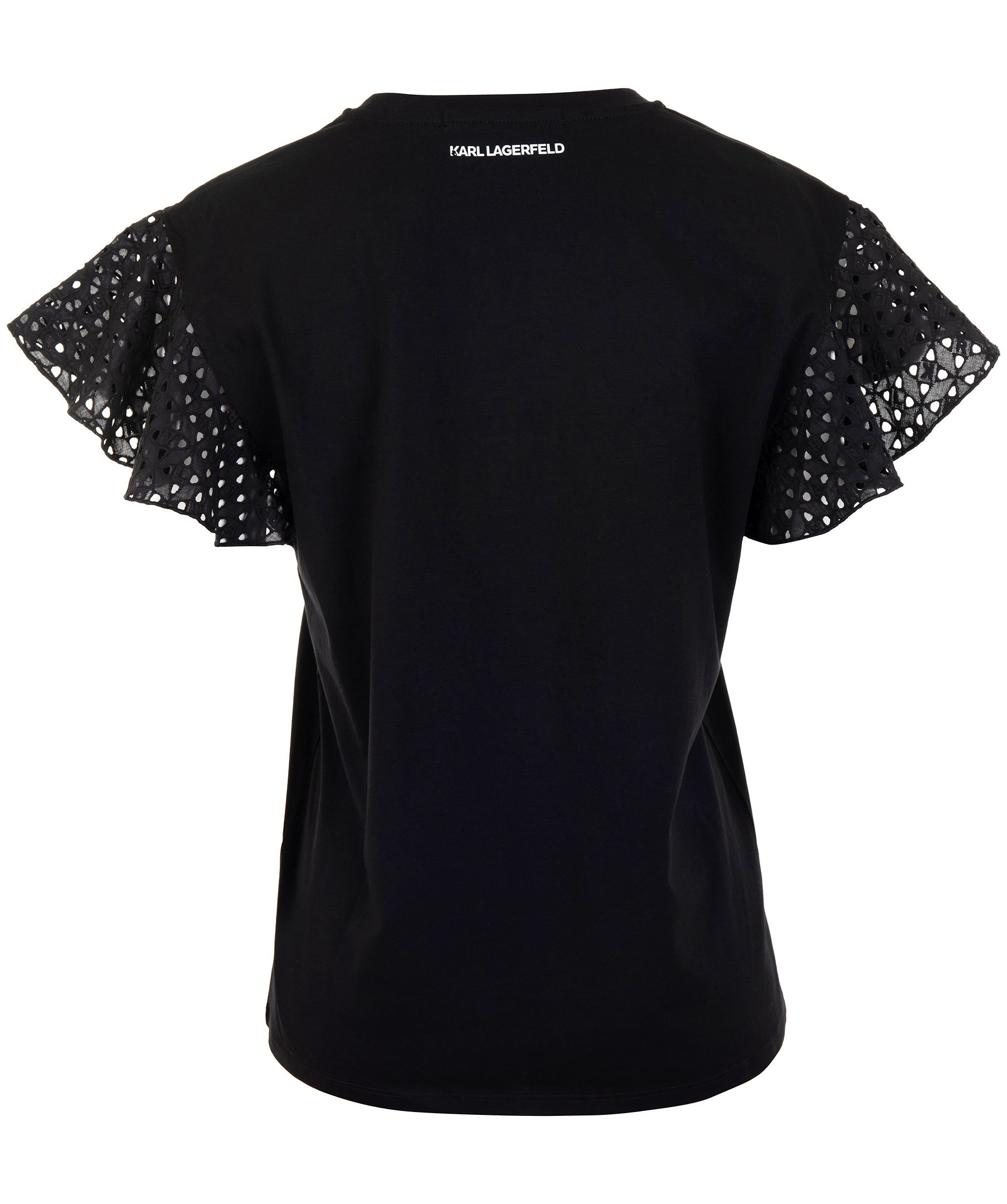 Svart, kortärmad t-shirt med volangärmar från Karl Lagerfeld. Broderingar med bokstäverna K, A, R och L på och håligheter på ärmarna. Hög, rundad halsringning och rak modell. Tillverkad i stretchigt bommulstyg. Modellen är 174 cm lång och bär storlek M.