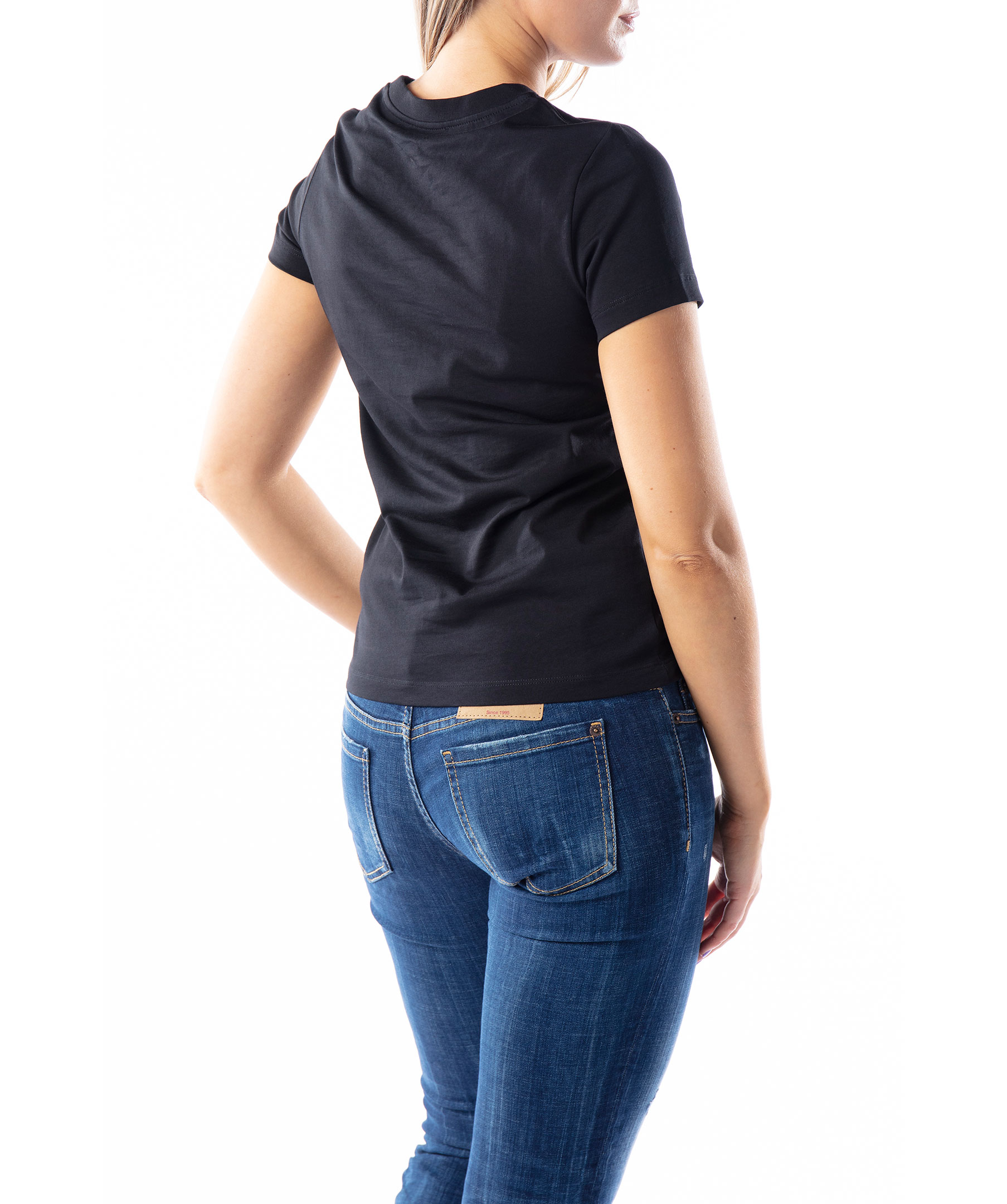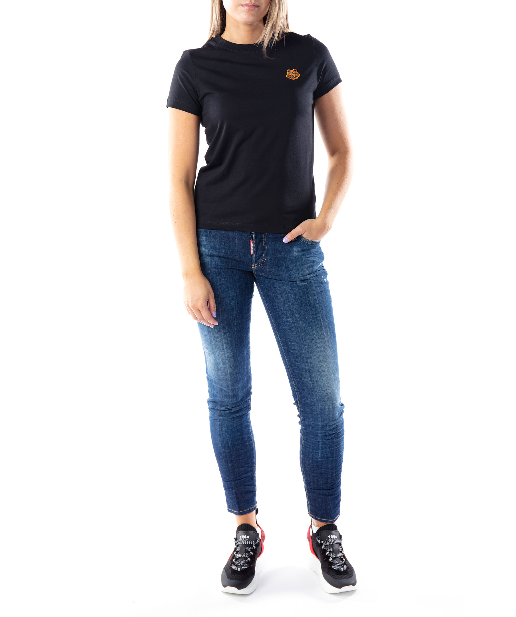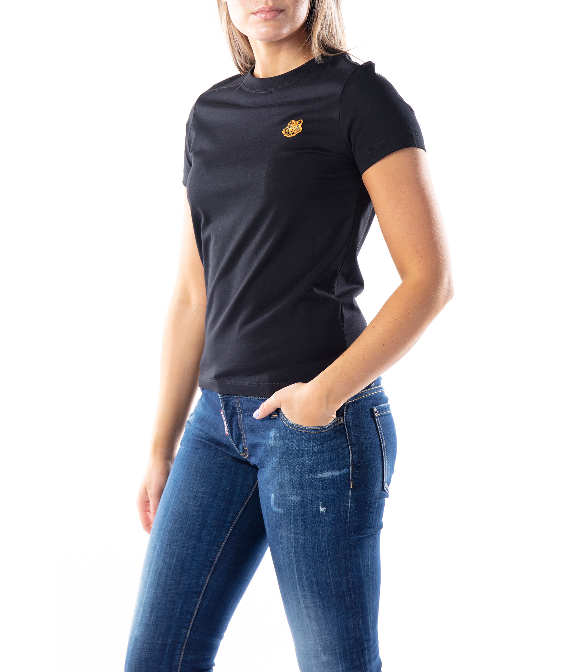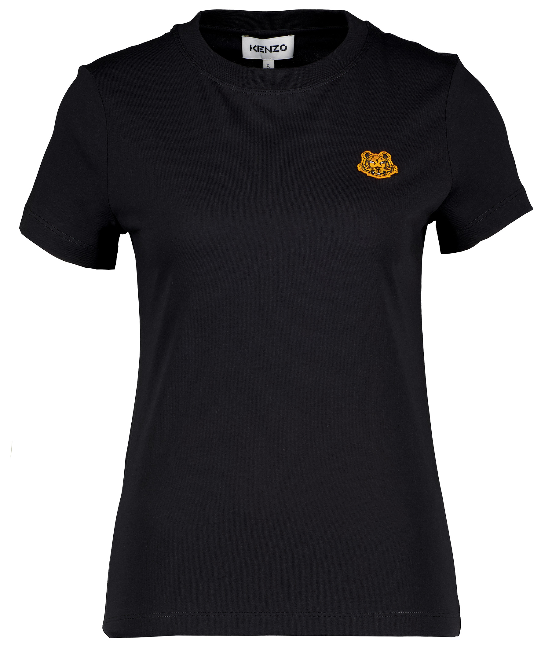 Svart t-shirt i 100% bomull från Kenzo. Orange, broderad tiger på vänster sida av bröstet och rundad halsringning. Modellen är 175 cm lång och bär storlek S.