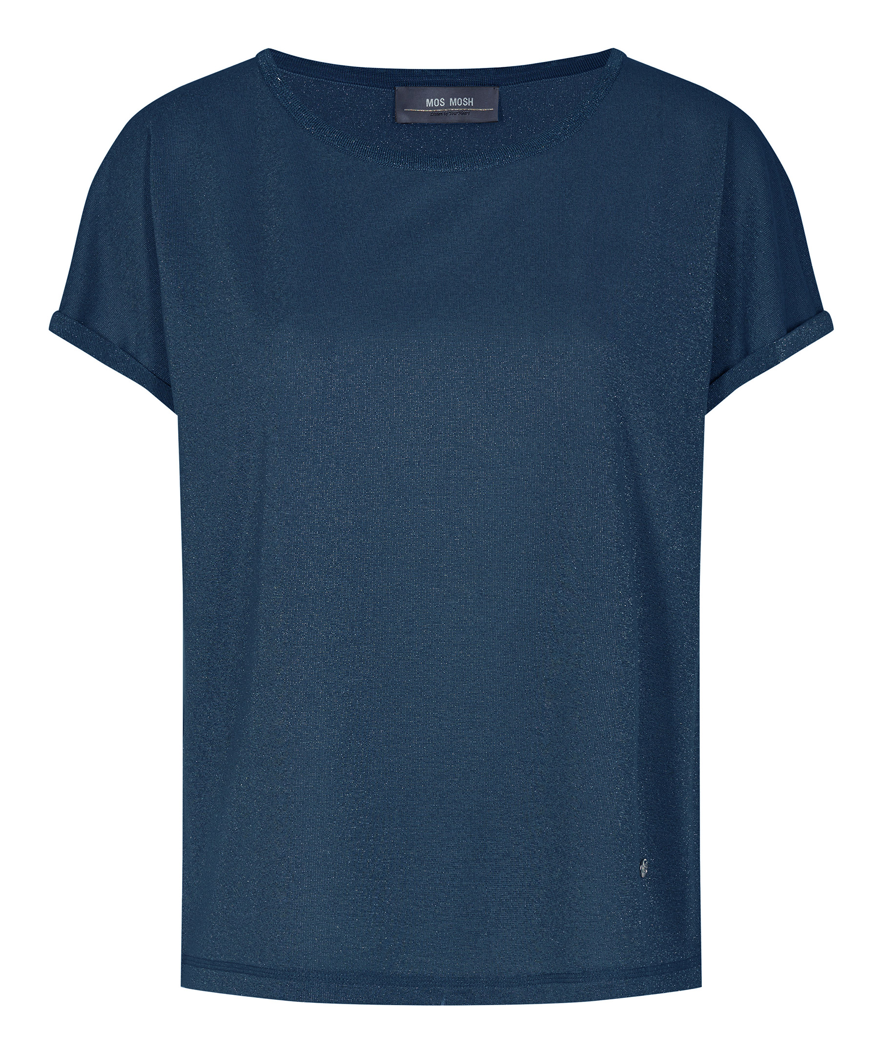 Blå finstickad t-shirt med glittriga trådar från Mos Mosh. Avslappnad passform, logotyp i metall vid plaggslut i plaggslut.