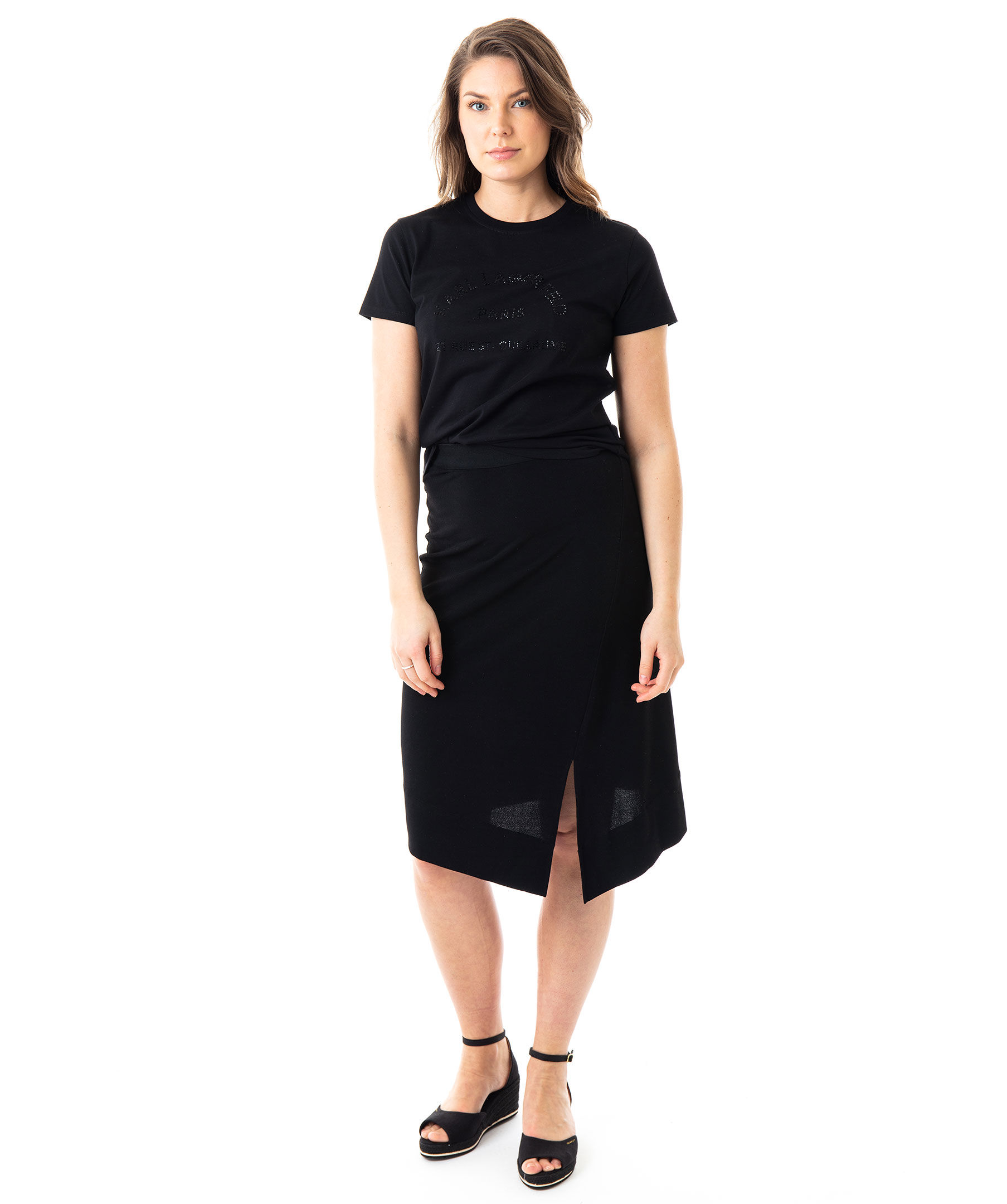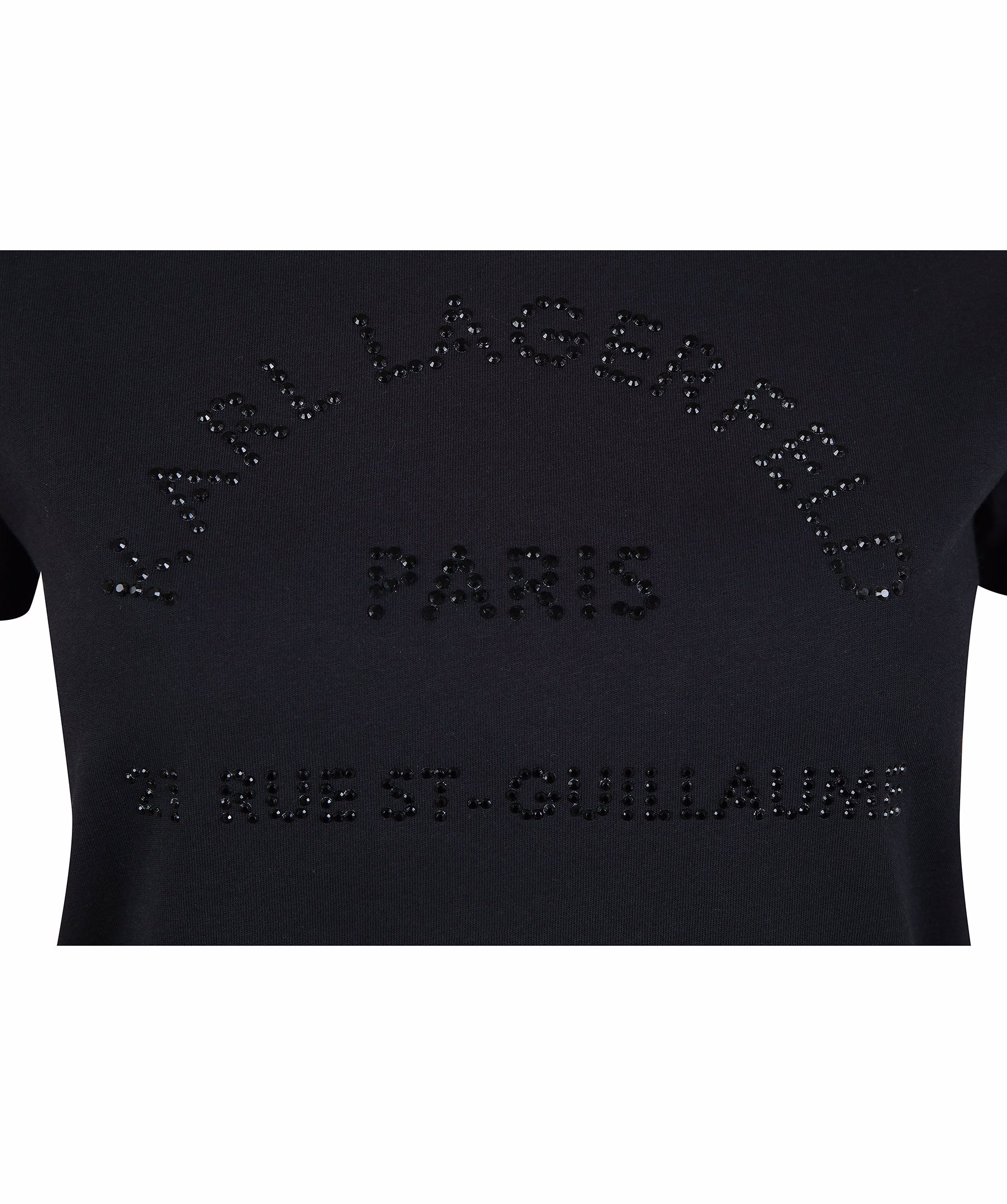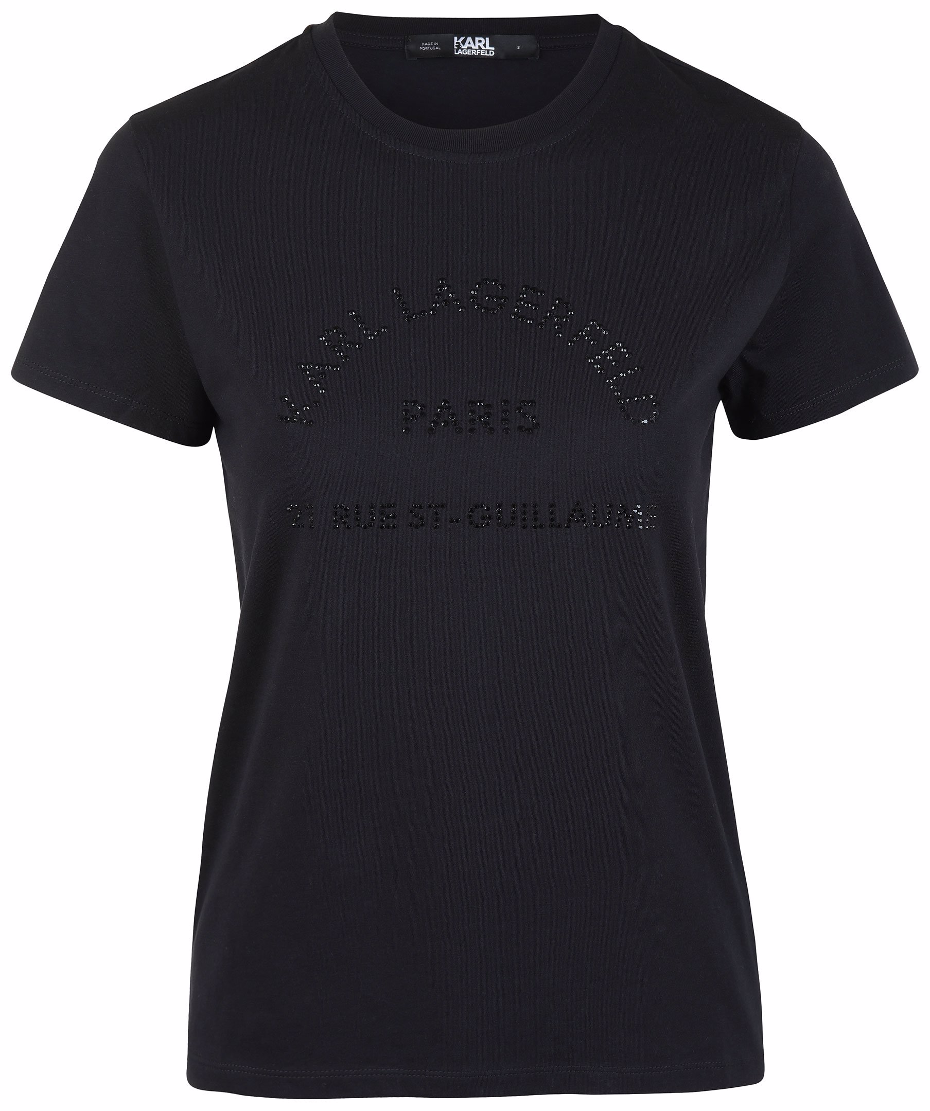 Svart t-shirt från Karl Lagerfeld. Tillverkad i 100% bomull. Logotyp i strass på bröstet och rundad hals. Modellen är 175 cm lång och bär storlek S.
