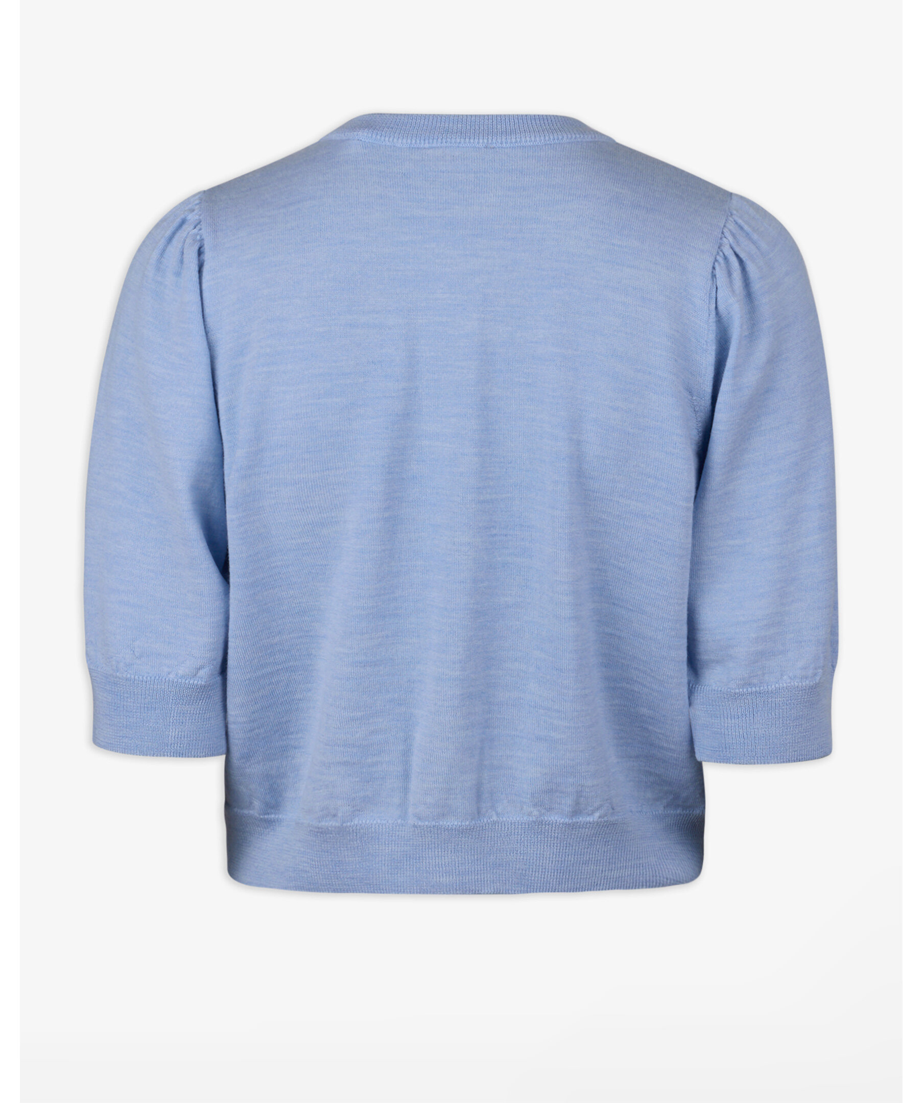 Blå kofta tillverkad av merinoull och har guldiga knappar, korta ärmar samt ribbstickade plaggslut.