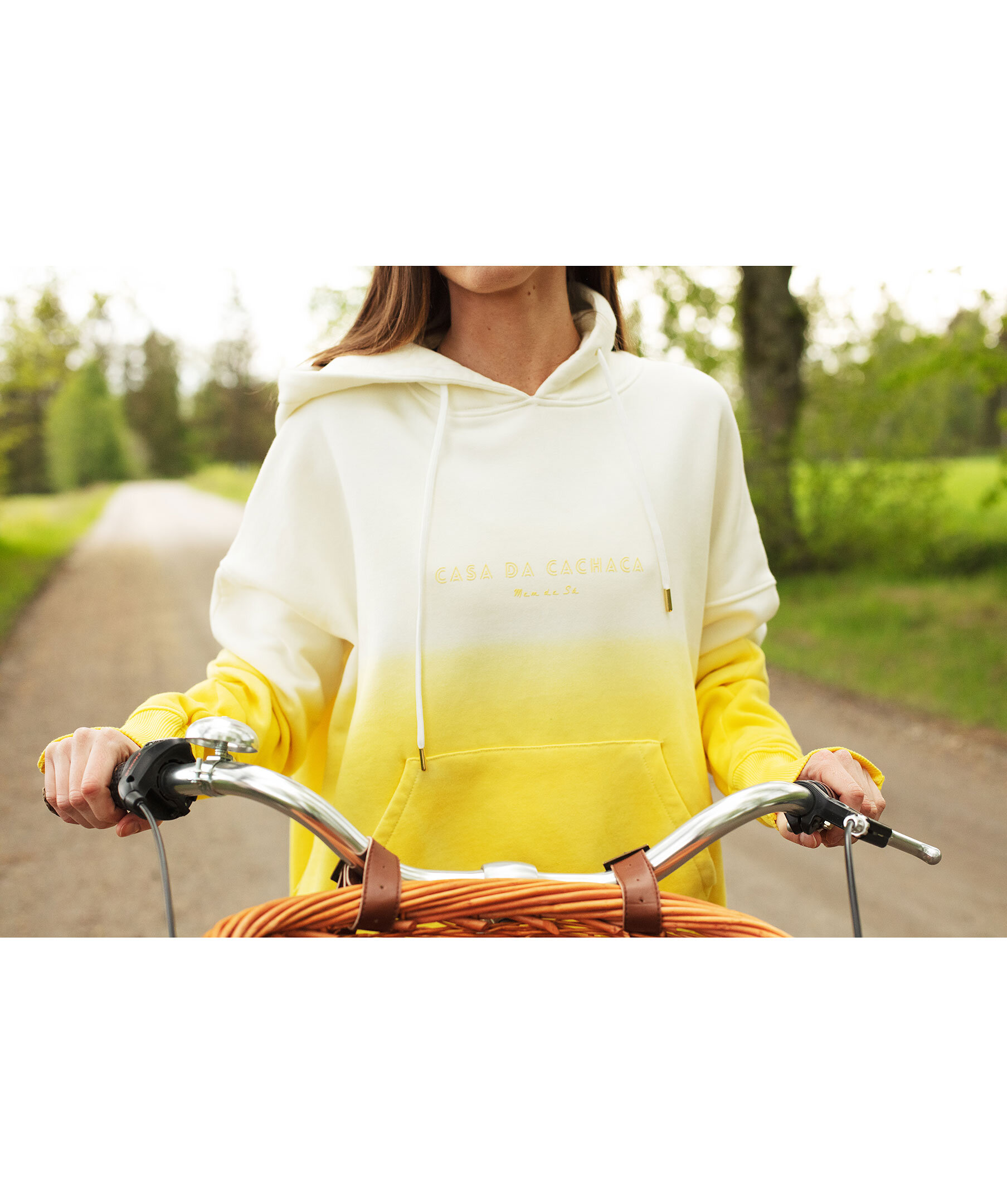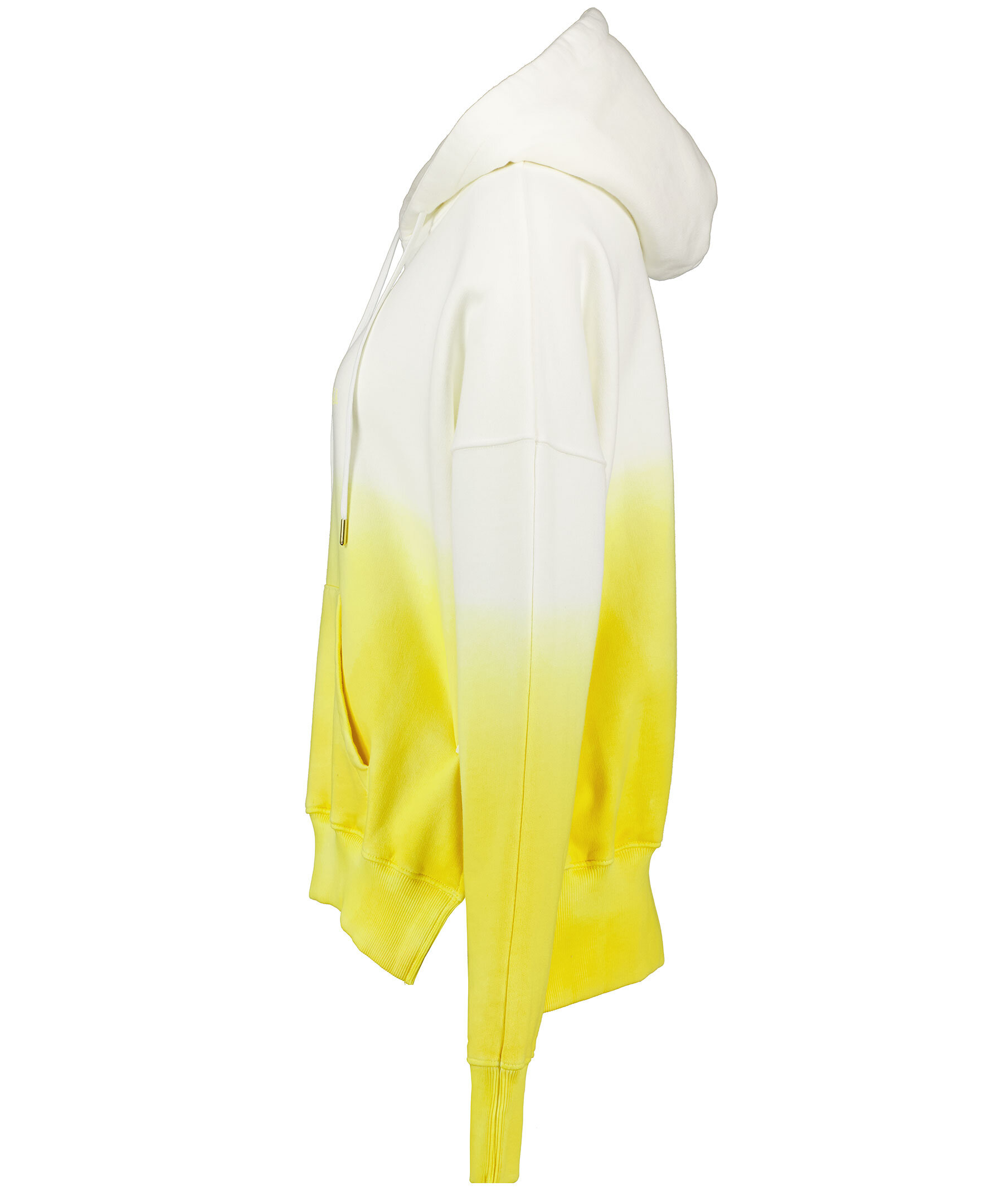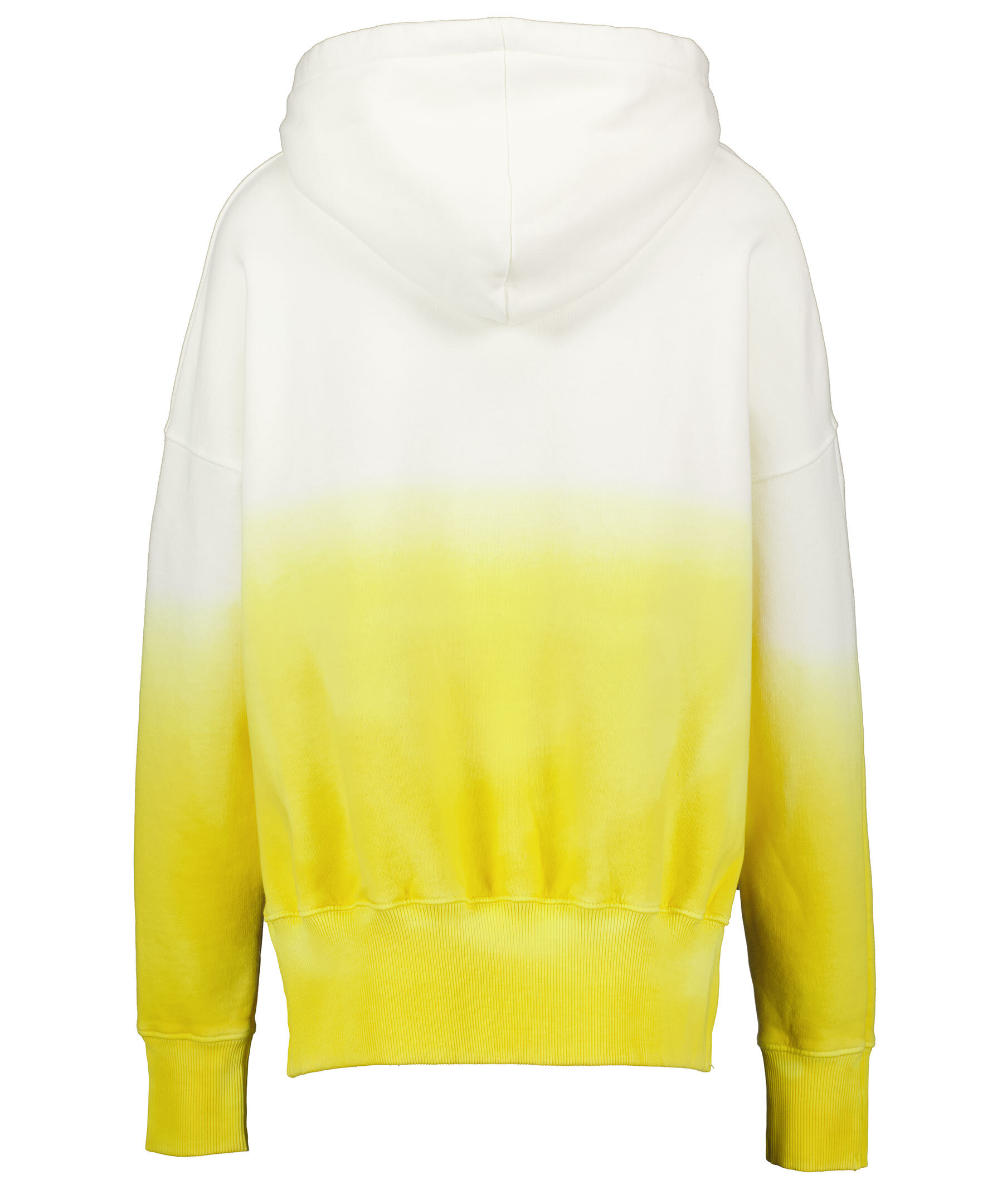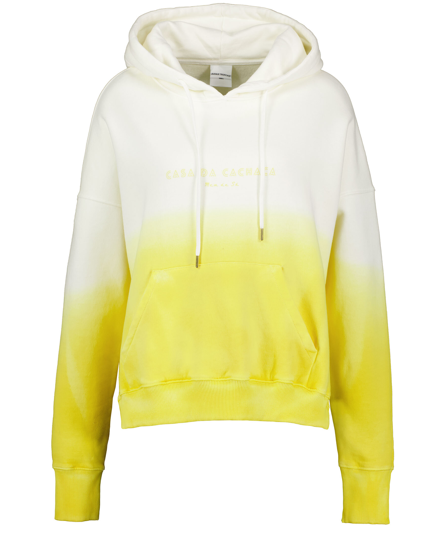 Vit och gul hoodie i avslappnad passform från Avenue Tropicale. Tillverkad i bomull, har en borstad insida och har färgats med en dip dye teknik som gör att nederdelen och överdelens färger får en mjuk övergång. Tryckt logga på bröstet, luva med snörning, känguruficka på magen och tappade sömmar på axlarna. Mudd i ärmslut och plaggslut samt slitsar i sidorna.