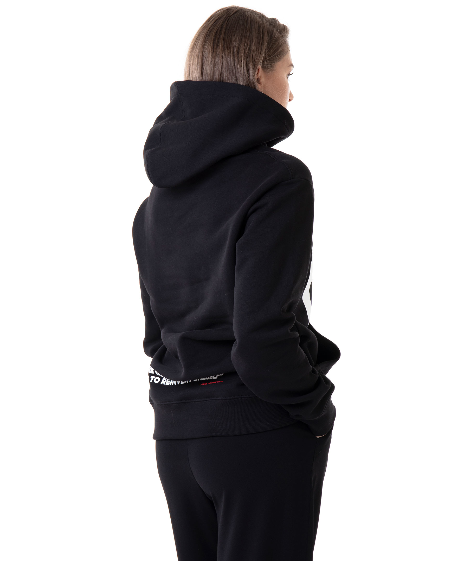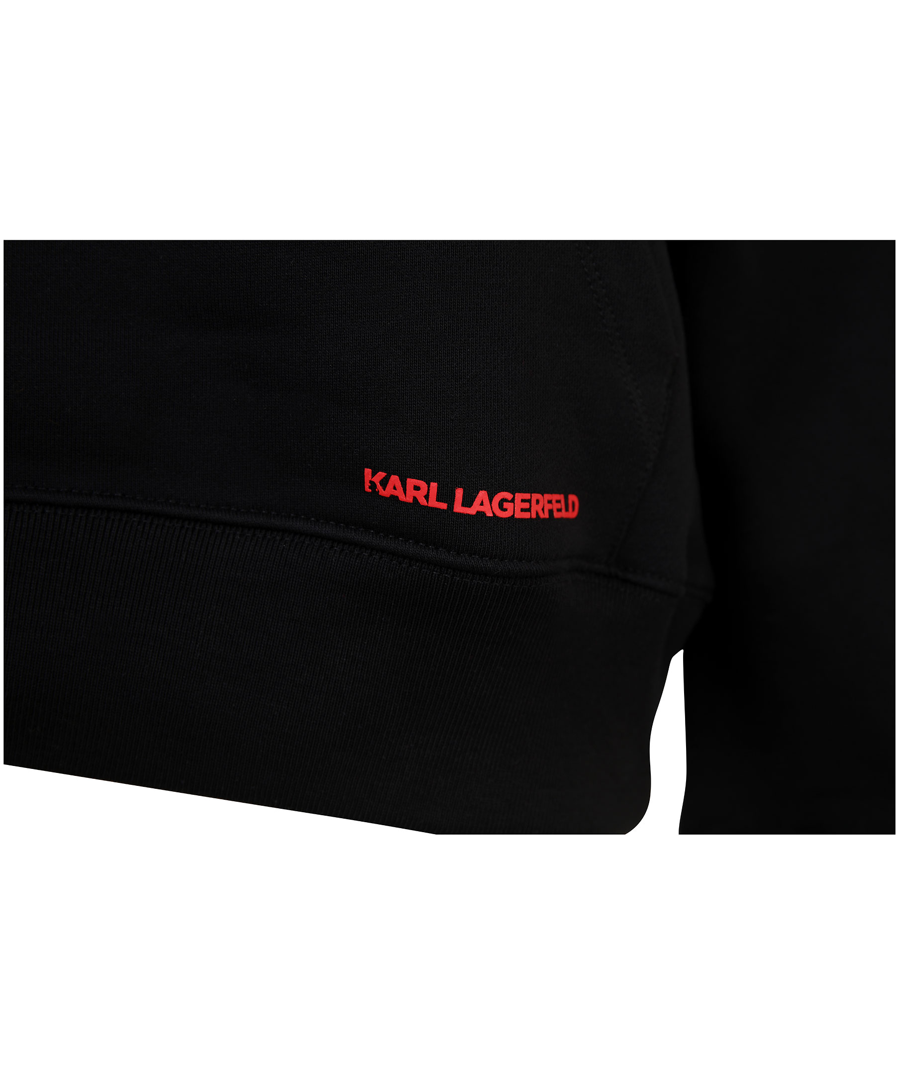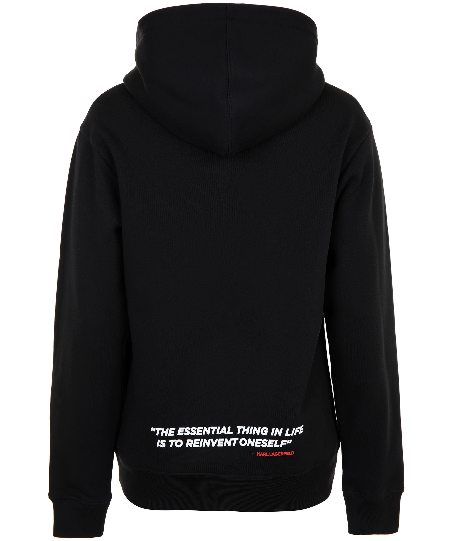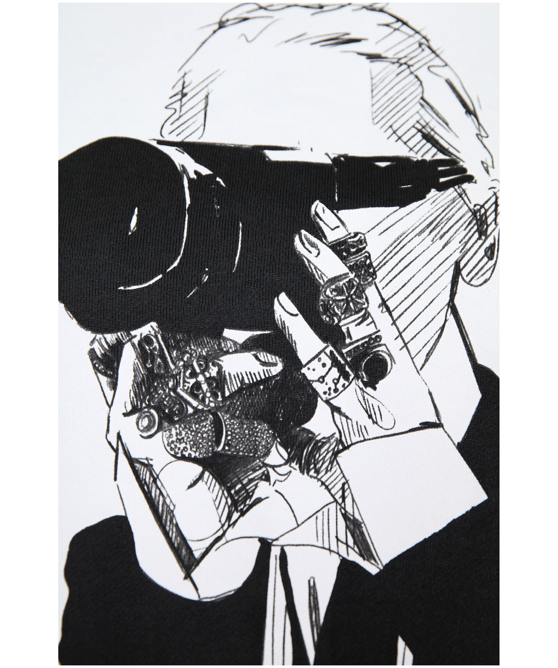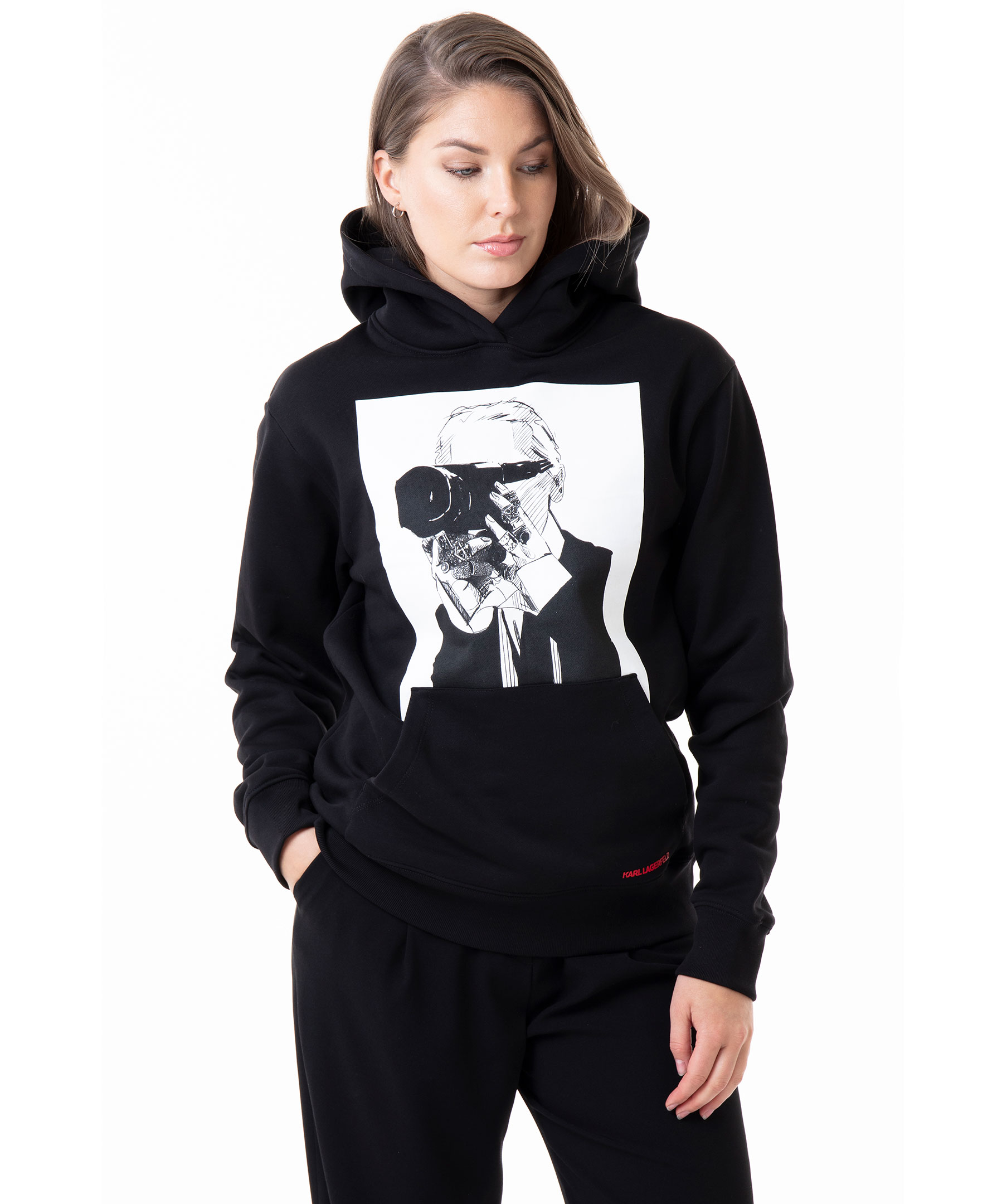 Svart hoodie från Karl Lagerfeld i 100% bomull. tryckt, vit illustration på bröstet föreställande Karl som fotograferar. Muddar i ärmslut och ficka på magen. Modellen är 175 cm lång och bär storlek S.