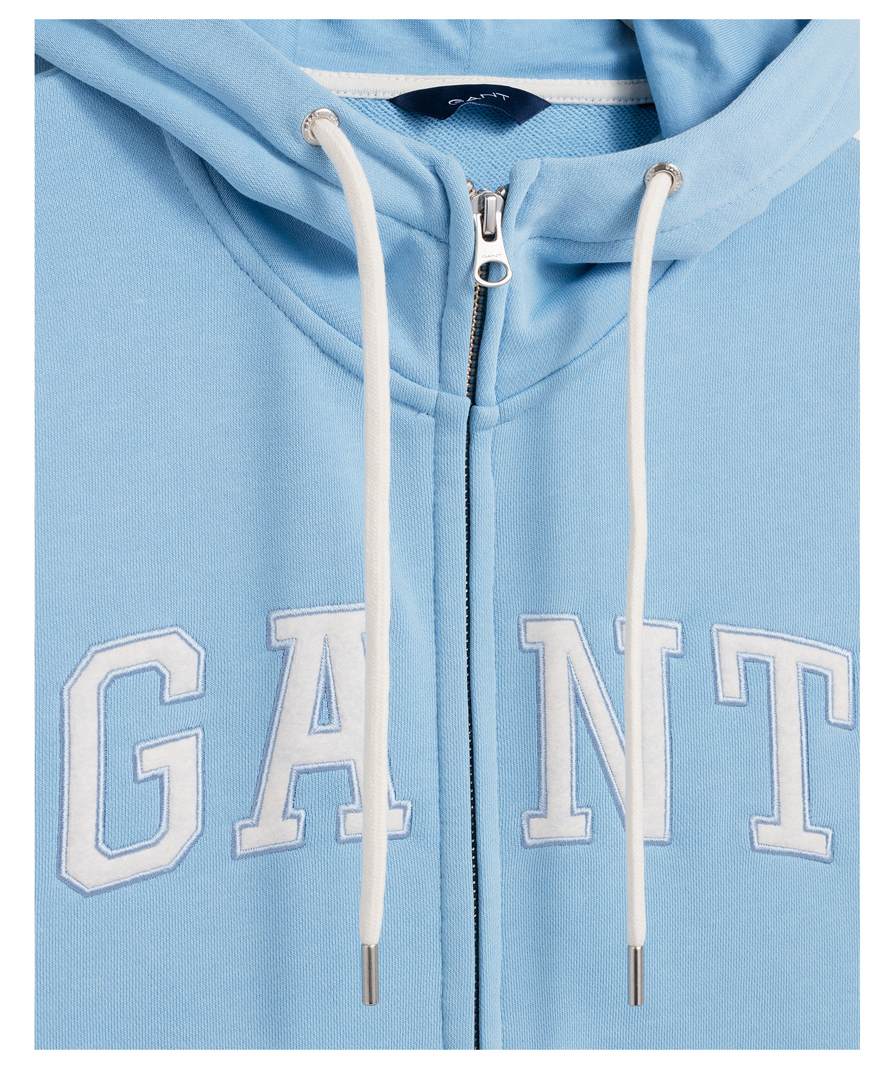 Ljusblå luvtröja från Gant med hellång dragkedja. Ton i ton logotyp på bröstet, dragsko i luvan.