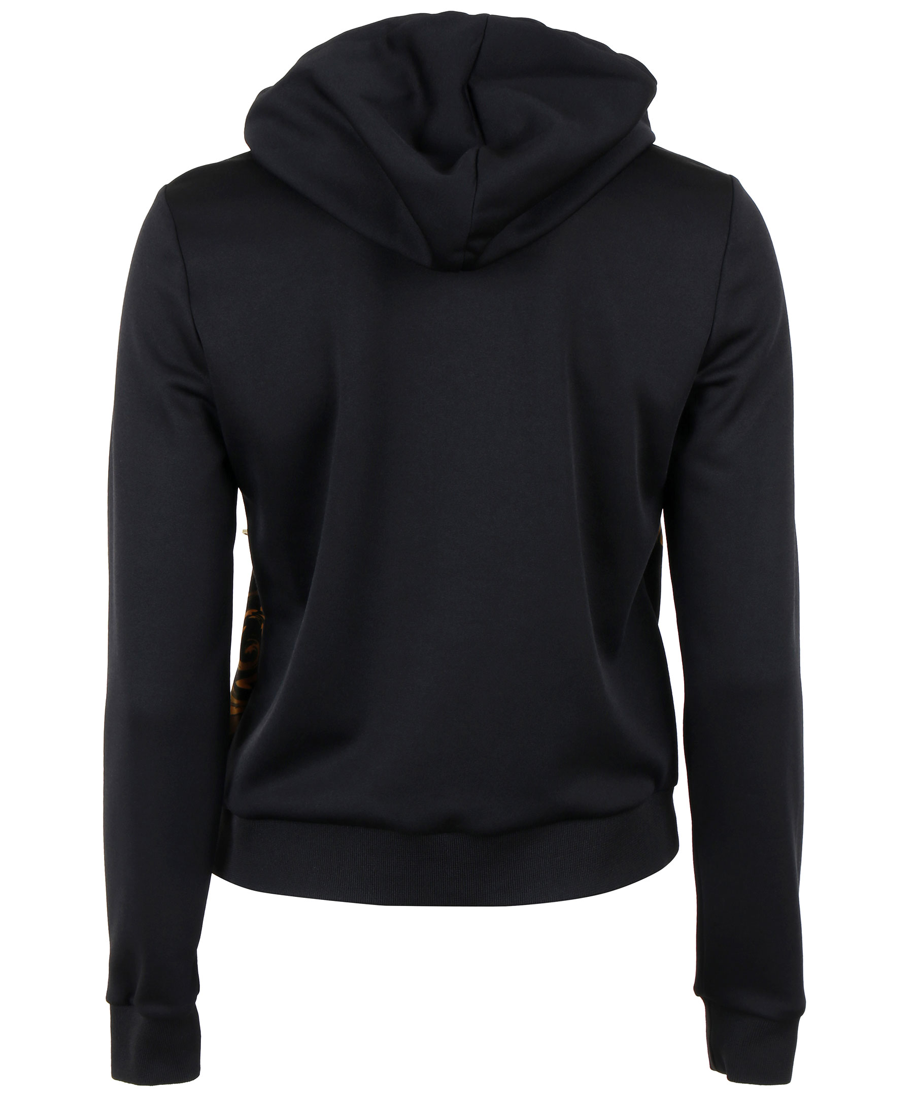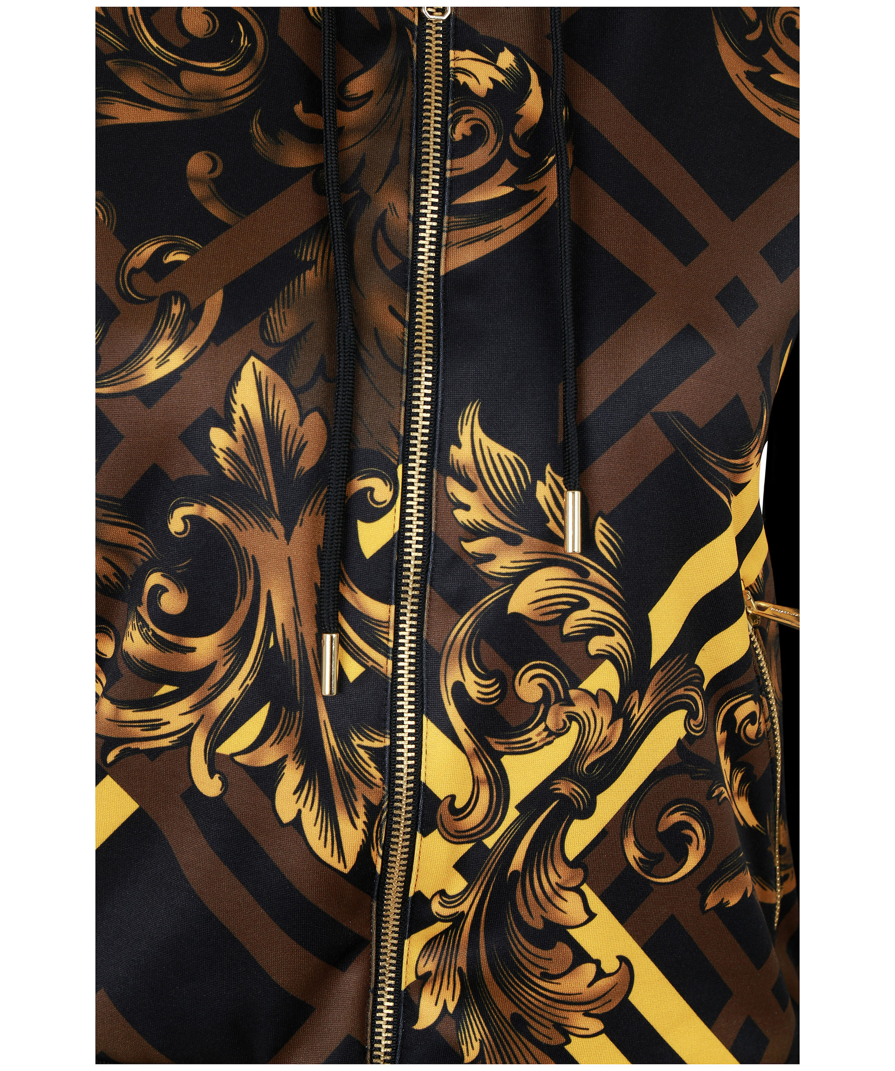 Mönstrad luvtröja från Versace Jeans. Två sidofickor med dragkedja och snörning vid luvan. Stängs med dragkedja längst plaggets mitt. Ribbstickade muddar.