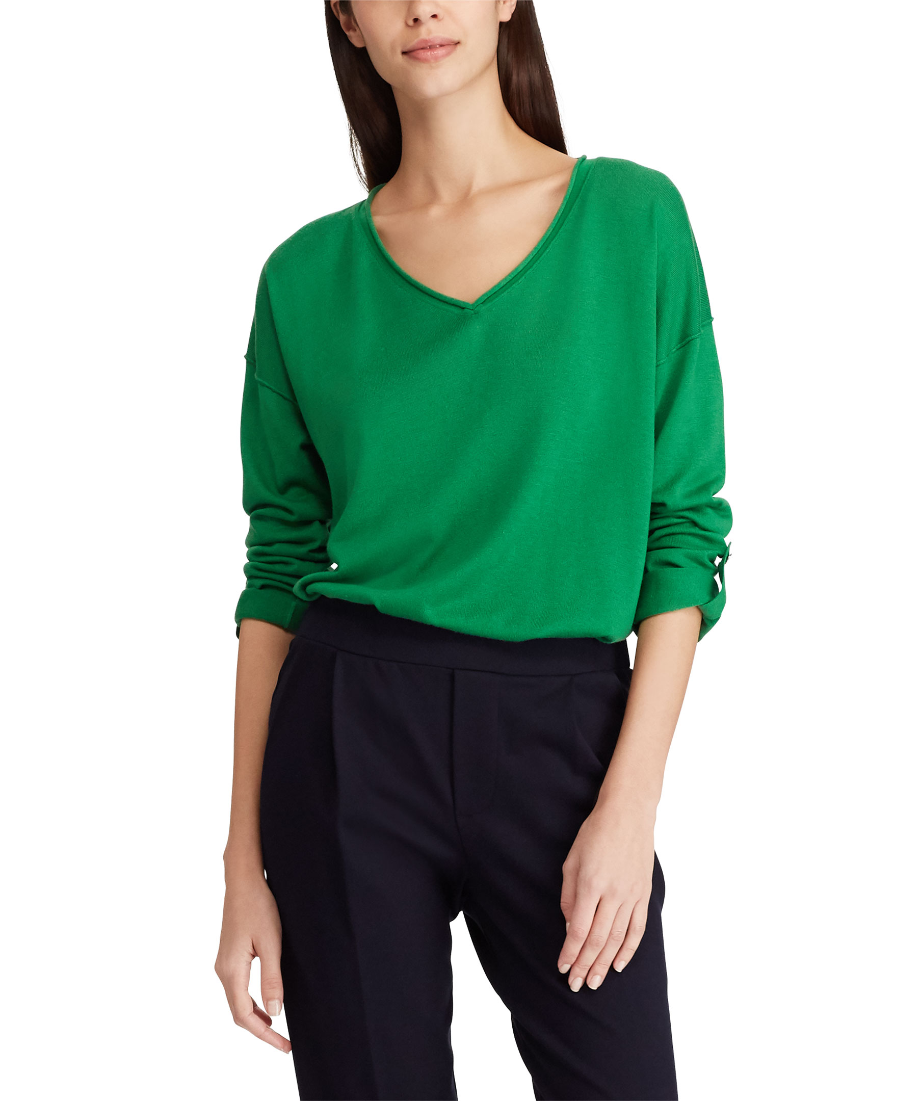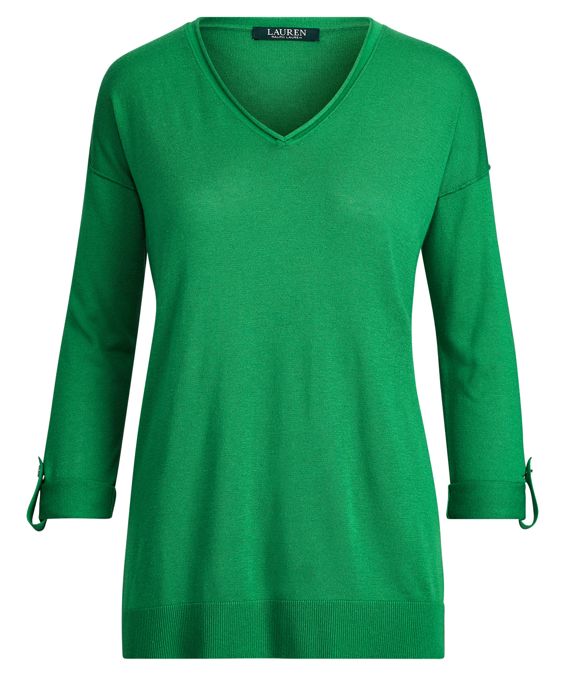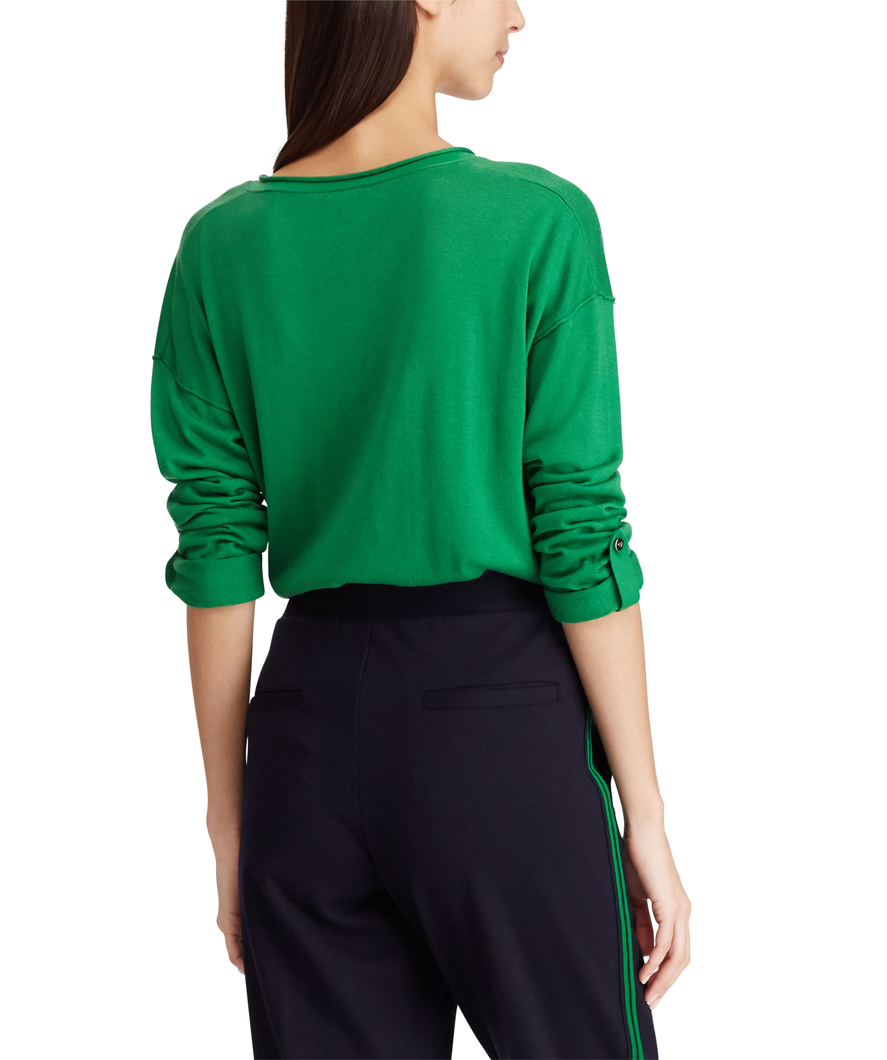 Stickad tröja från Lauren Ralph Lauren i en härlig grön färg. Avslappnad passform, v-ringad med rullad kant och ribbad mudd vid plaggslut. Ärmar uppvikta till en trekvartsläng som fästs med en silverfärgad knapp.