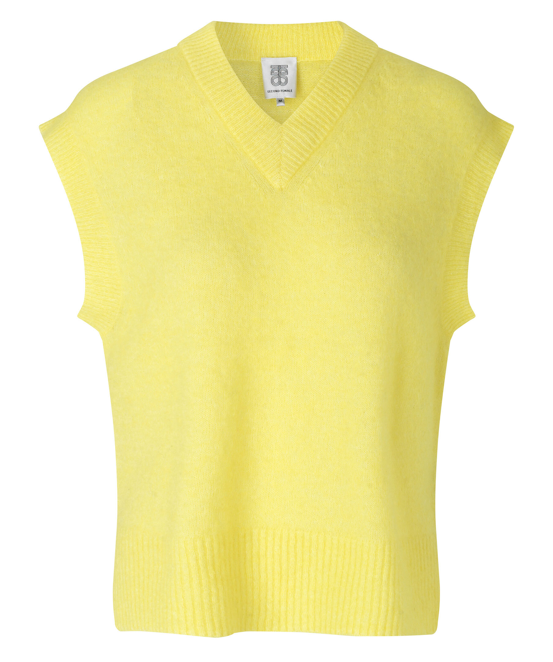 Stickad gul väst från Second Female. V-ringad. Ribbstickad halsringning, ärm- Plaggslut. Tillverkad i mohair och ull blandning.