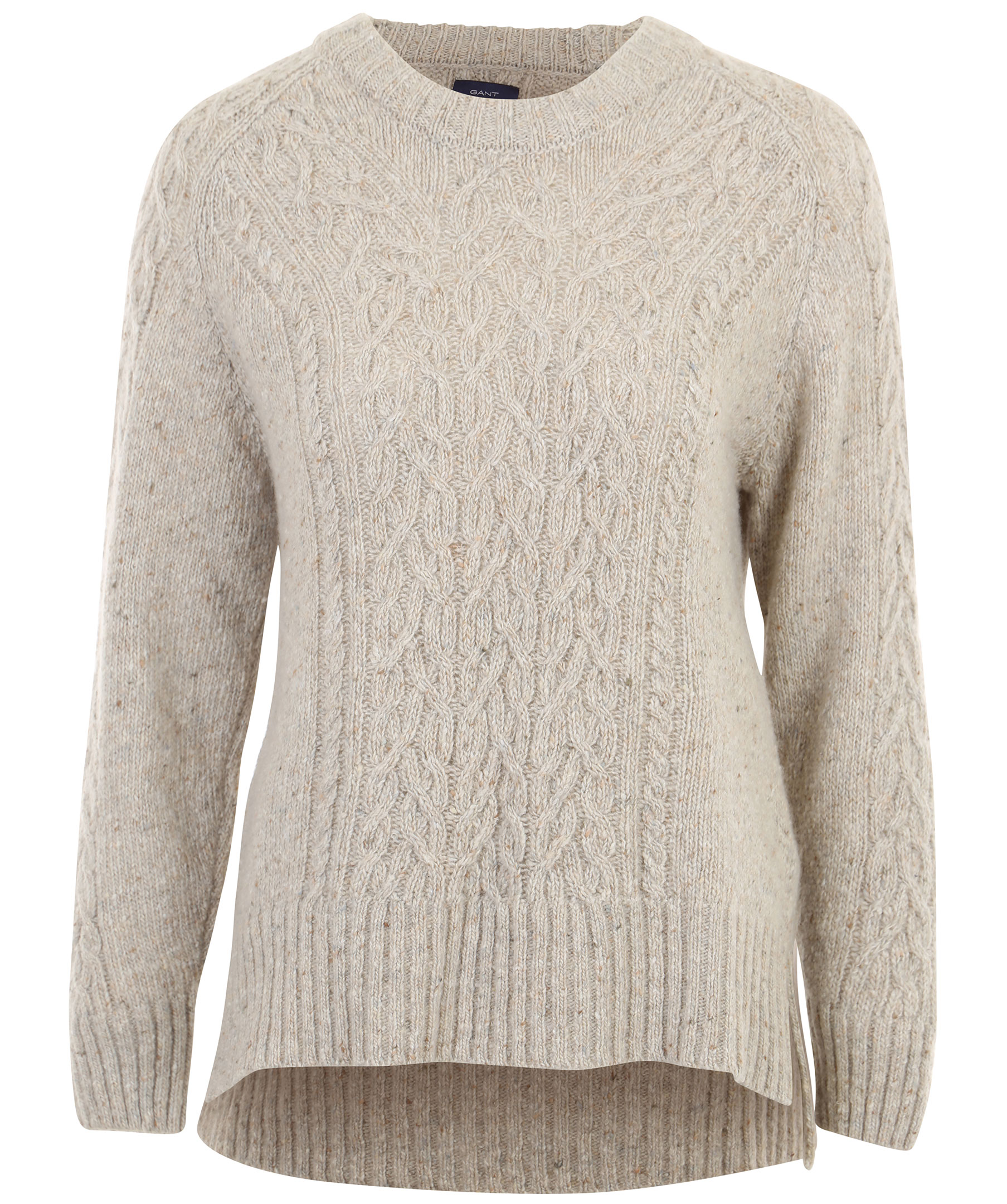 Grovt kabelstickad stickad tröja från Gant. Rundad halsringning och ribbade muddar i ärmslut och plaggslut. Korta slitsar i sidorna och längre bak än fram. Tillverkad i ullblandning.