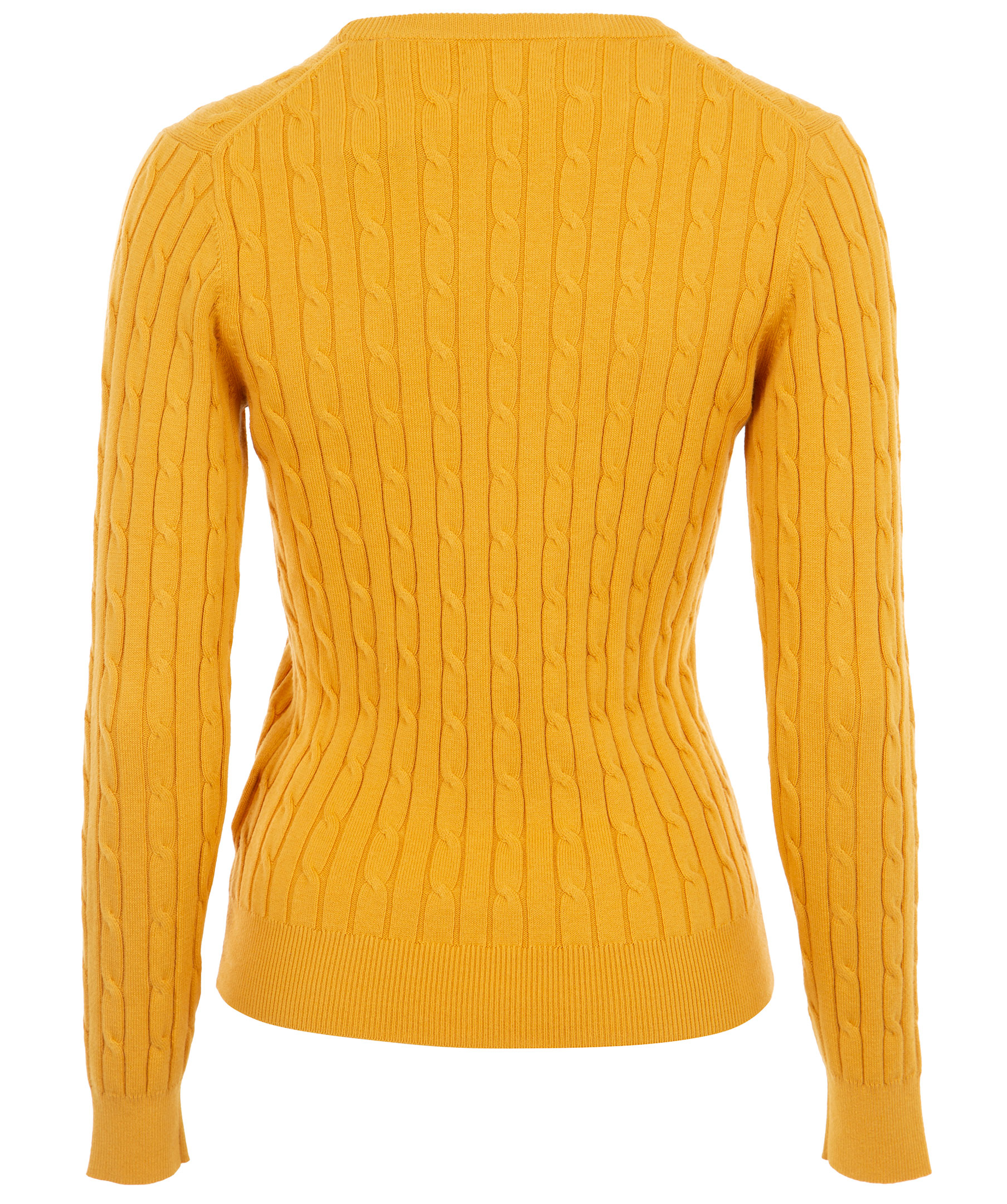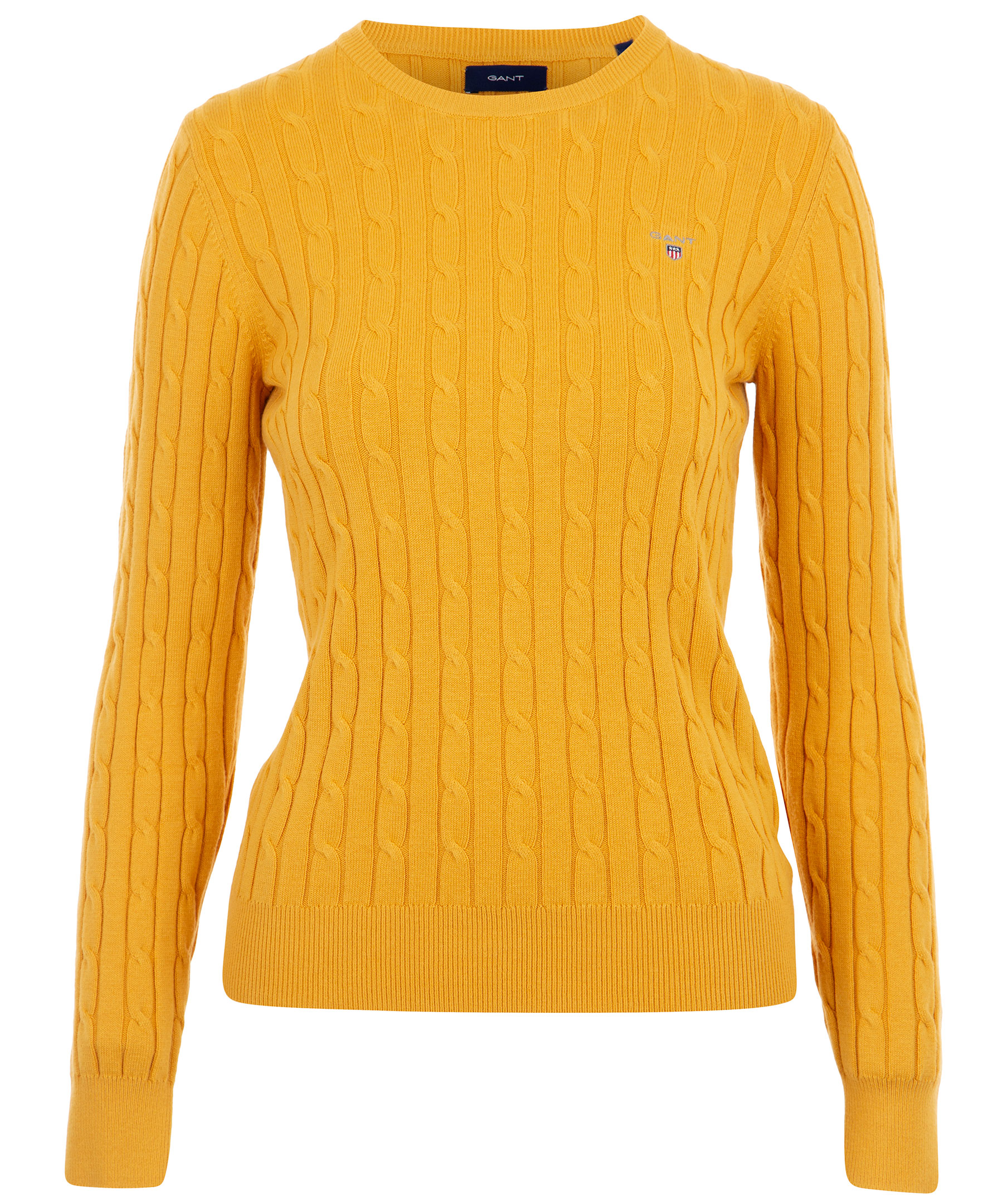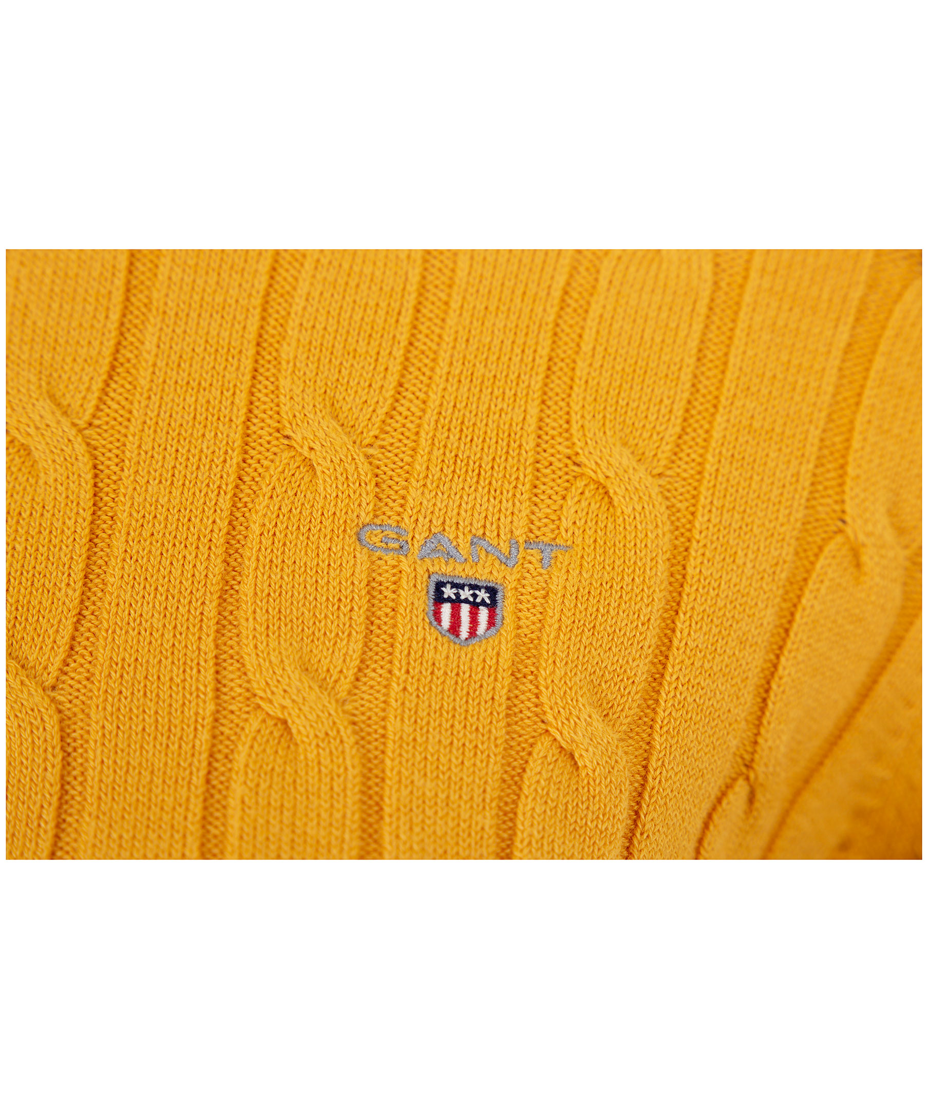 Gul kabelstickad tröja från Gant. Liten broderad logotyp på vänster bröst. Ribbstickade muddar vid halsring, ärm och plagg slut. Tillverkad i mjuk bomullsmix.