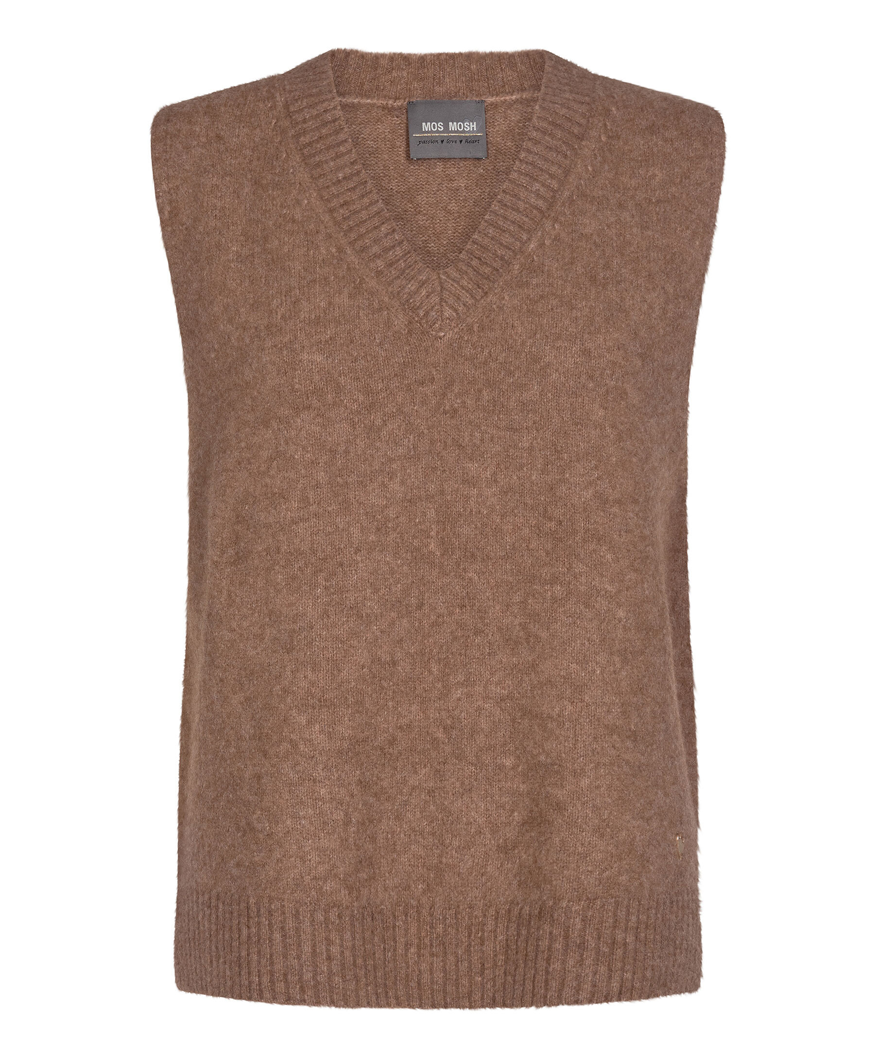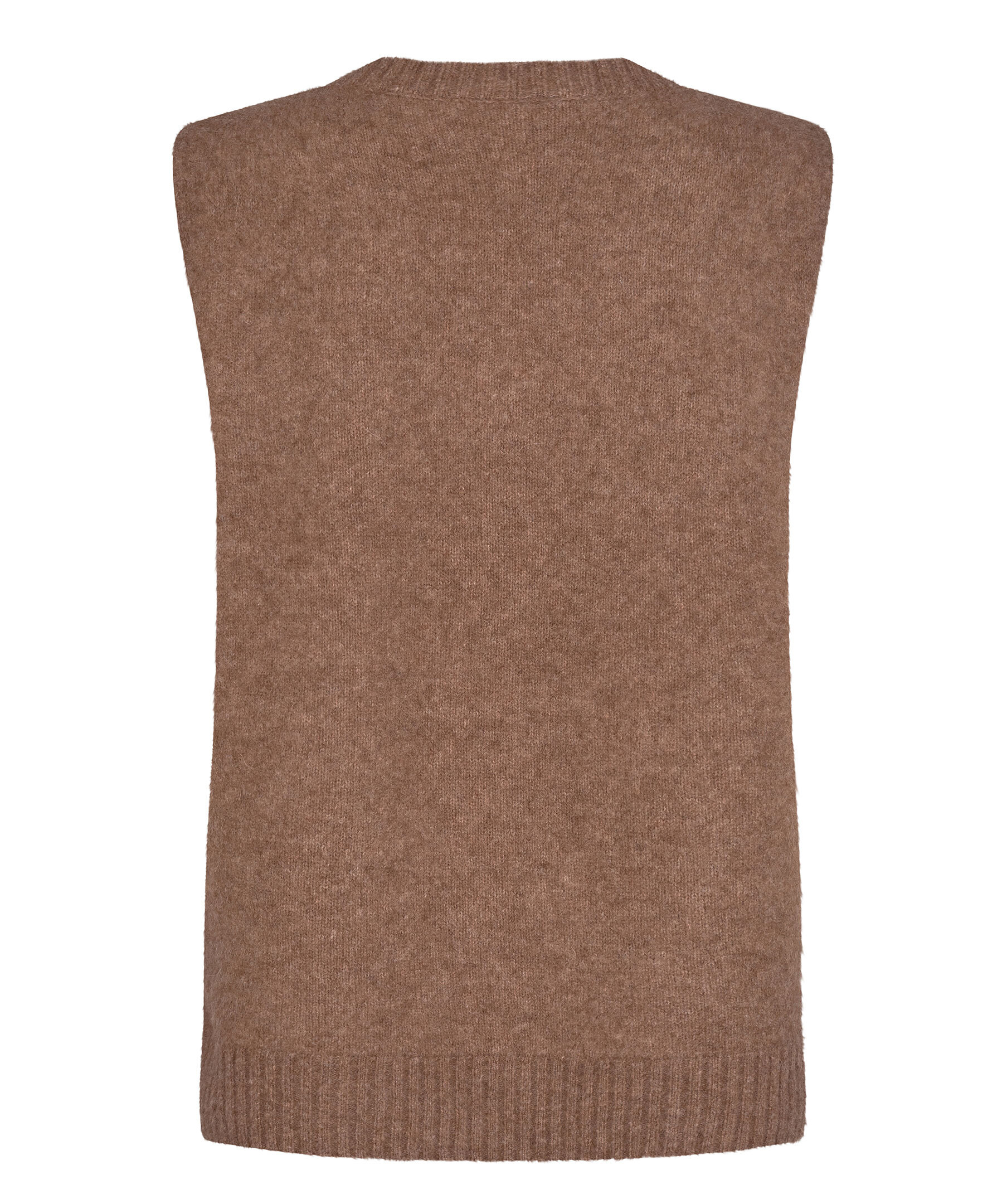 Brun stickad slipover i en normal passform från Mos Mosh. Västen är gjord i en ullblandning och har en snygg v-ringad hals samt ribbstickade muddar.