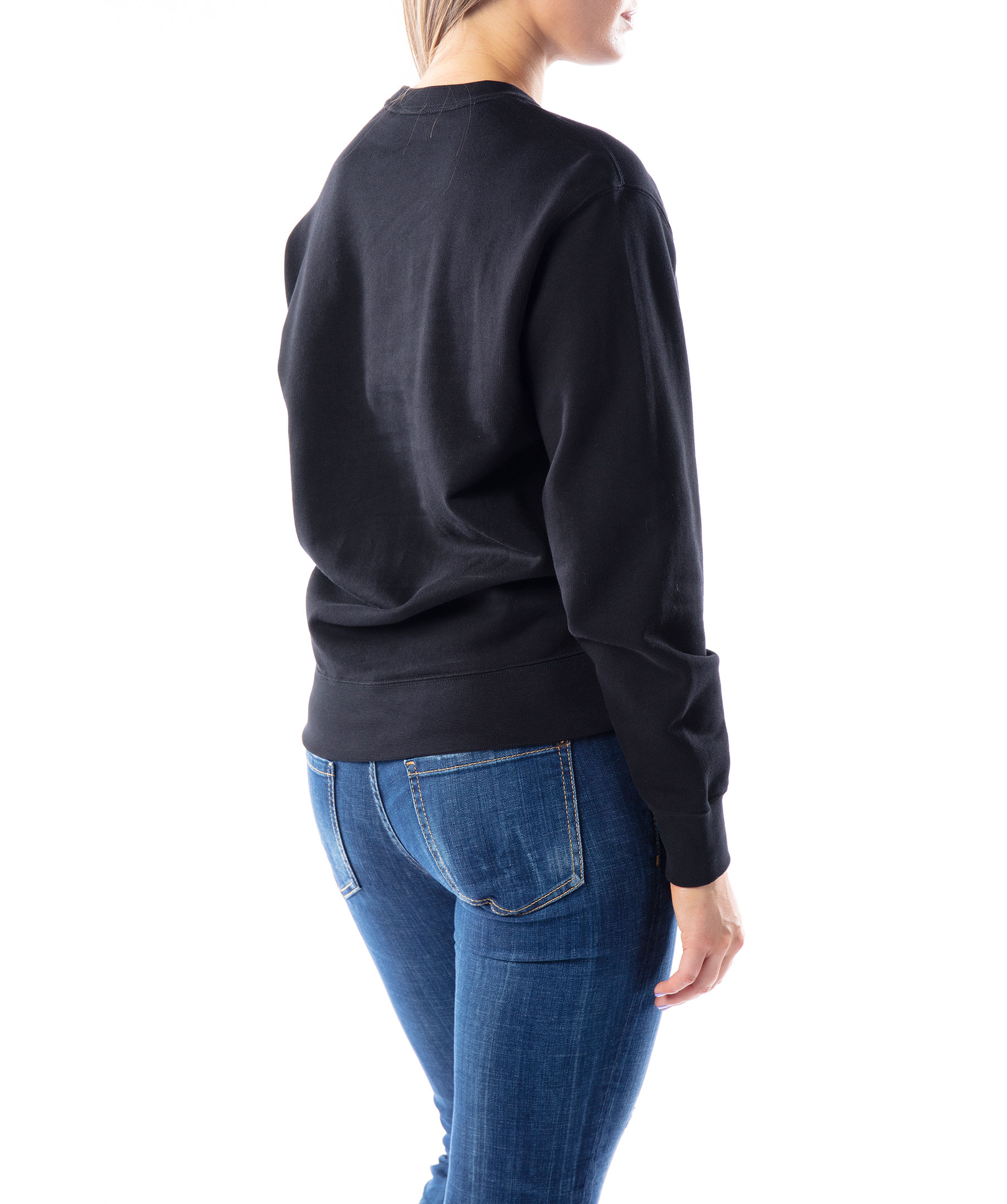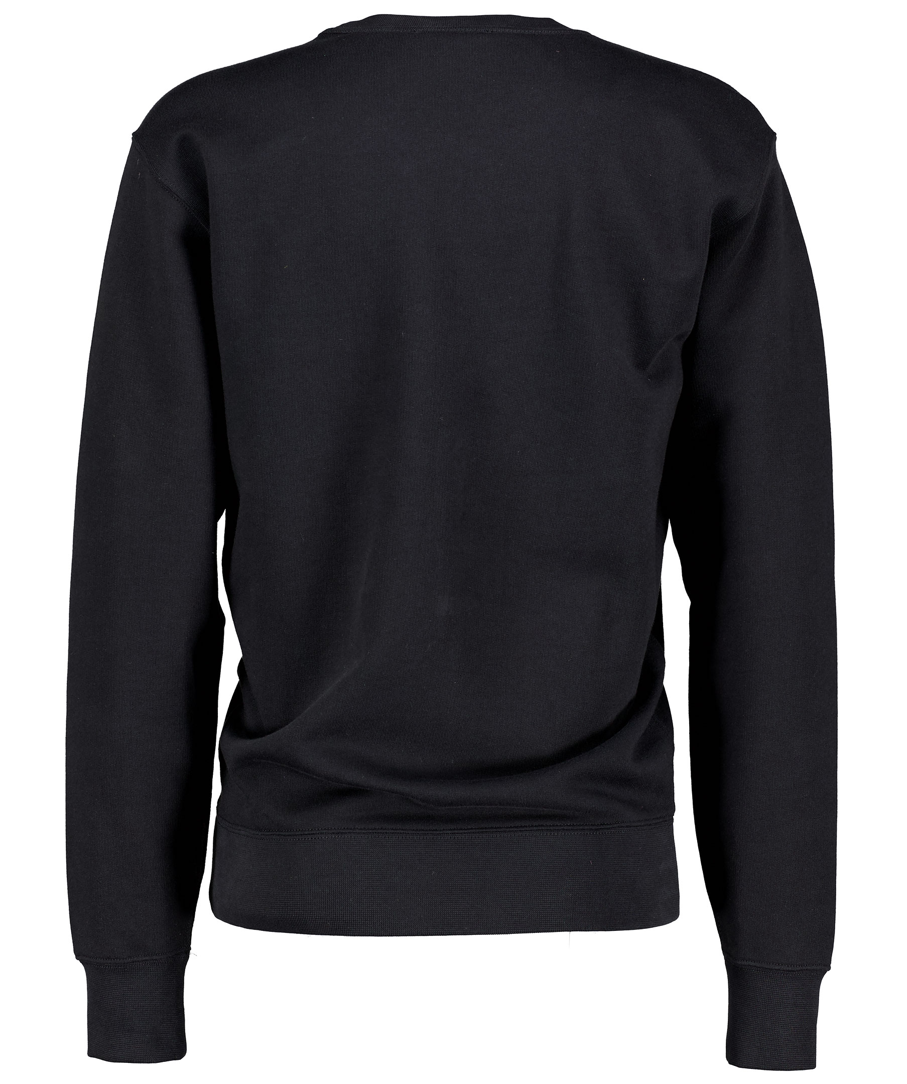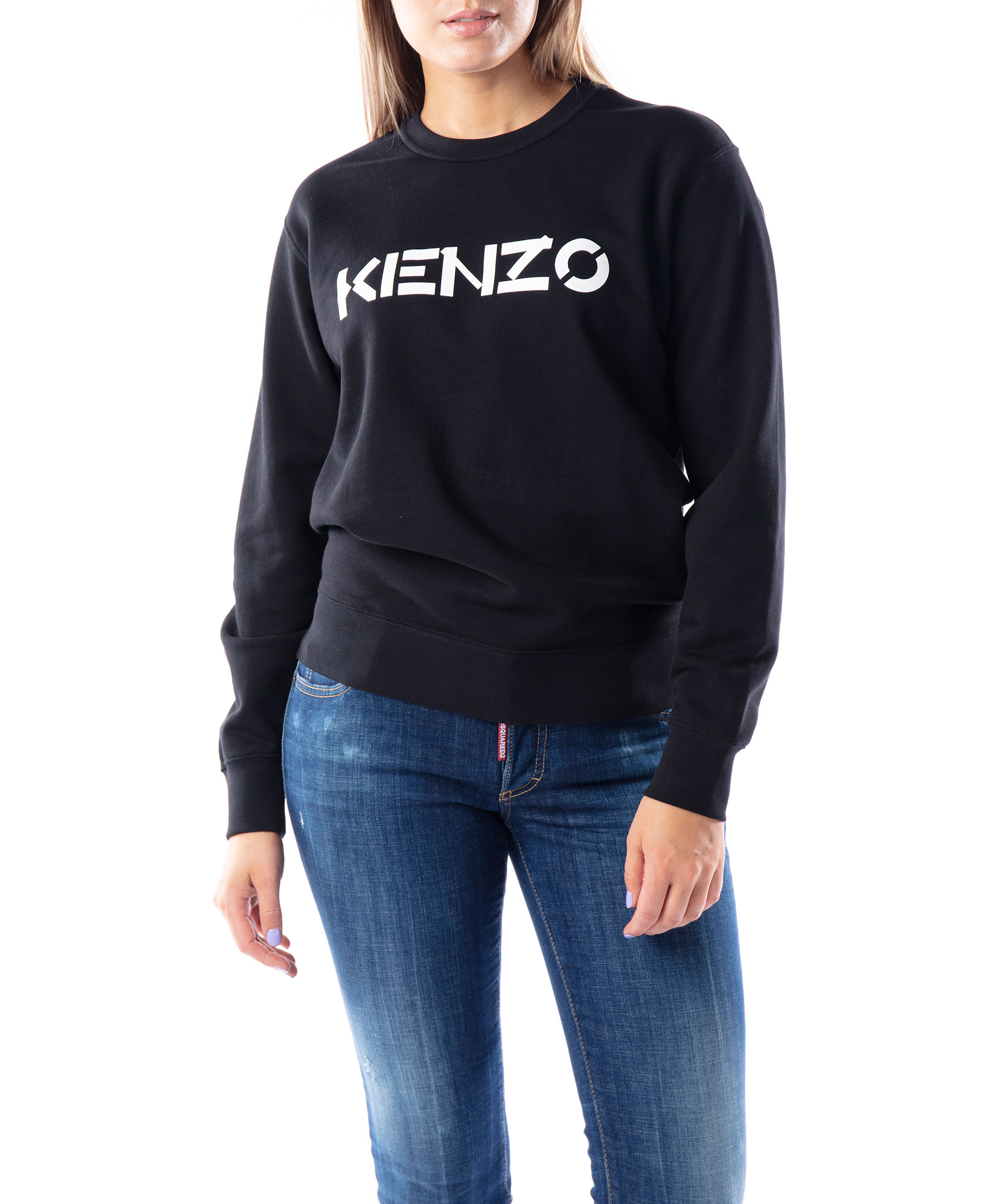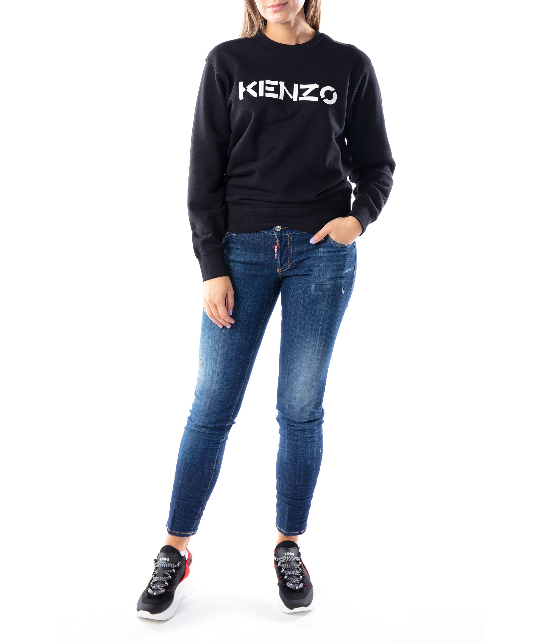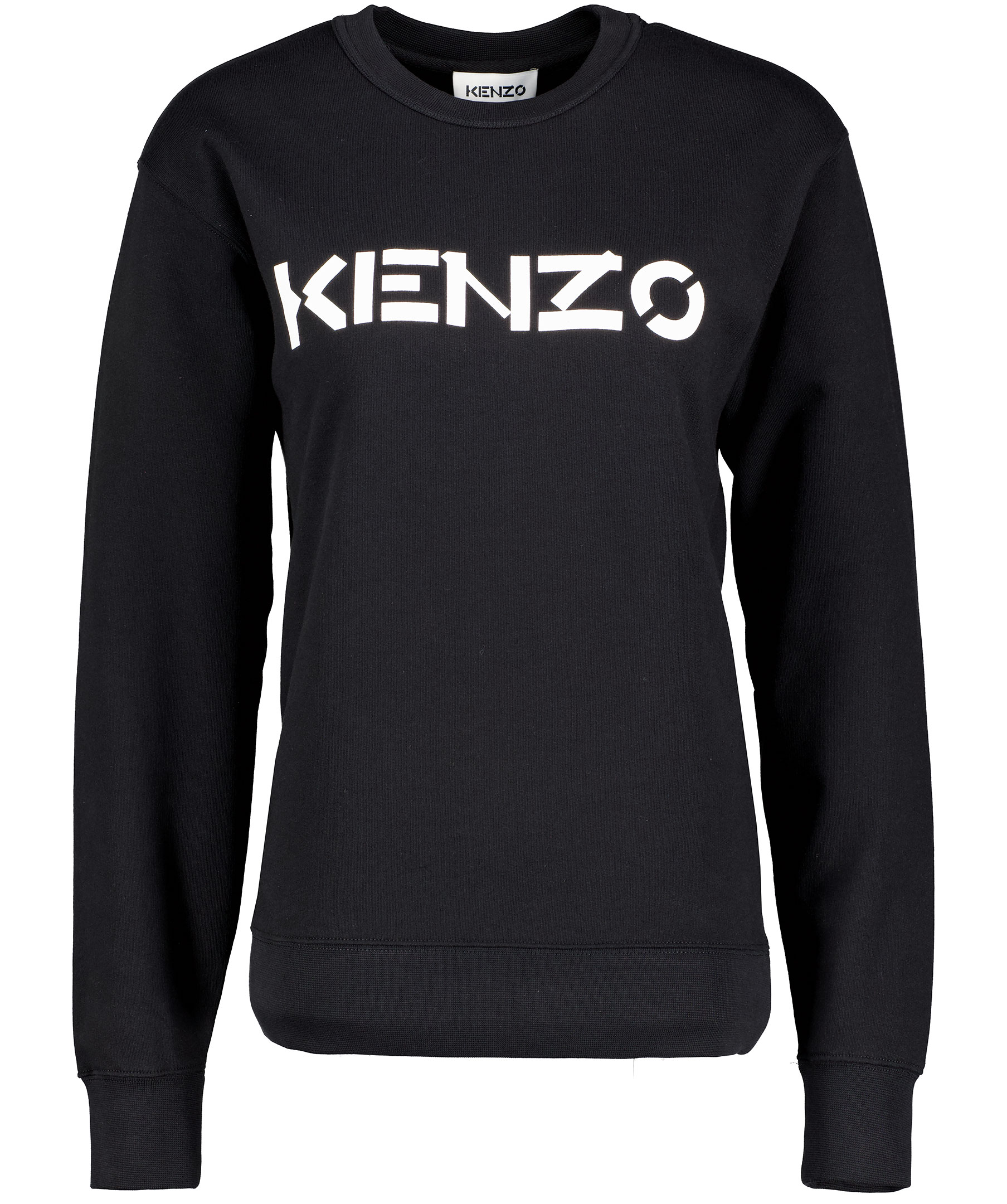 Svart sweatshirt i 100% bomull från Kenzo. Logotyp i vitt över bröstet och har en rundad halsringning. Muddar i ärmslut och plaggslut. Modellen är 175 cm lång och bär storlek S.