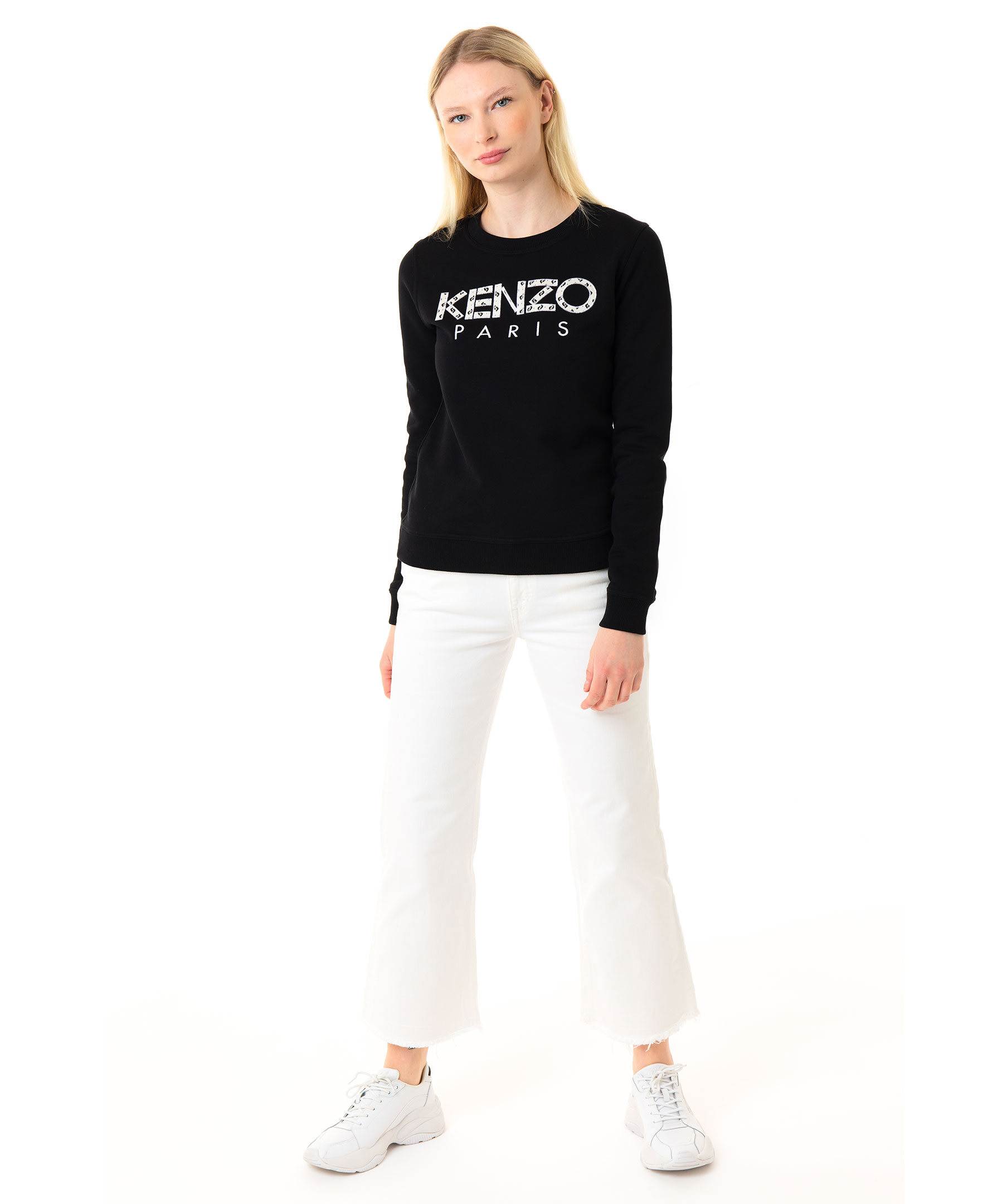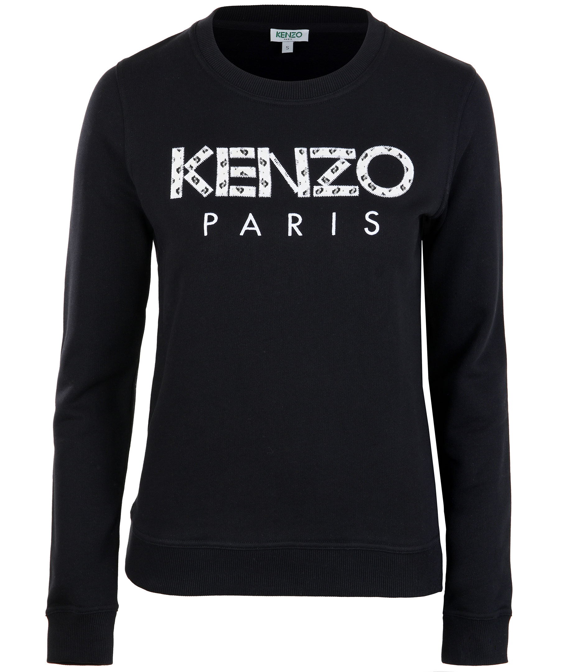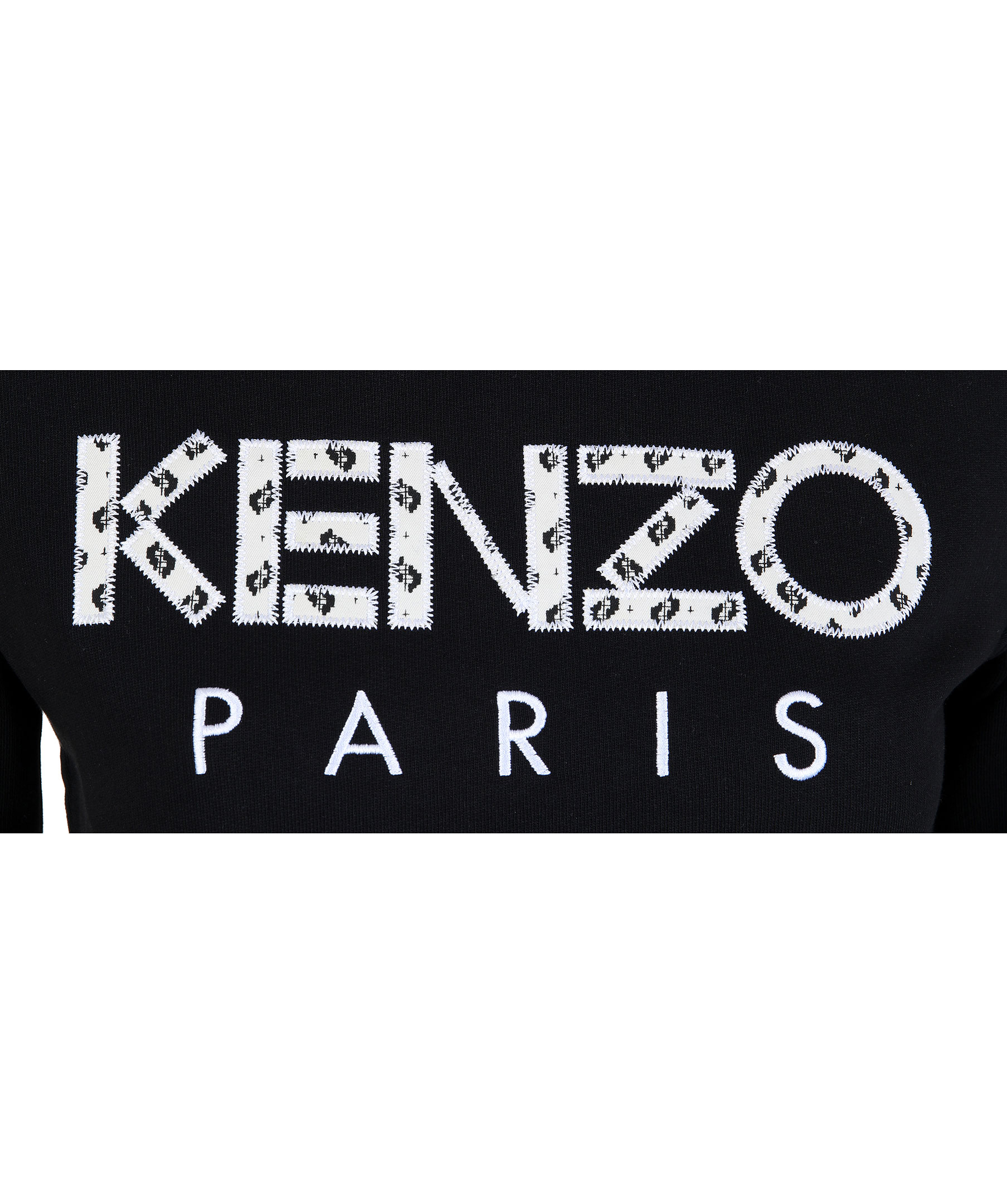 Svart sweatshirt i normal passform från Kenzo. Gjord helt i bomull. Stor broderad logga med mönstrad tygapplikation på bröstet, rundad hals och muddar i ärm och plaggslut. Modellen är 174 cm lång och bär storlek S.