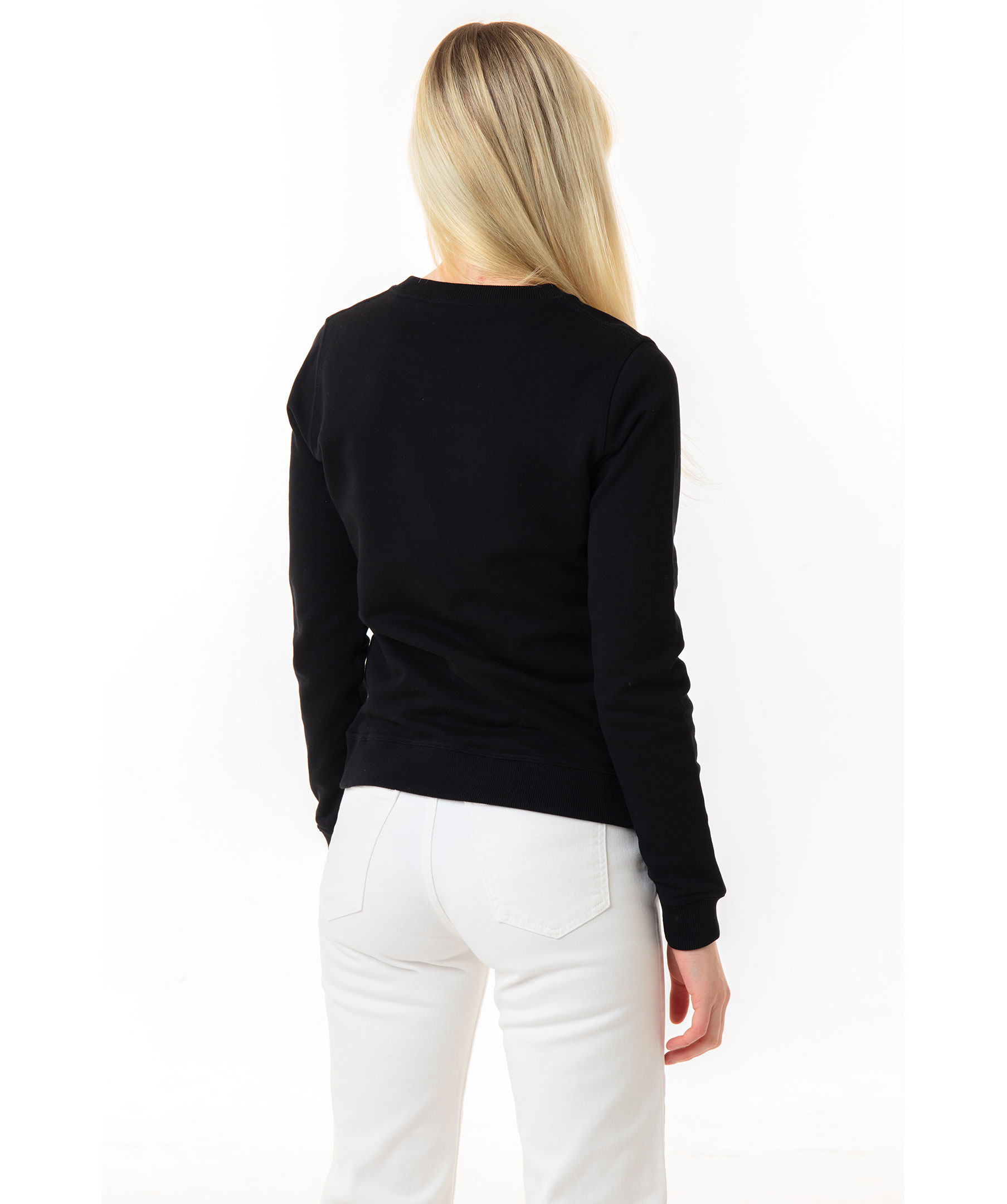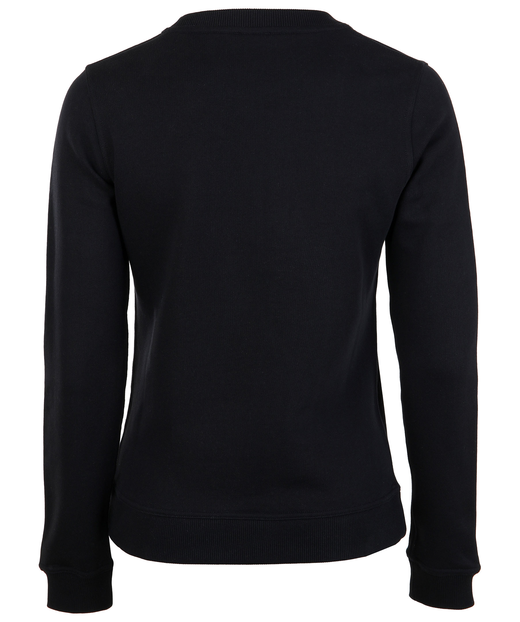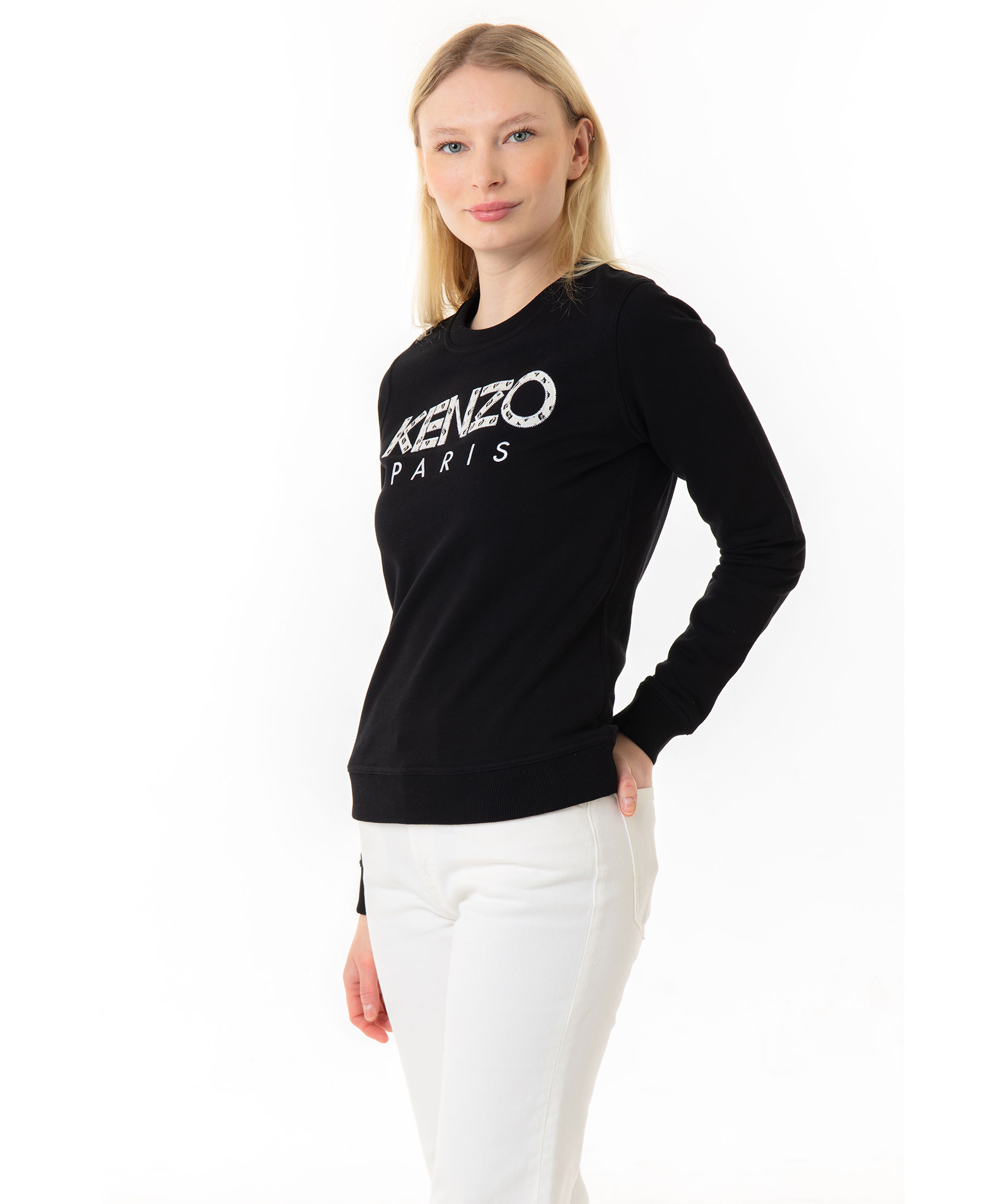 Svart sweatshirt i normal passform från Kenzo. Gjord helt i bomull. Stor broderad logga med mönstrad tygapplikation på bröstet, rundad hals och muddar i ärm och plaggslut. Modellen är 174 cm lång och bär storlek S.
