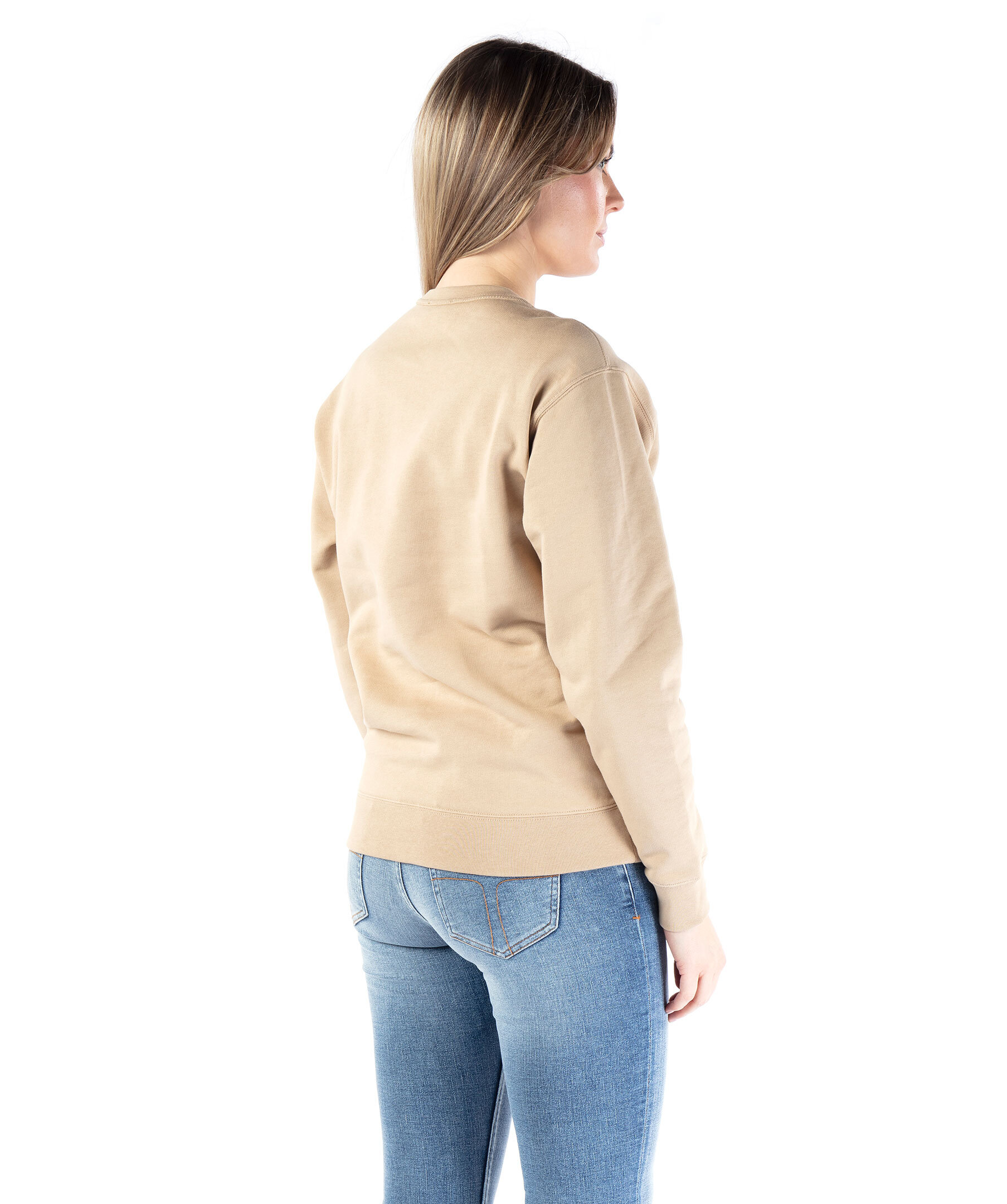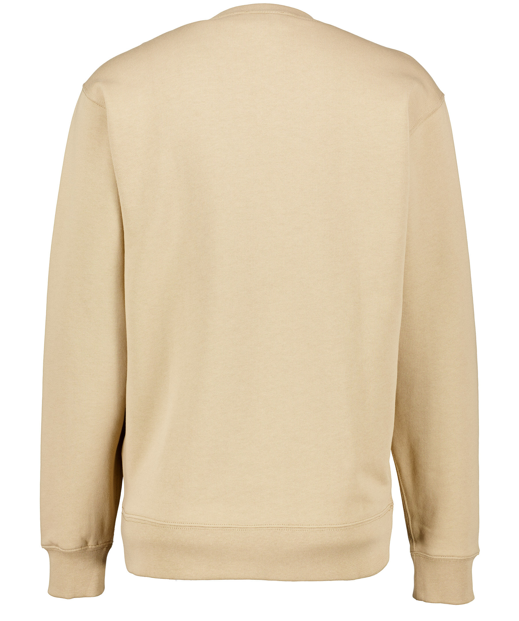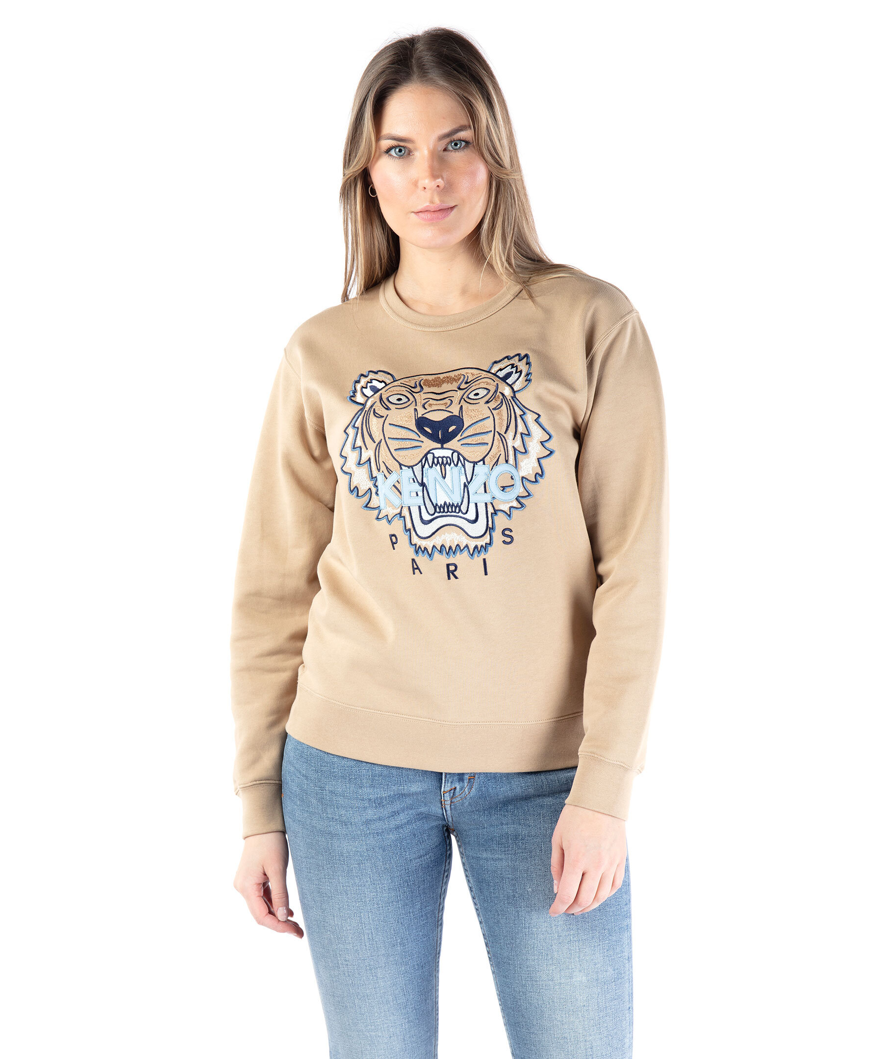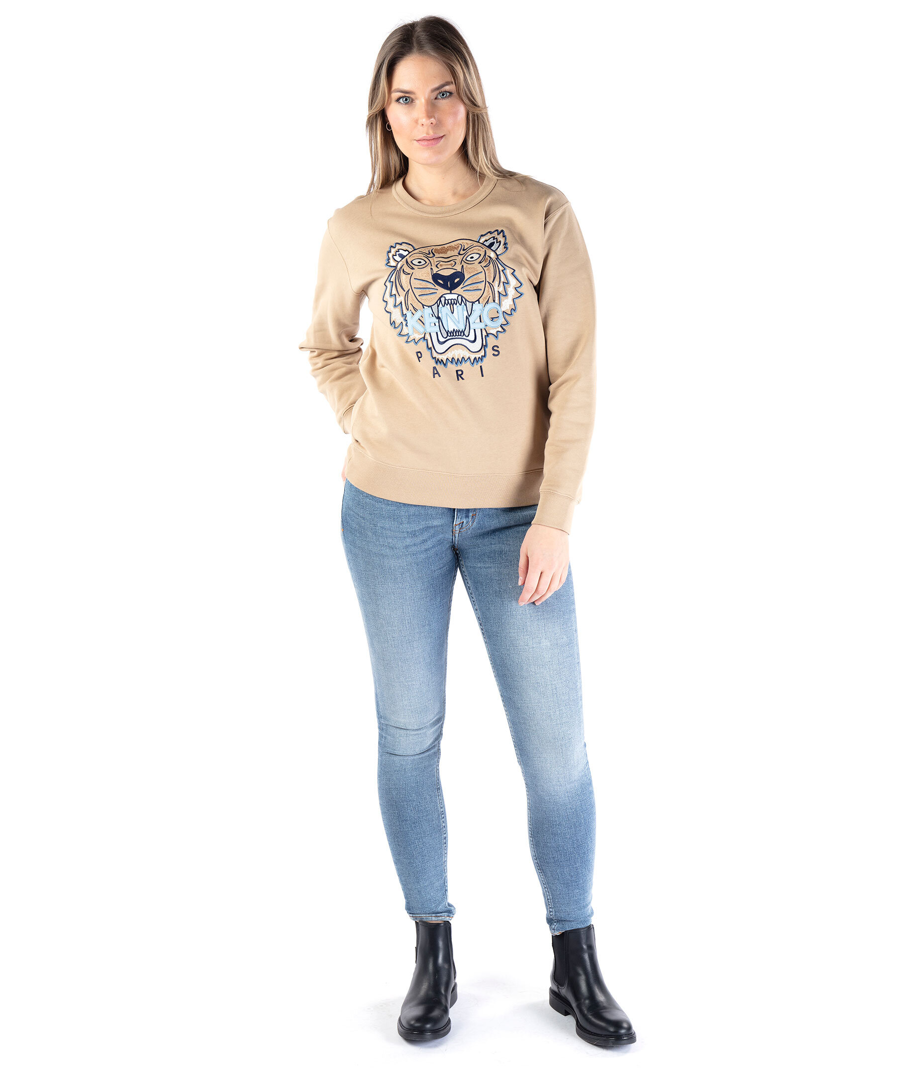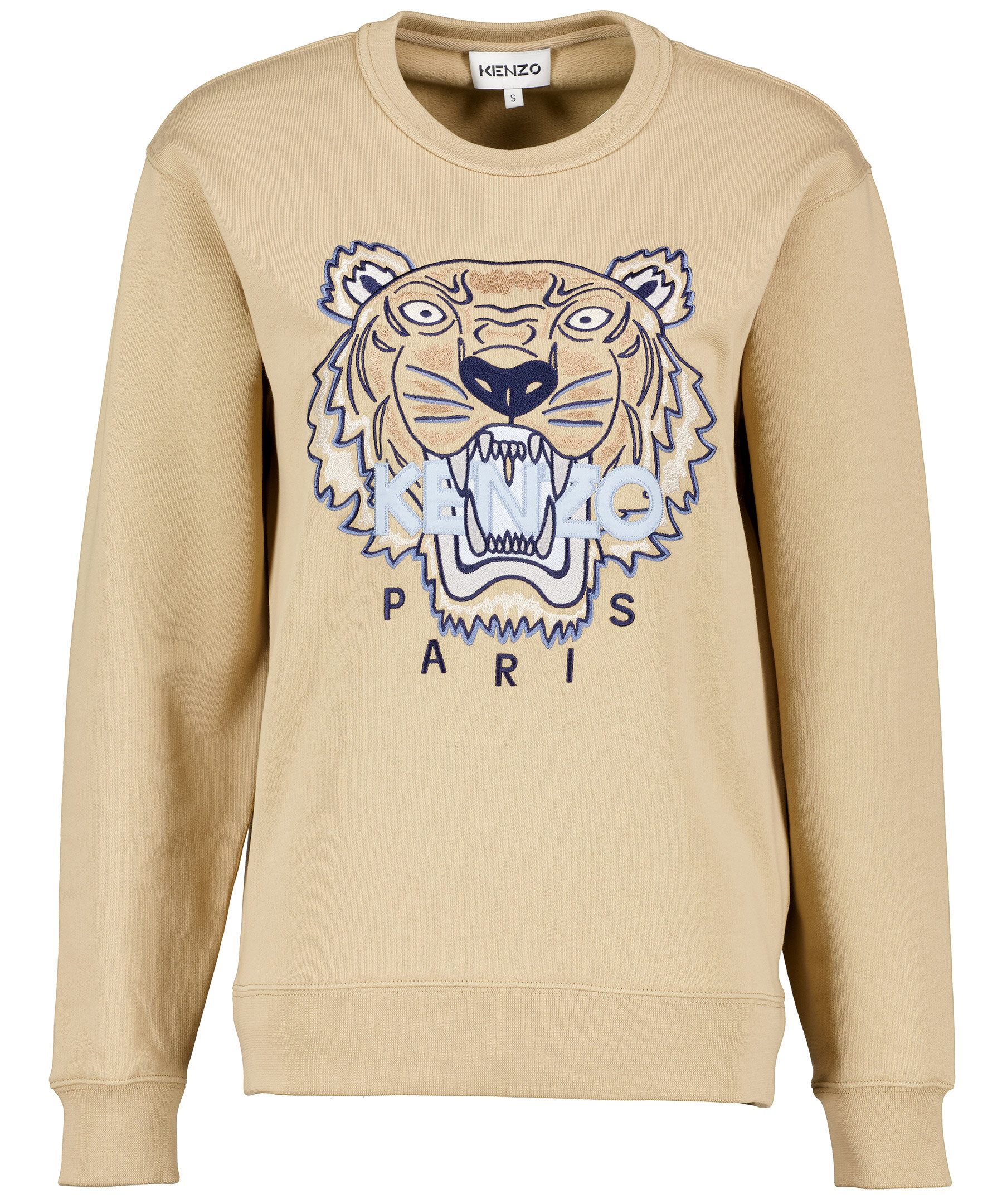 Beige sweatshirt från Kenzo. Stor broderad tiger och logotyp på bröstet i mörkblått, ljusblått och beige. Rundad hals och muddar i ärmslut och plaggslut samt runt halsringningen. Tillverkad i bomull. Modellen är 175 cm lång och bär storlek S.