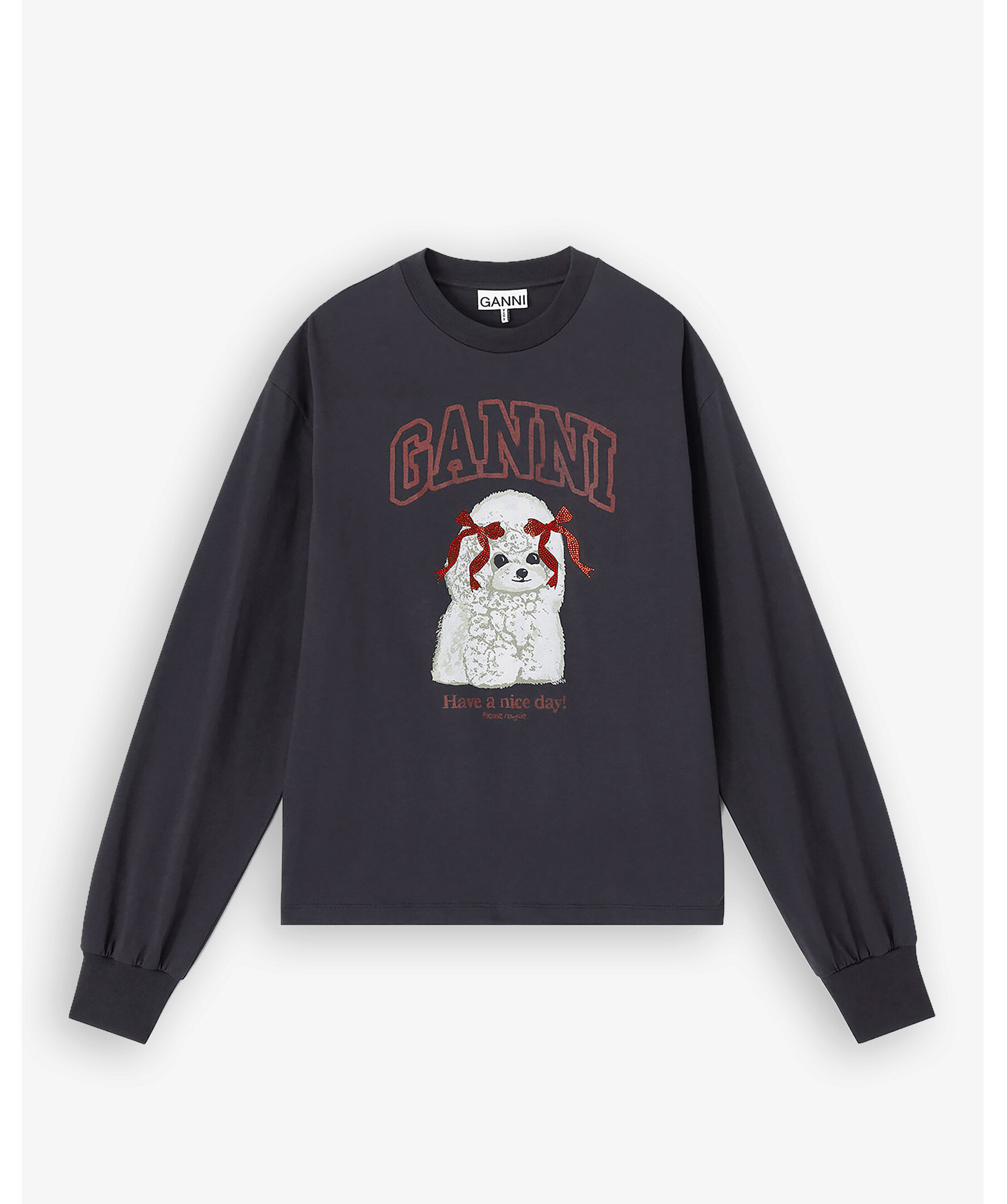 Mörkgrå långärmad tröja från GANNI med lekfullt pudel‑/hundvalpstryck och GANNI‑logotyp. Tröjan har en klassisk rund halsringning och ribbade kanter vid ärmslut och nederkant, vilket skapar en avslappnad och modern silhuett. Passformen är relaxed fit, vilket gör den perfekt för vardagsbruk med jeans, kjol eller till lager‑på‑lager‑look.