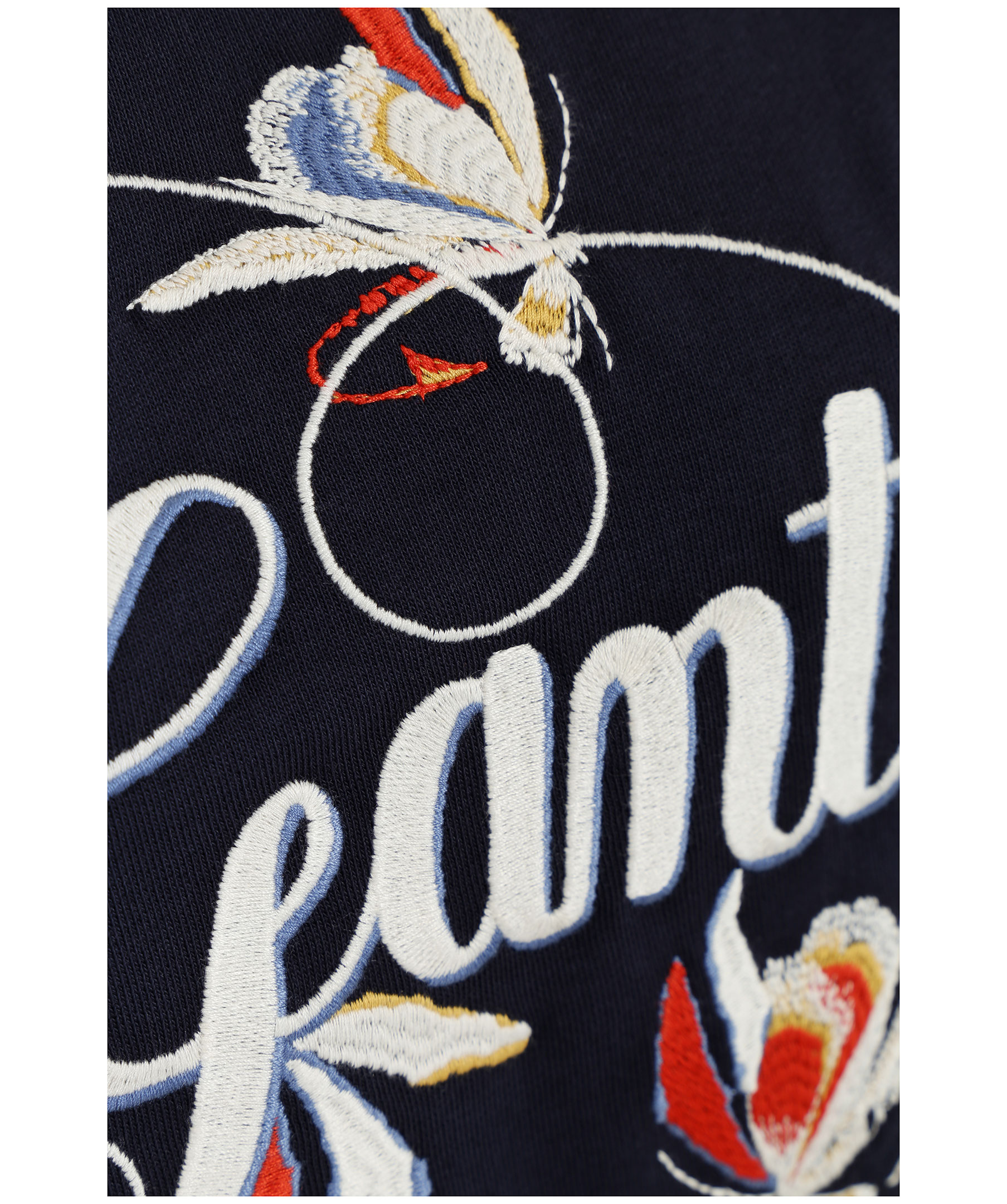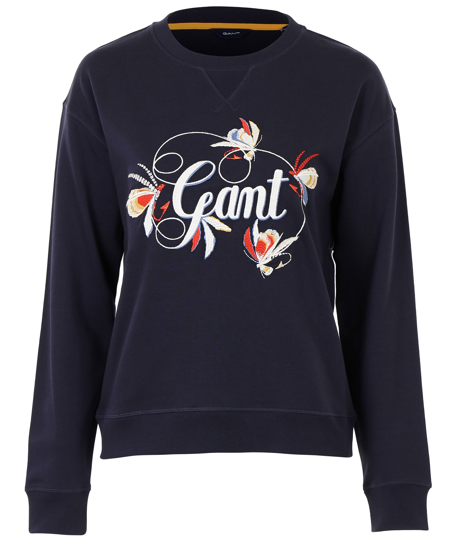 Marinblå tröja från Gant i 100% bomull. Stor brodyr på bröstet med fjärilar och Gant logga, ribbade muddar längst ner på ärmarna och längst ner i midjan.