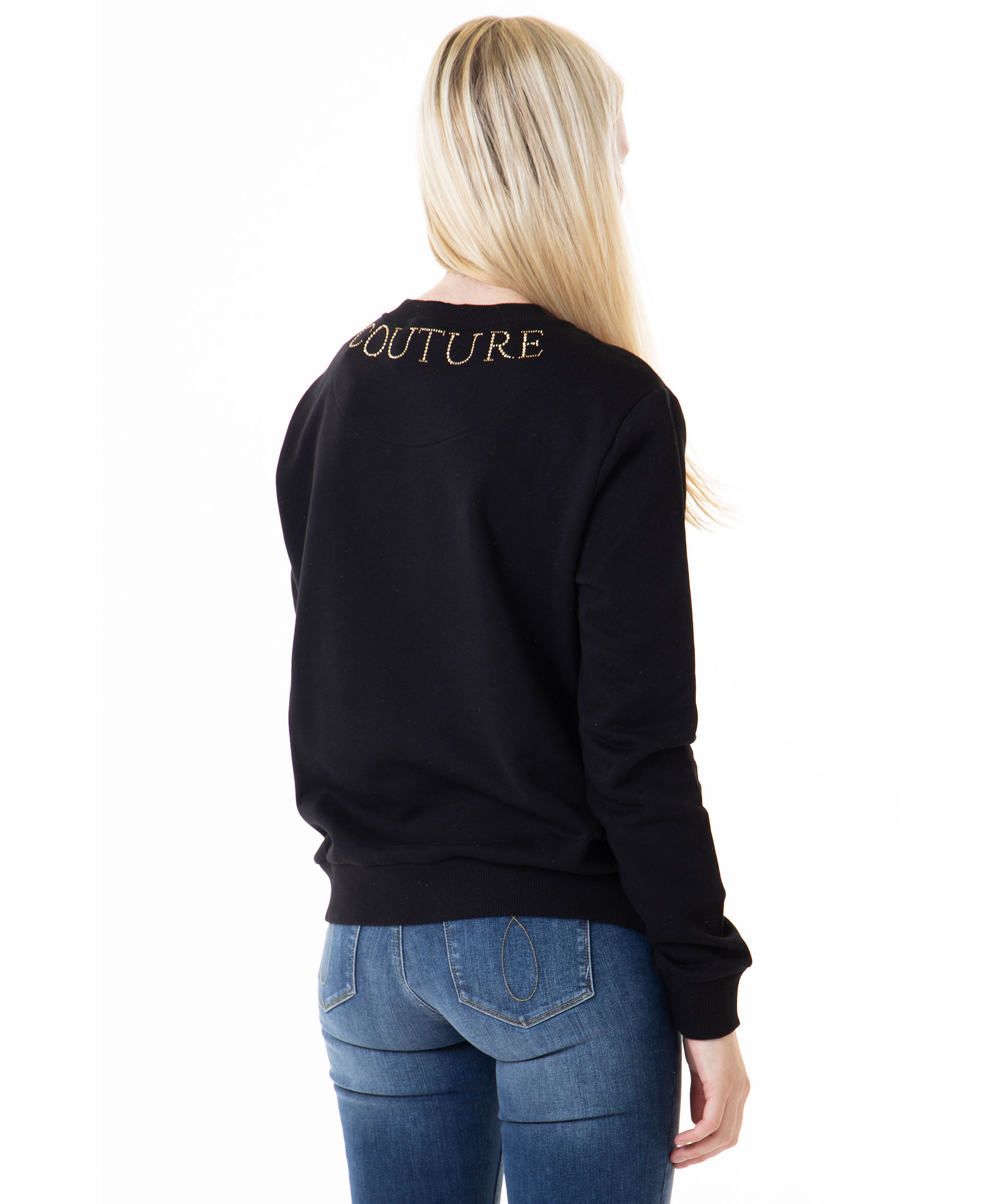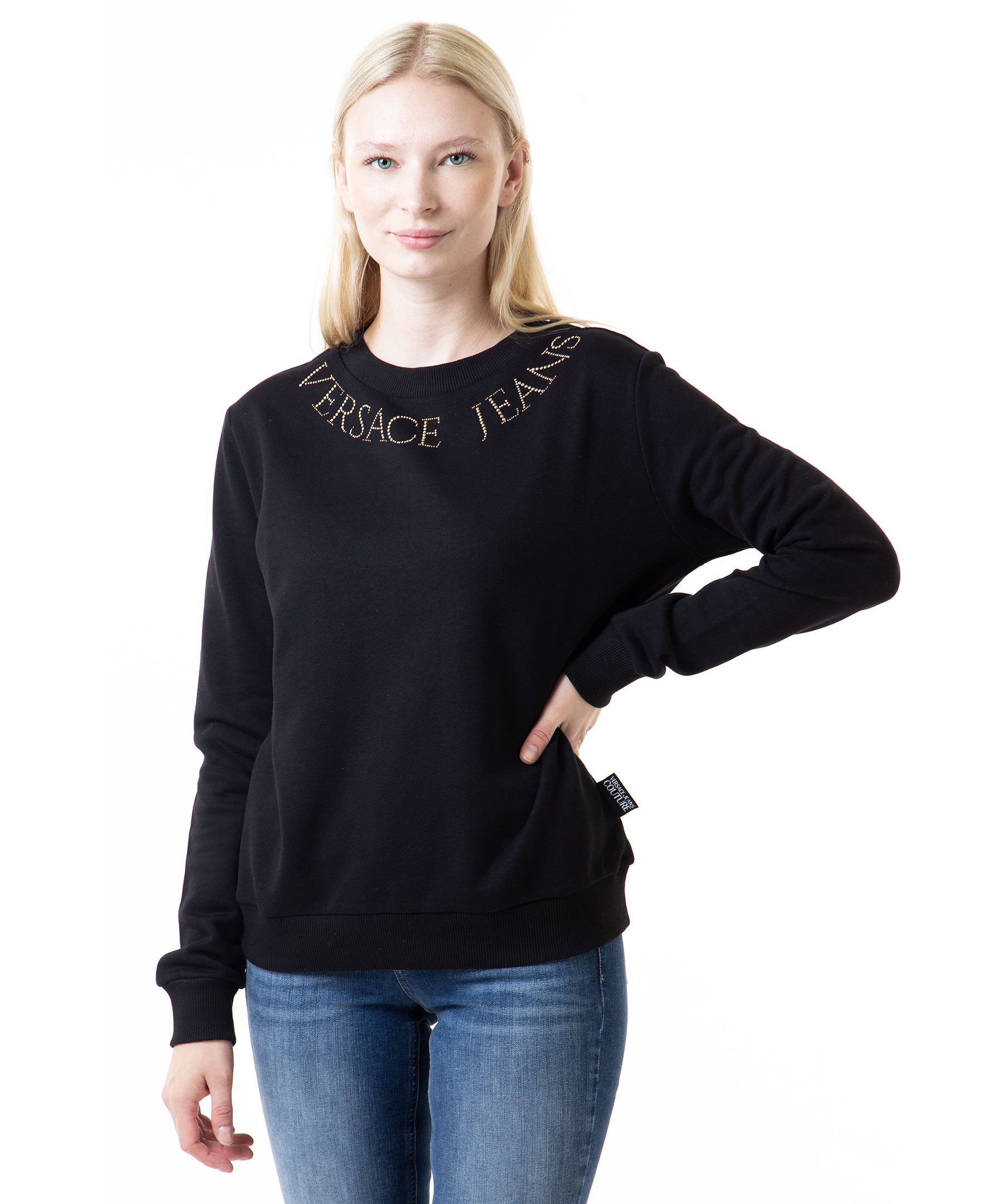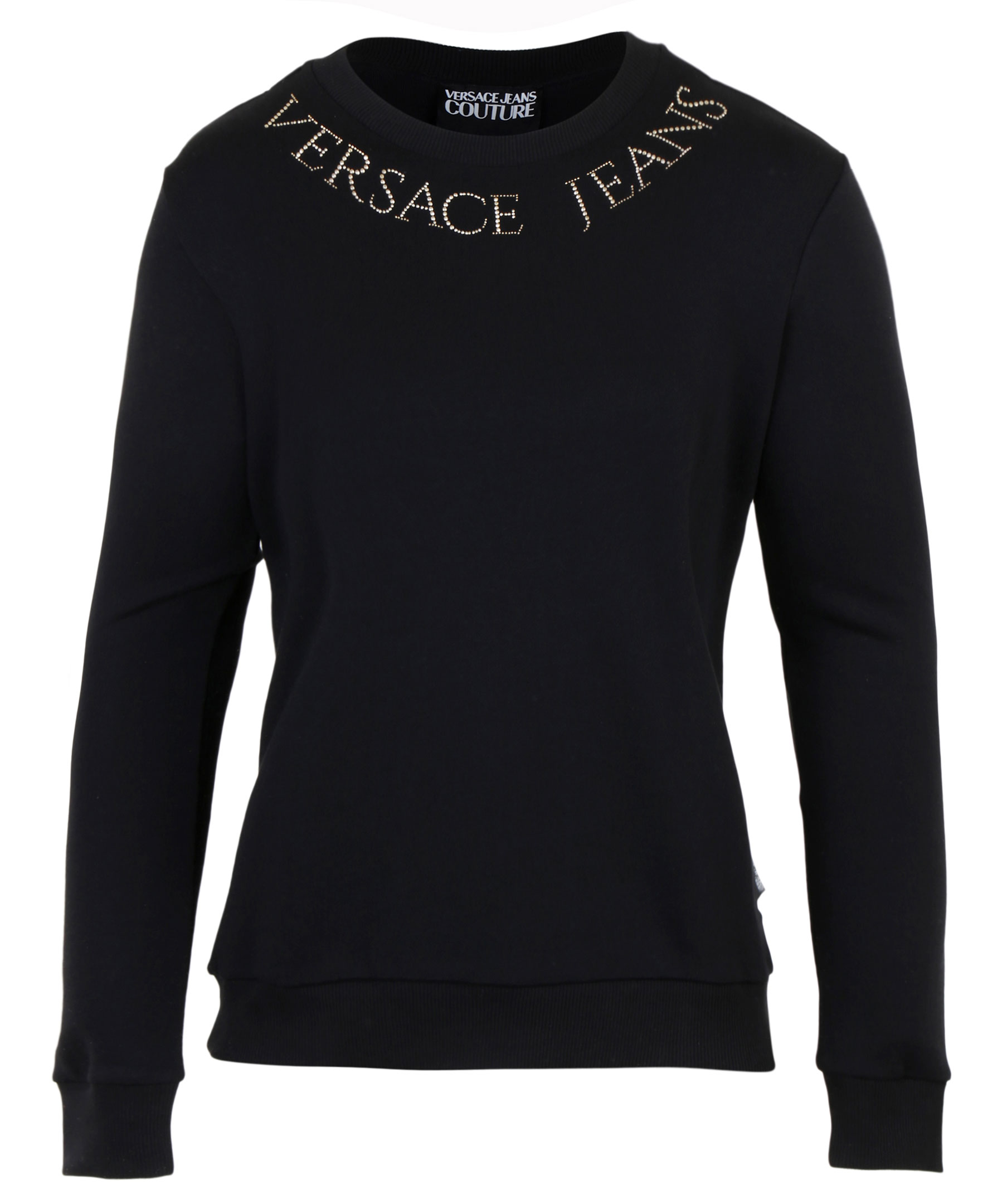 Svart sweatshirt från Versace Jeans Couture. Lätt oversizemodell. Guldfärgade stenar med text runt halsringningen. Rundad halsringning och ribbstickade muddar i ärm- och plaggslut. Gjord i 100% Bomull. Modellen är 173 cm lång och bär storlek S.