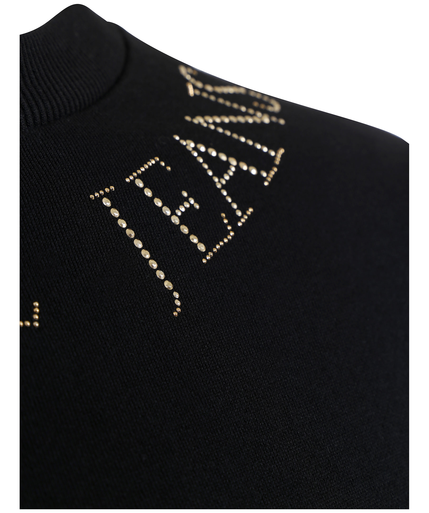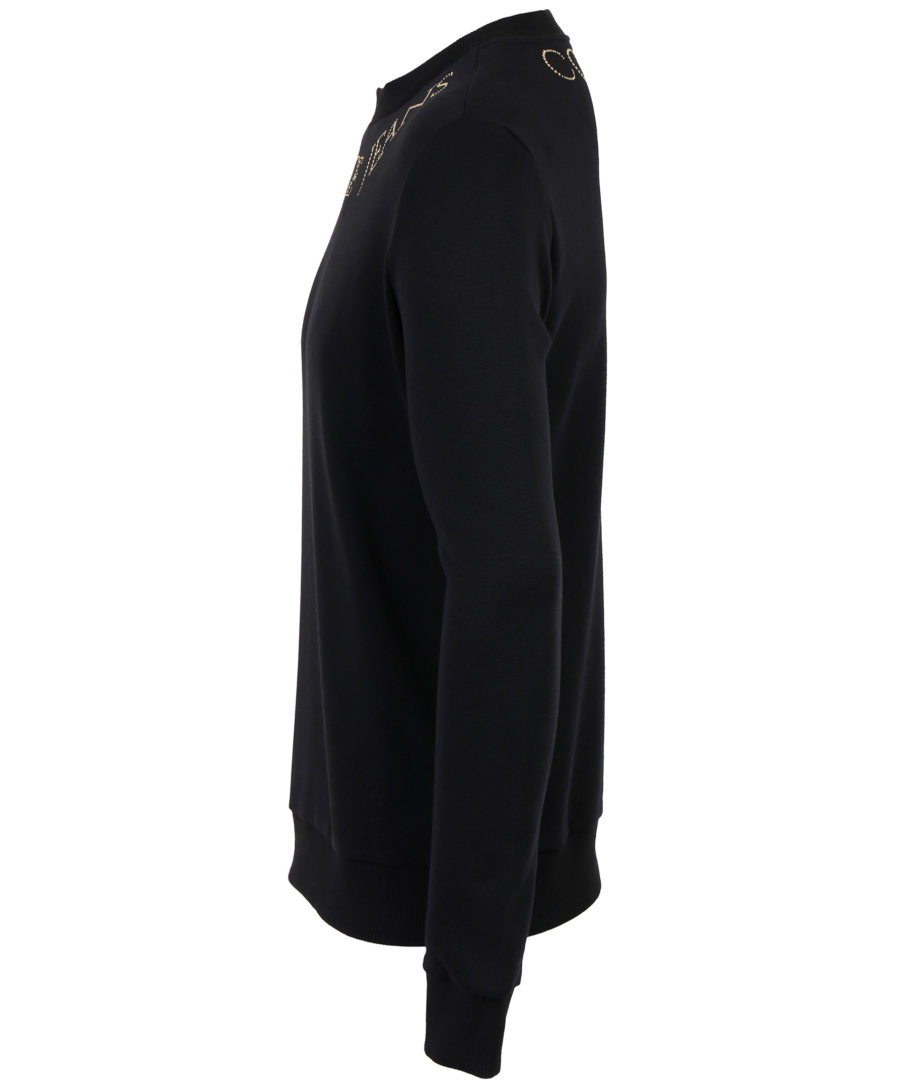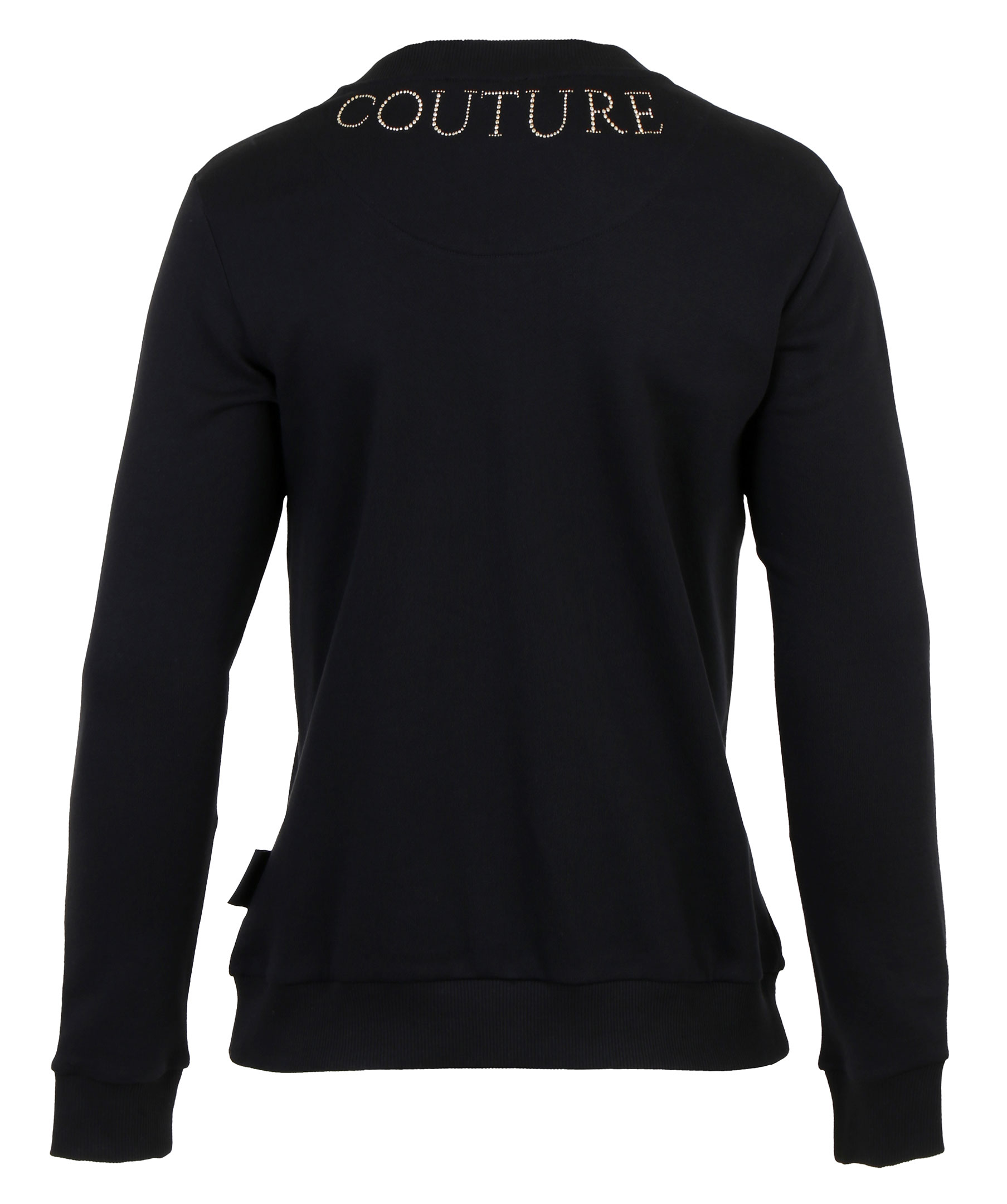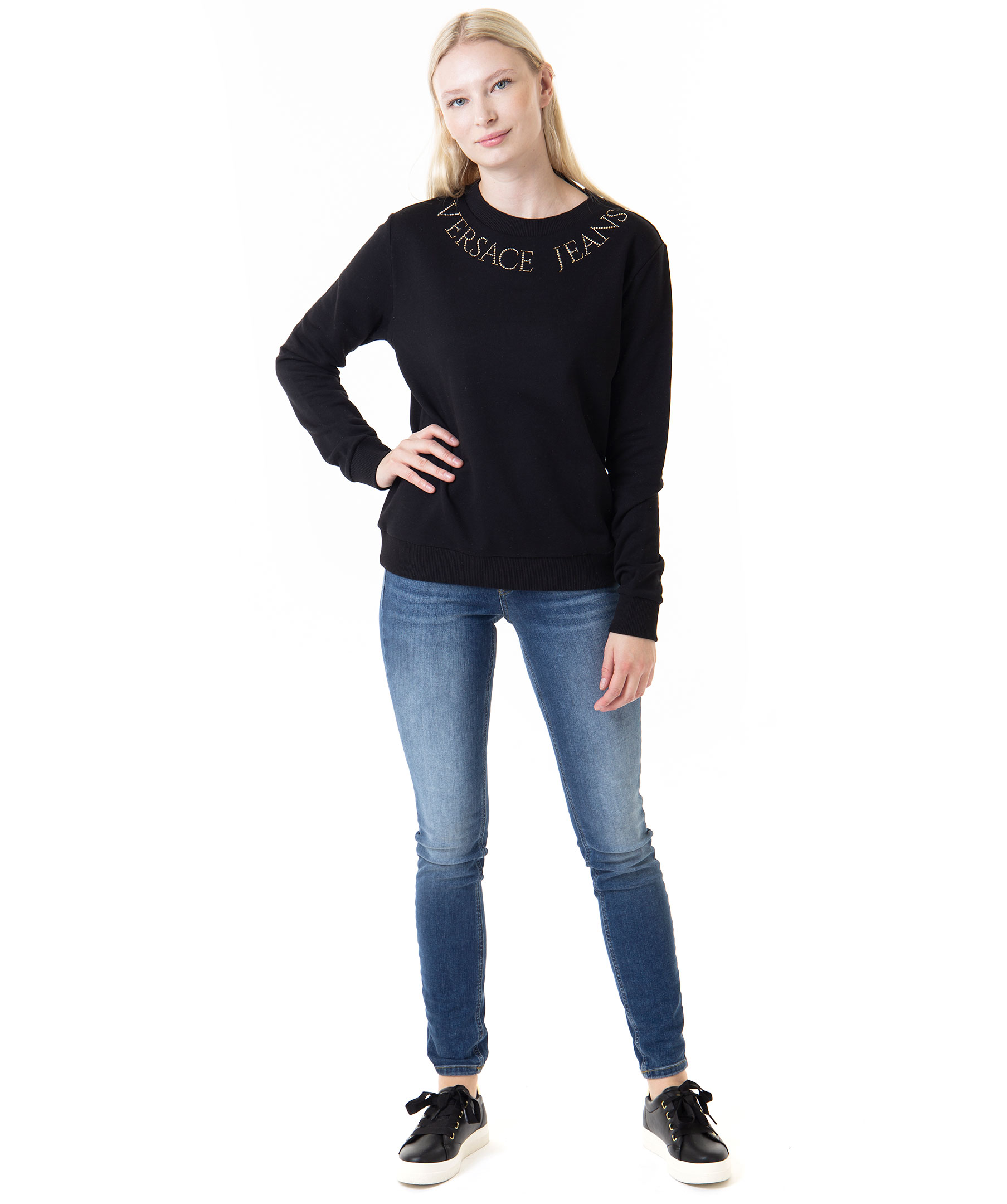 Svart sweatshirt från Versace Jeans Couture. Lätt oversizemodell. Guldfärgade stenar med text runt halsringningen. Rundad halsringning och ribbstickade muddar i ärm- och plaggslut. Gjord i 100% Bomull. Modellen är 173 cm lång och bär storlek S.