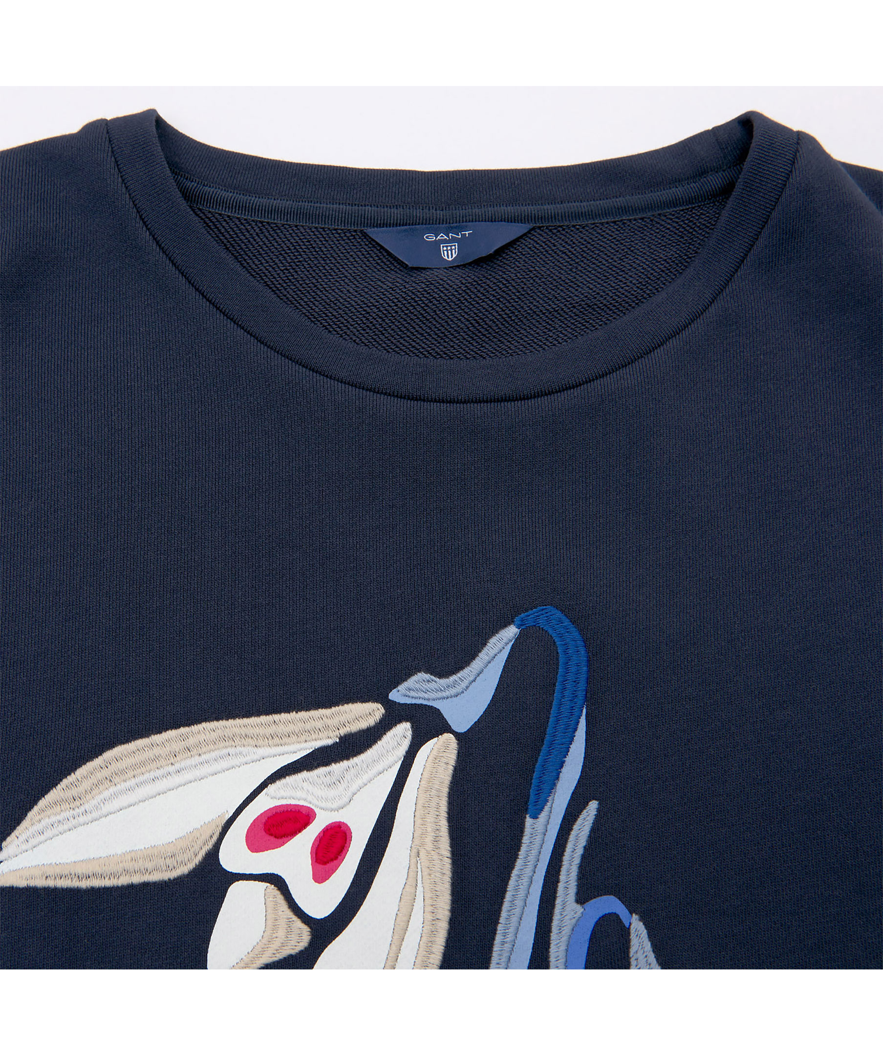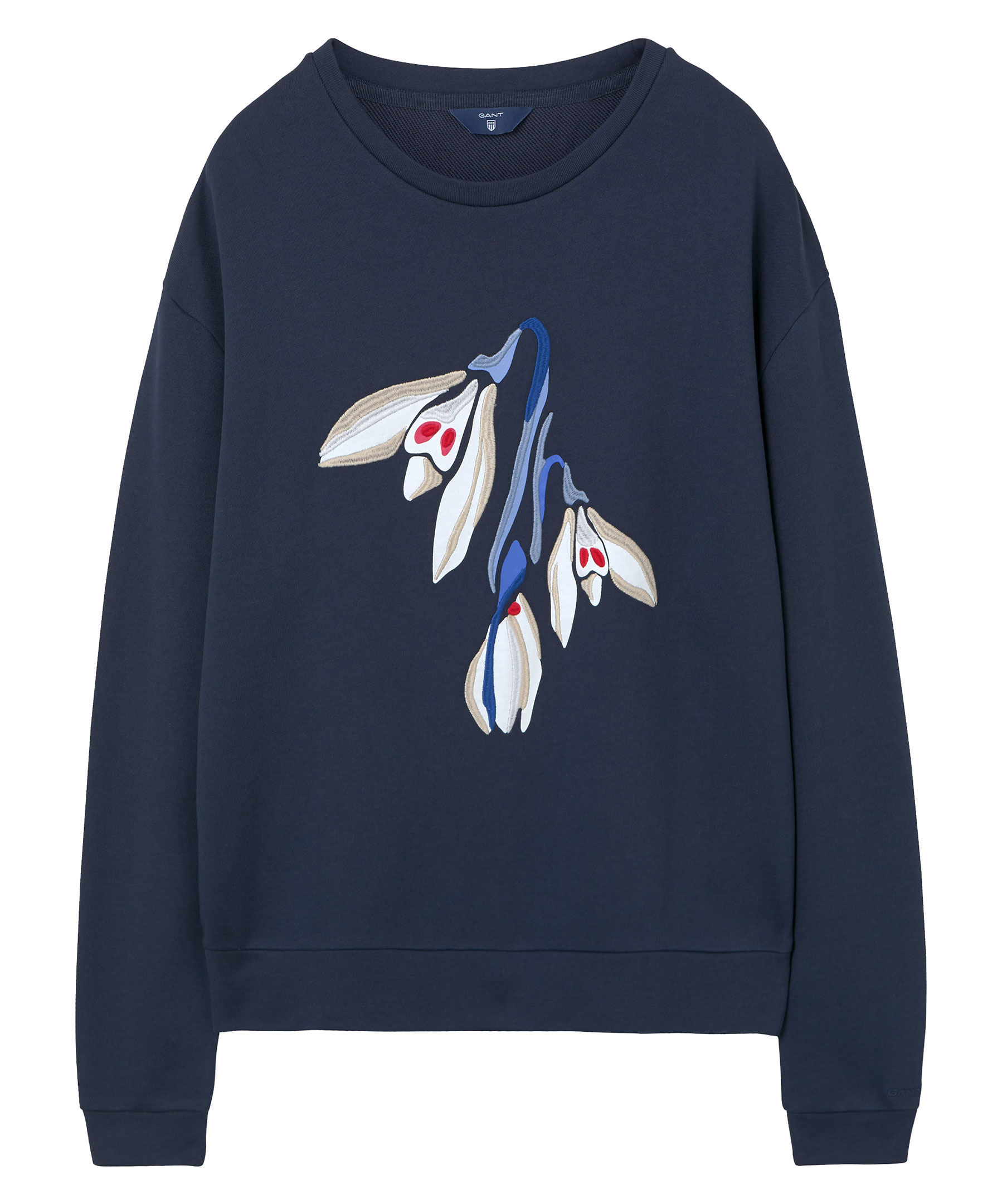 Marinblå sweatshirt från Gant. Tröjan har ett fint snödroppe motiv broderat på bröstet, ribbstickade muddar och rund halsring. Tillverkad i mjuk bomullsmix.
