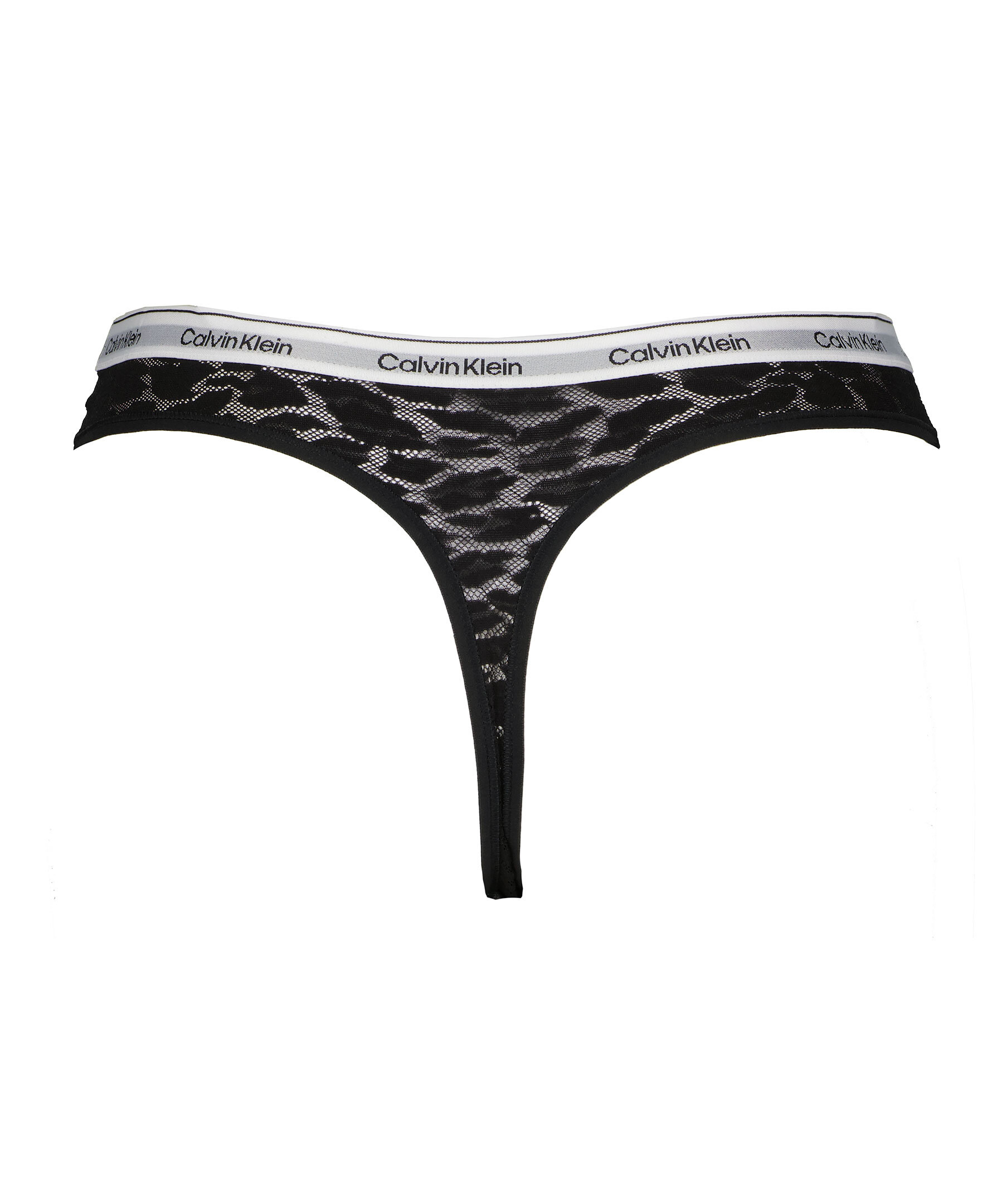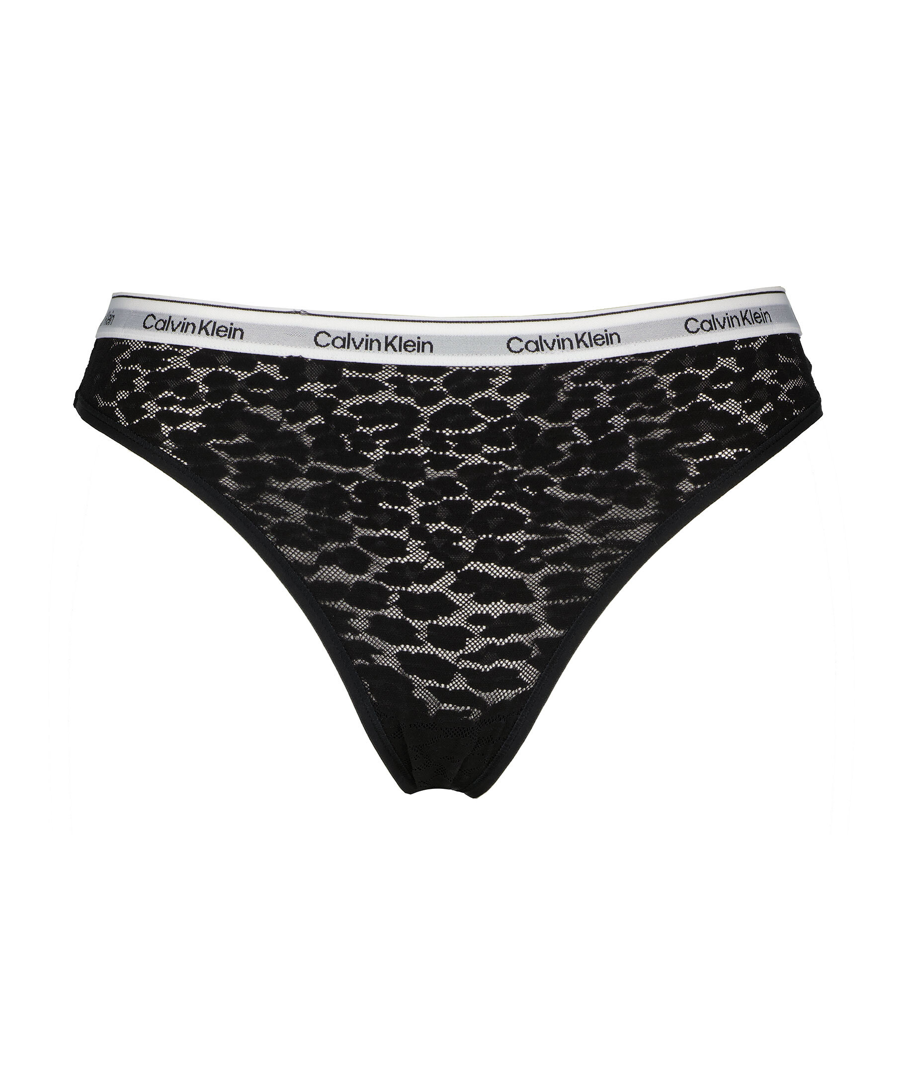 Svarta halvgenomskinliga stringtrosor från Calvin Klein Underwear i leopardspets. Trosorna har en hög bensiluett och Calvin Klein signatur elastiskt midjeband. Normal passform. Tillverkade i en nylon- och elastanblandning.
