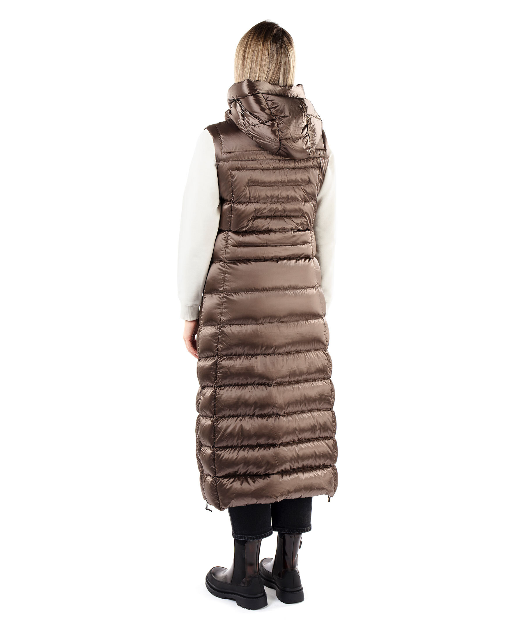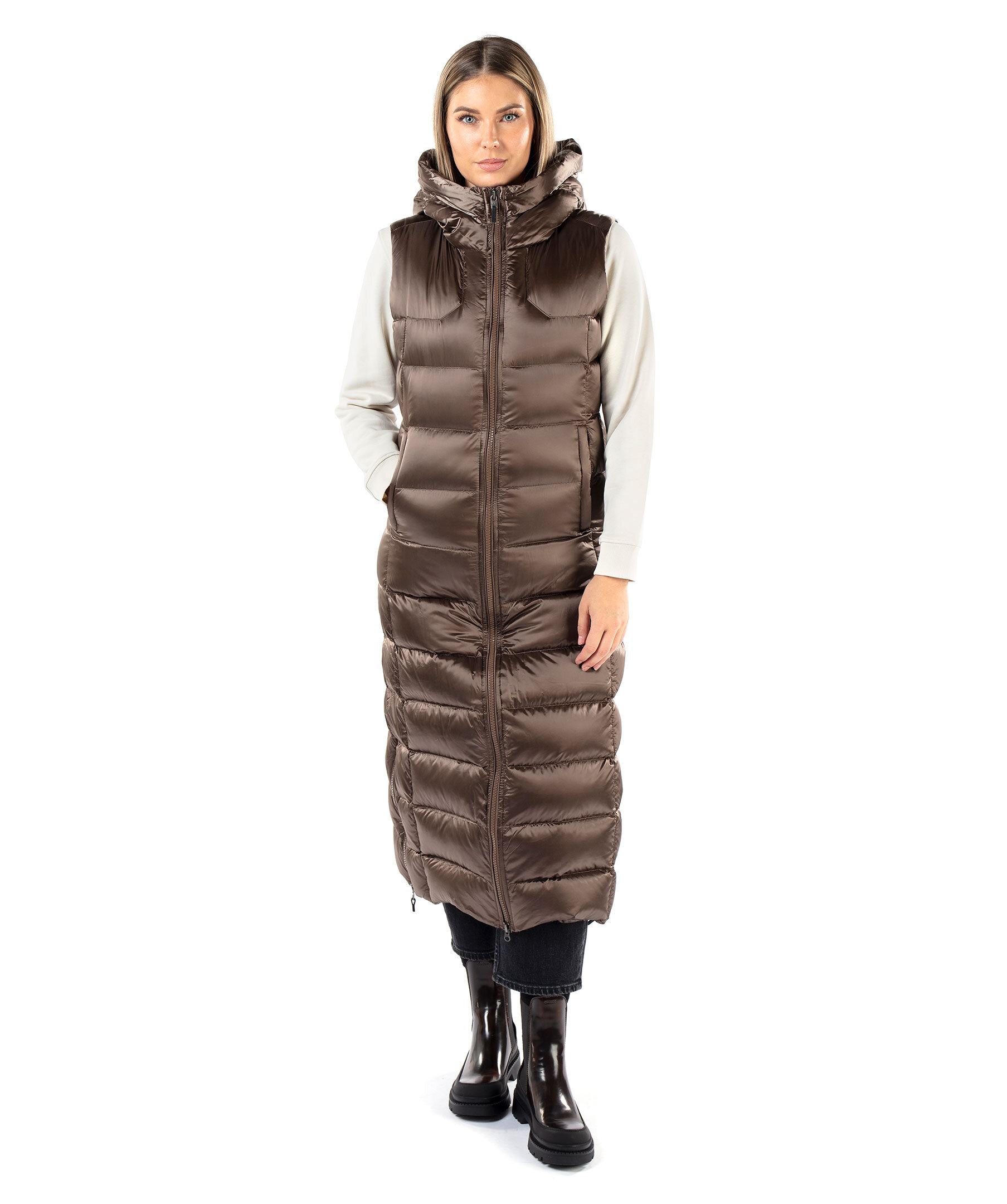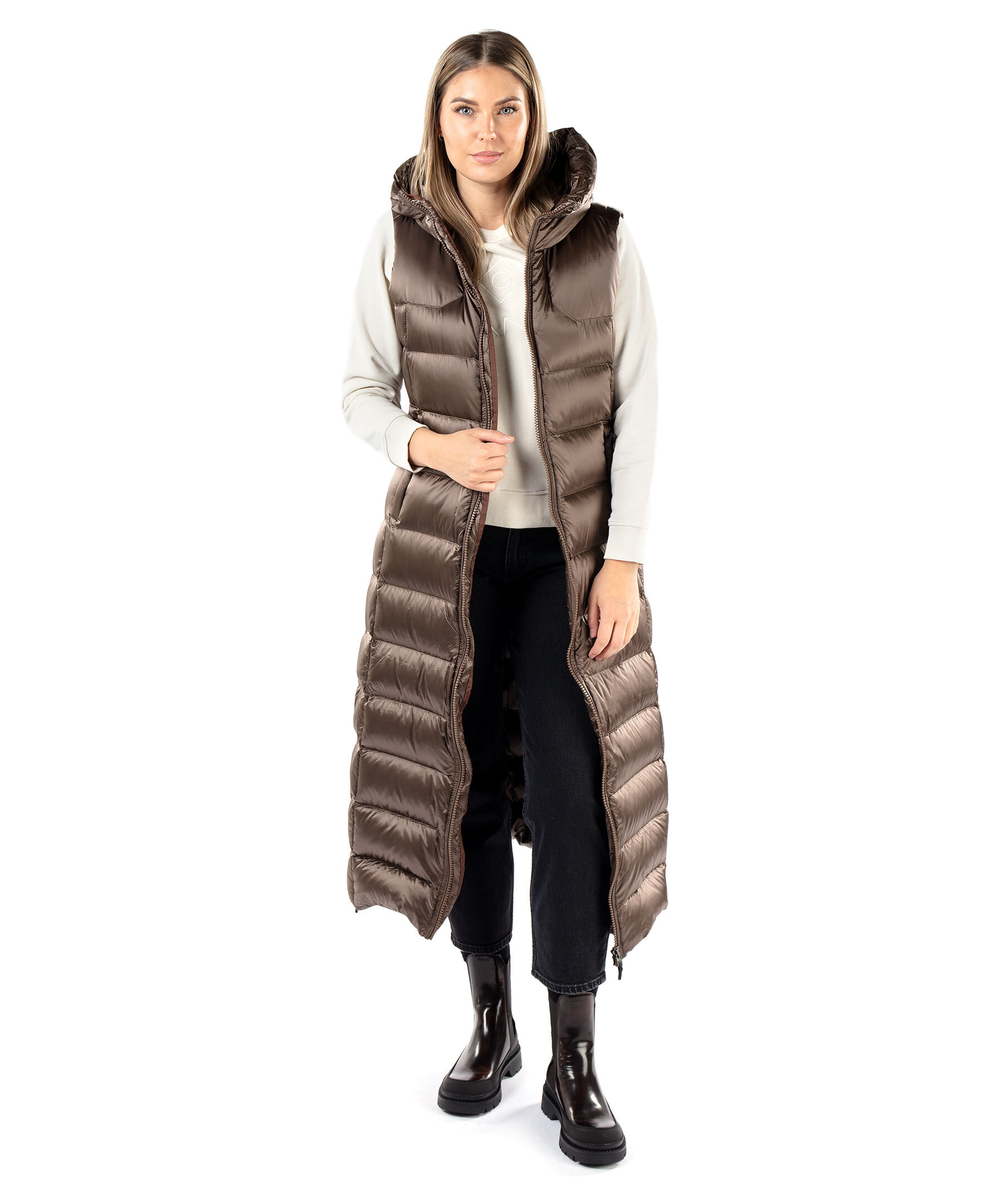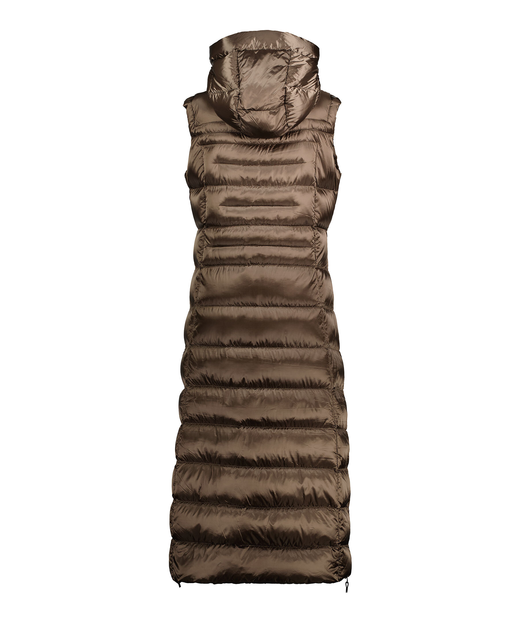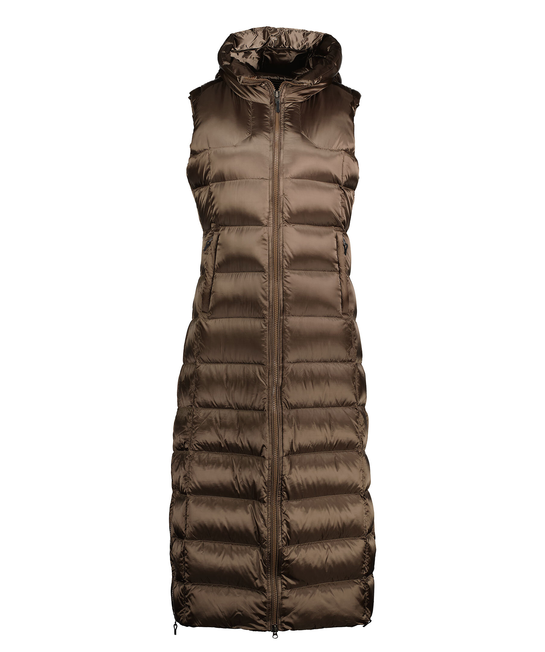 Brun, lång dunväst med figursydd midja från Monel. Yttermaterial i nylontyg med glansig finish. Stängs med tvåvägsdragkedja, har dragkedja i sidorna för att kunna öppna upp på sidorna. Två fickor framtill som stängs med dragkedja och en innerficka med dragkedja. Luva och hög krage samt patch i gummi med logotyp i metall på vänster ärm. Modellen är 175 cm lång och har på sig storlek S.
