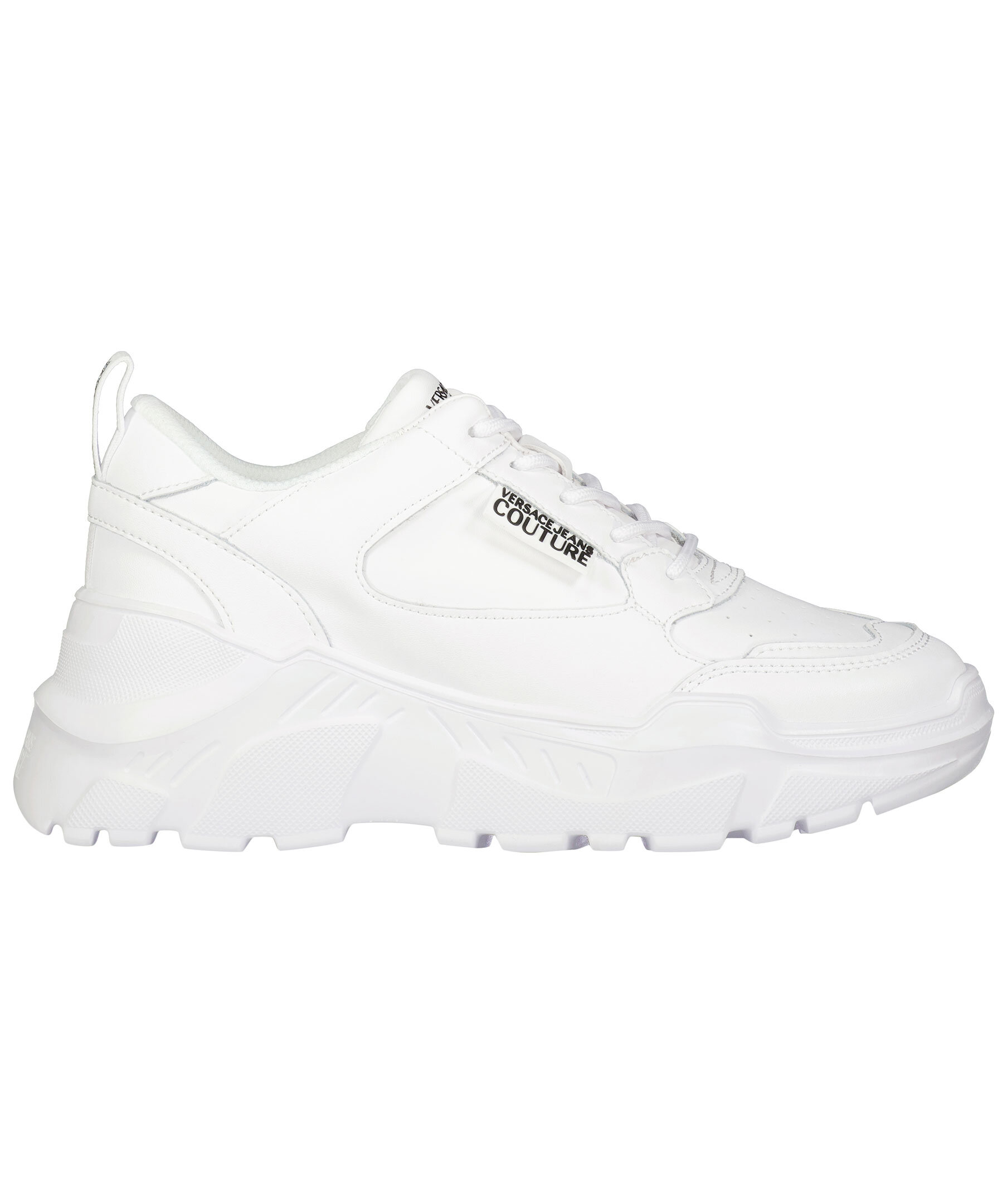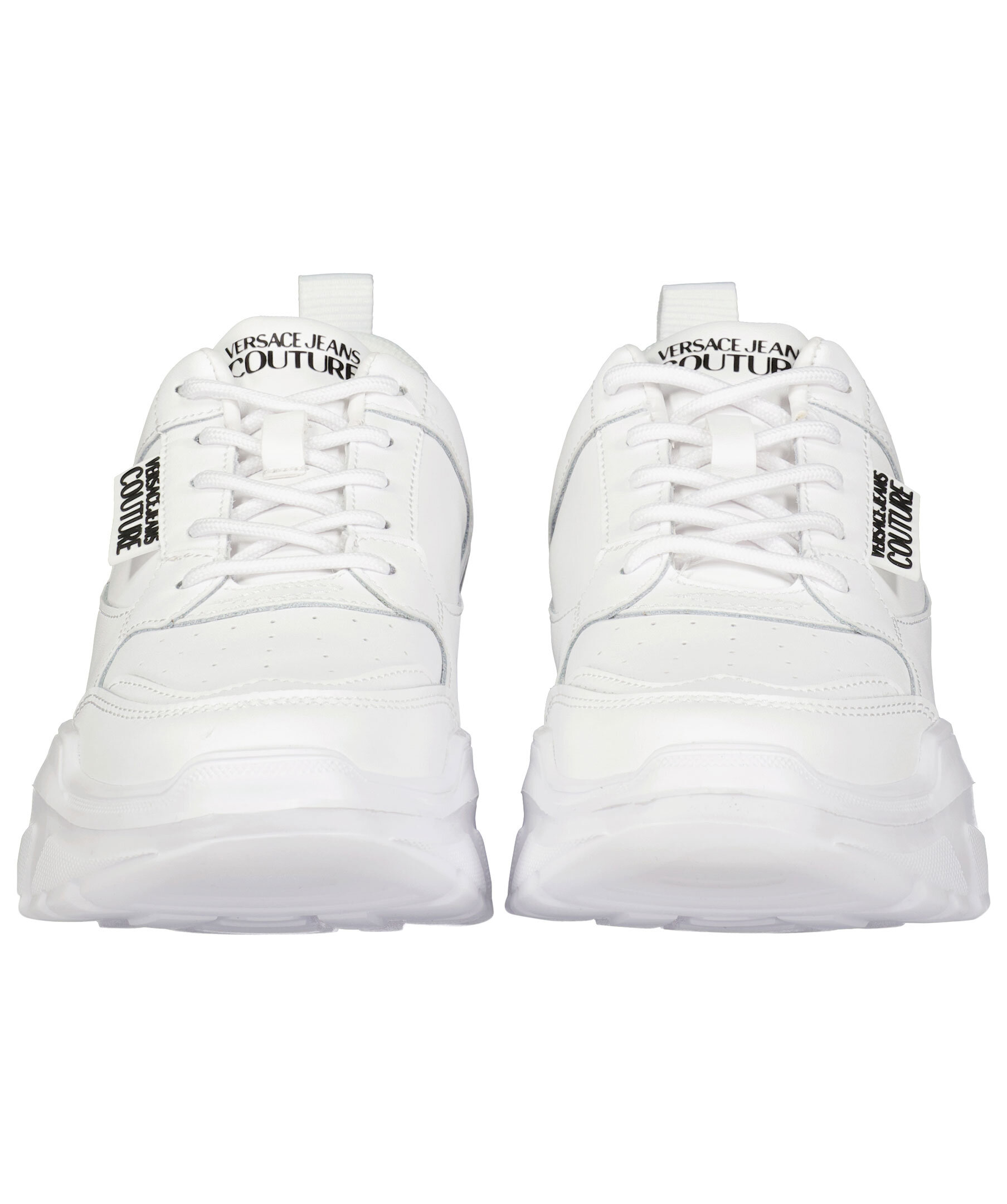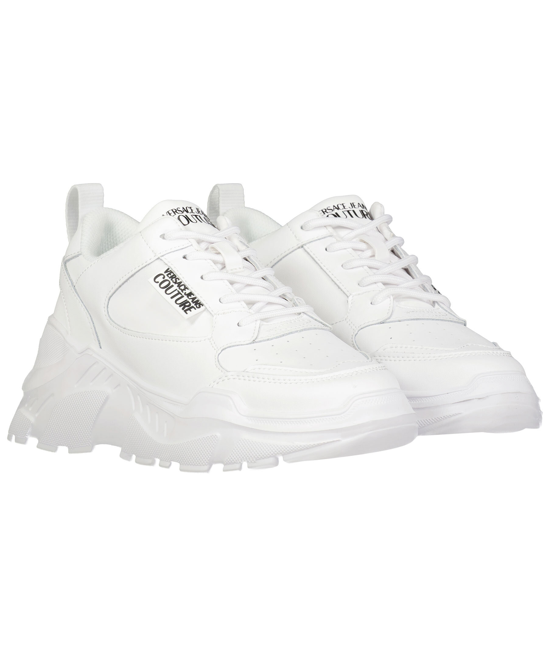 Vita sneakers från Versace Jeans Couture. Tillverkad i läder, mesh och gummi. Logotyp på plösen, hälen och sulan. Runda skosnören. Hög sula.