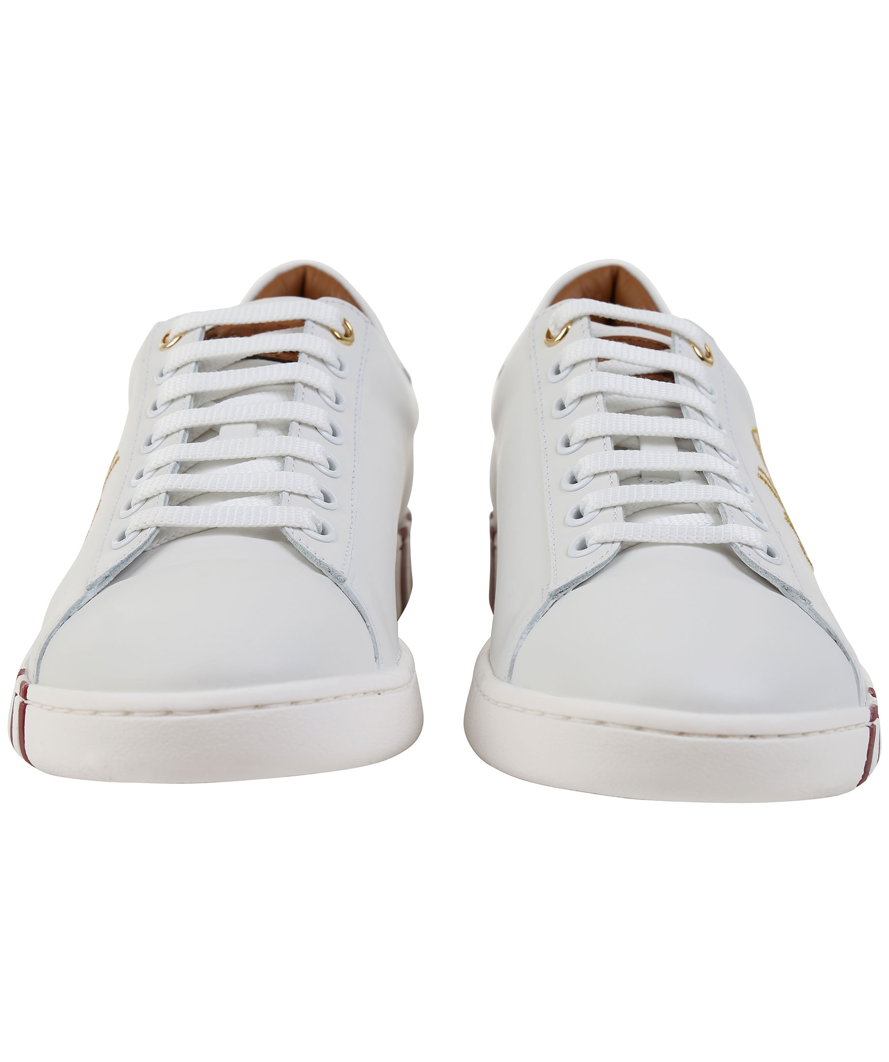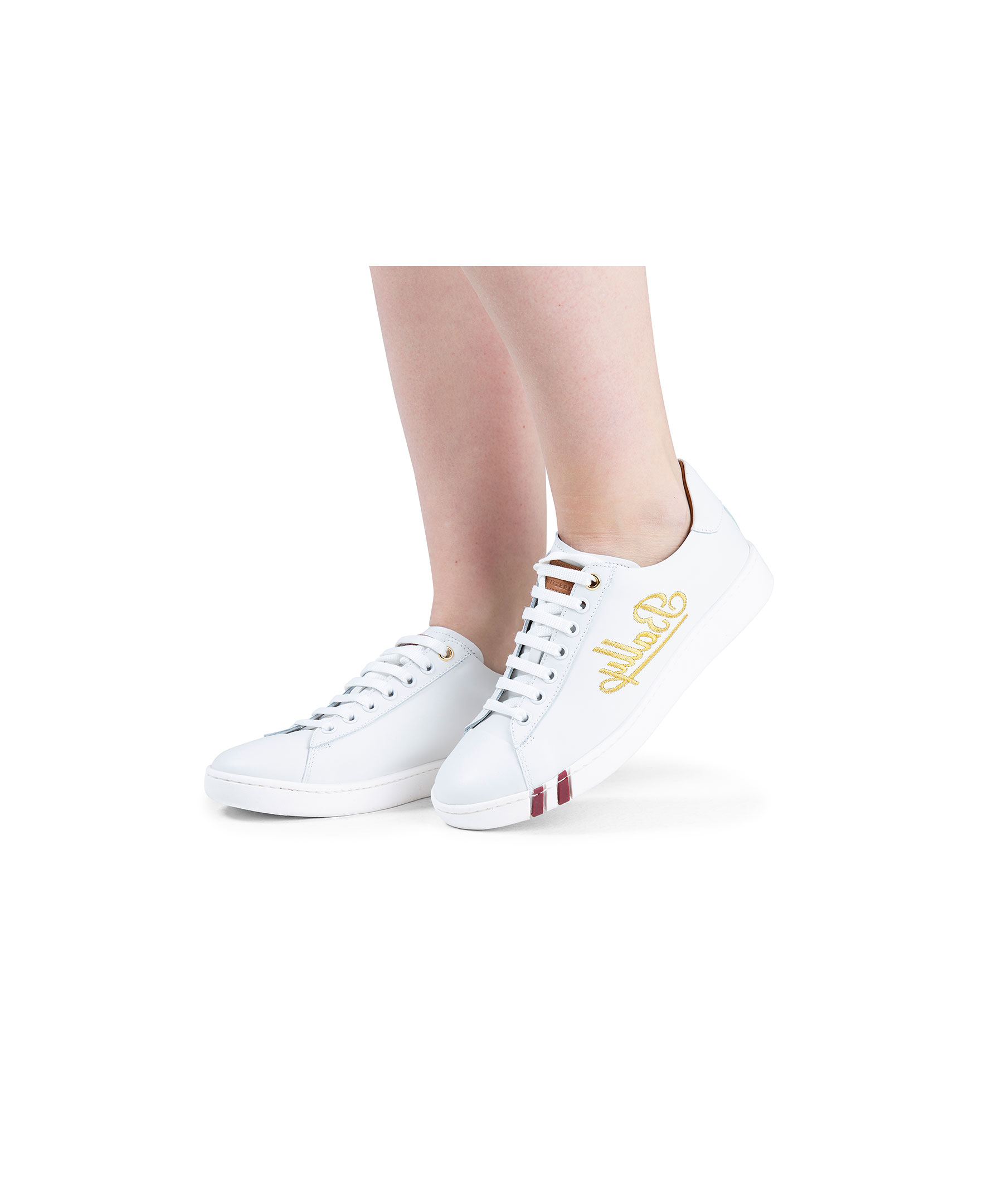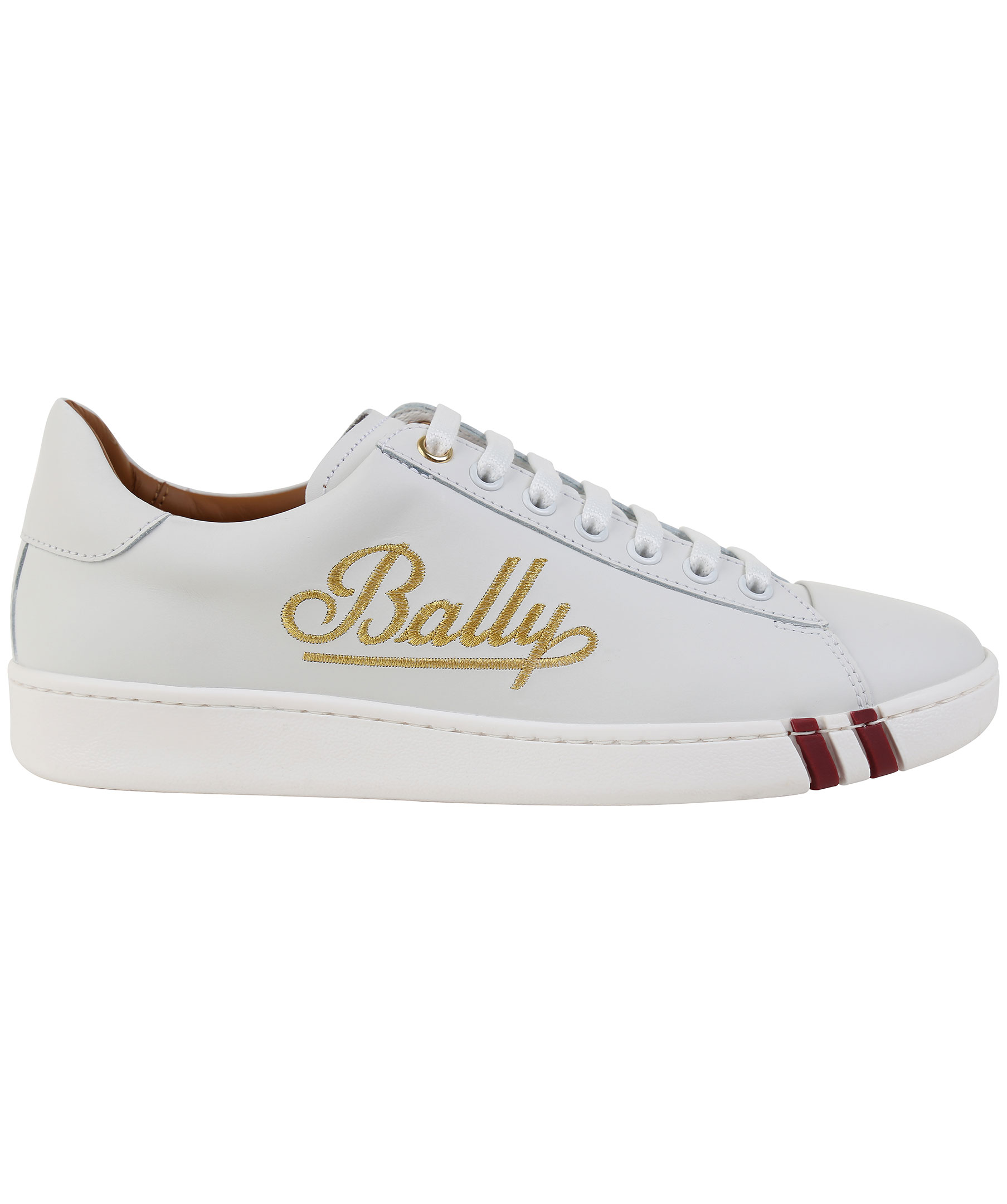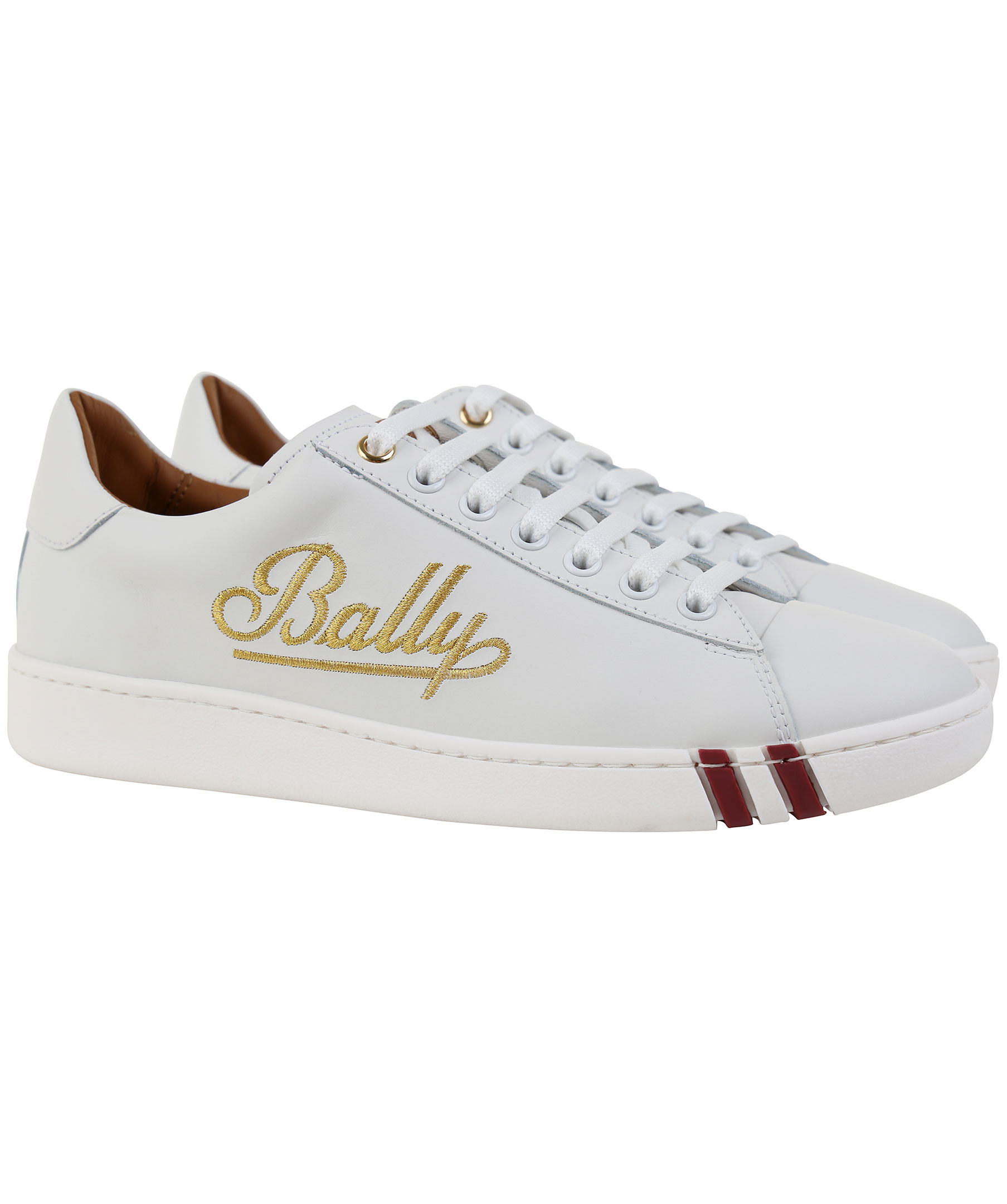 Vita lädersneakers från Bally. Finishen på skorna är matta och har guldfärgad brodyr i texten Bally på ena sidan av skon. Vit sula med röda detaljer på sidorna. Perfekta skor till vardags.