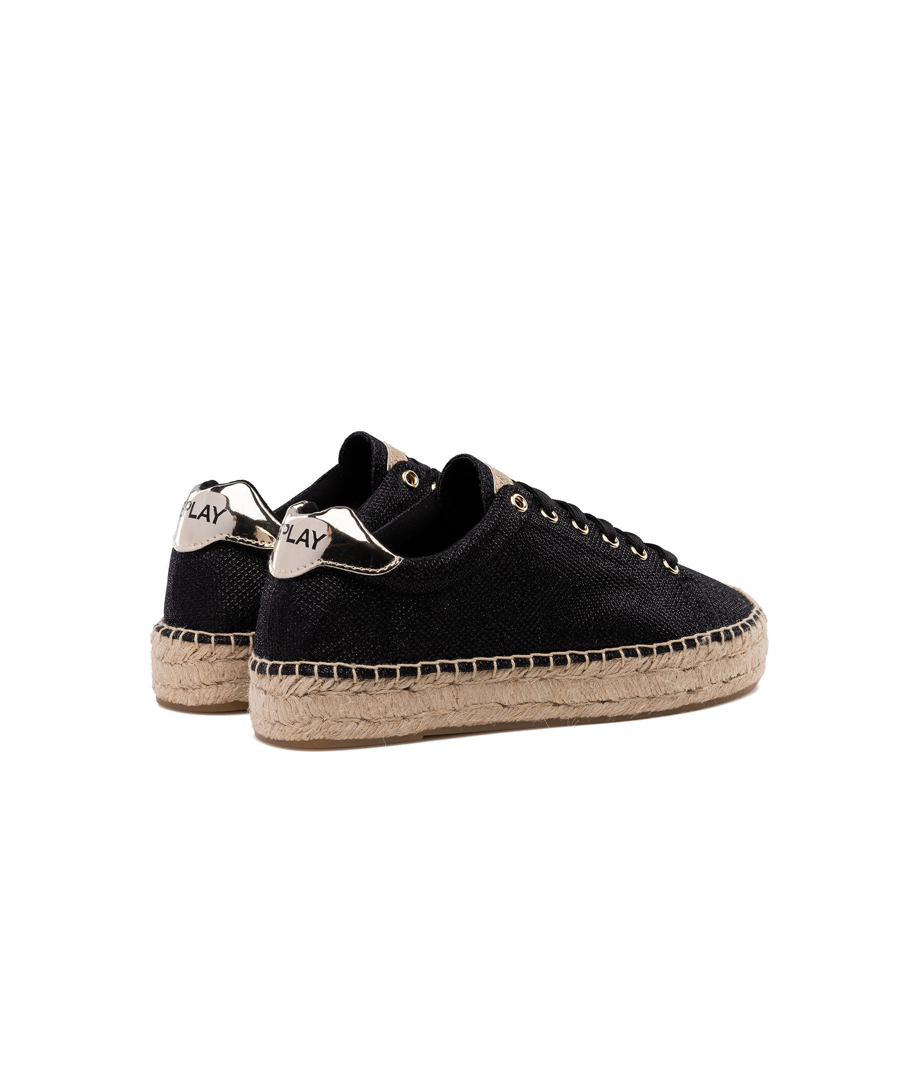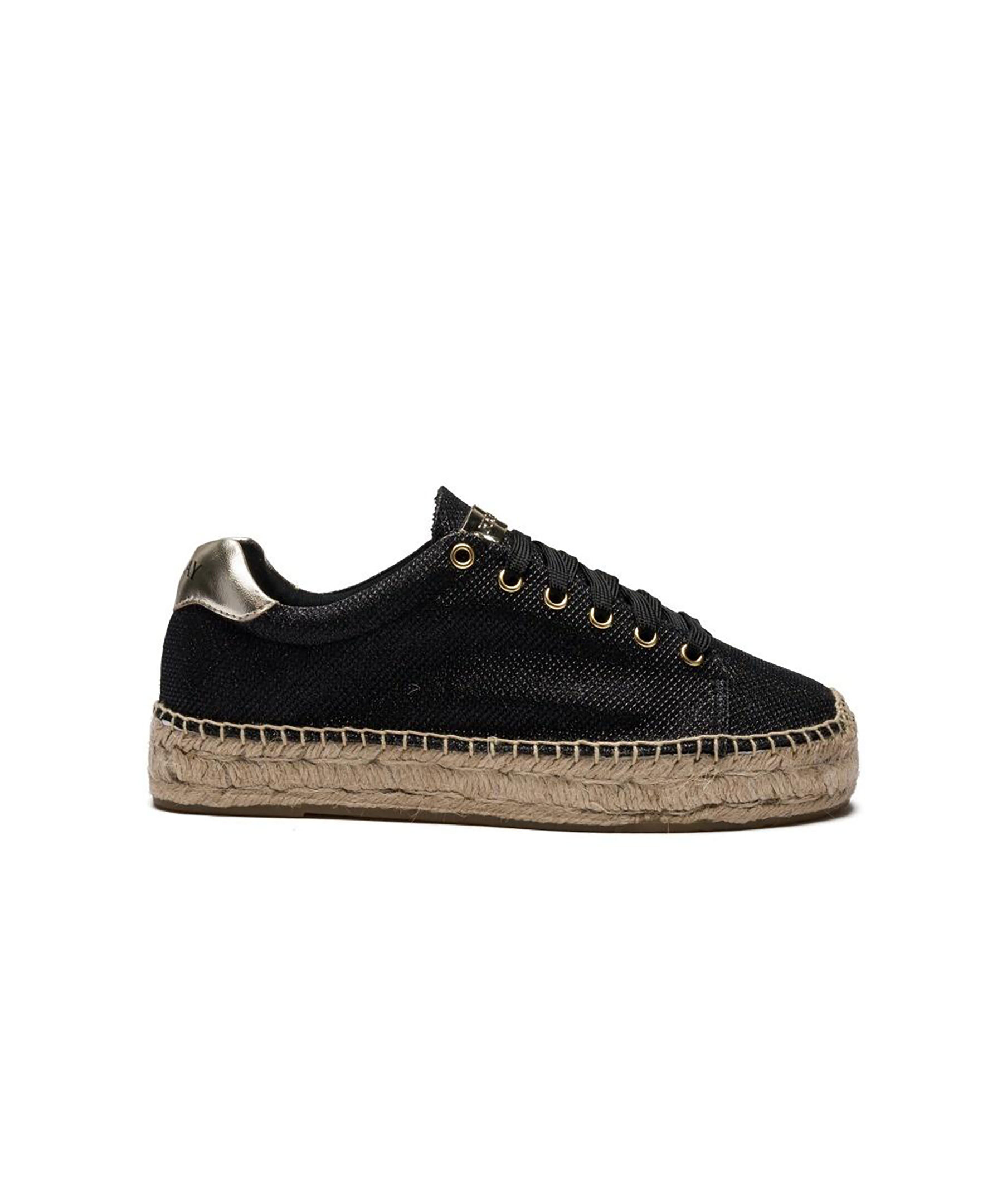 Espadrillos med snörning och glittereffekt med hög platt sula och upphöjda sömmar. Logotypetikett på plösen och logotyptryck på baksidan.