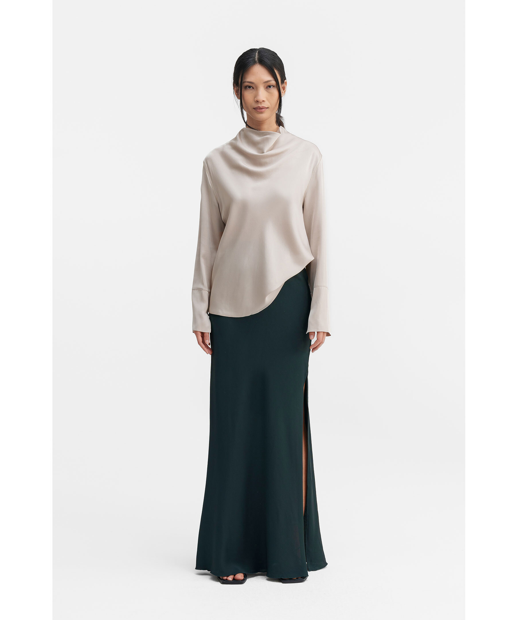 Greige, långärmad sidenblus från Ahlvar Gallery. Blusen har en vattenfallsdrapering runt halsen tillsammans med deras signaturärm med dubbellagers mudd, slits och metallisk knapp. Framkroppen är avskuren och det finns en dold dragkedja i nacken bak. Tillverkad i en sidenblandning.
