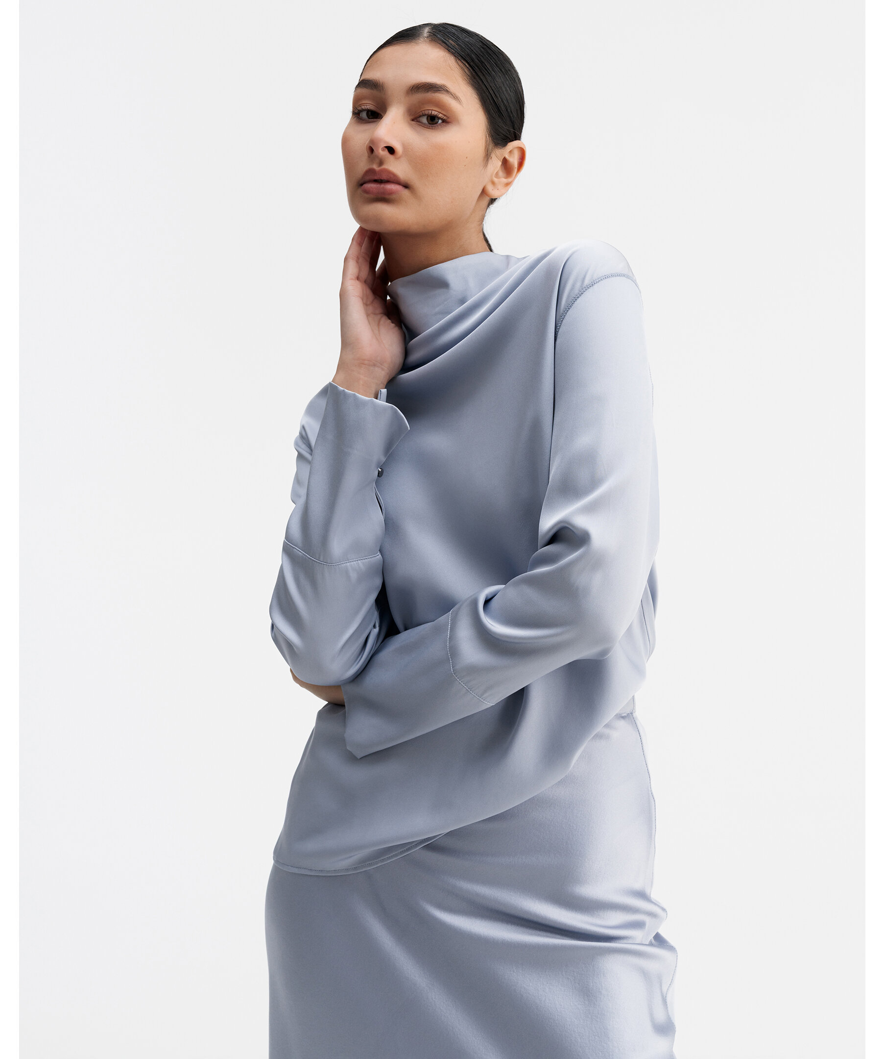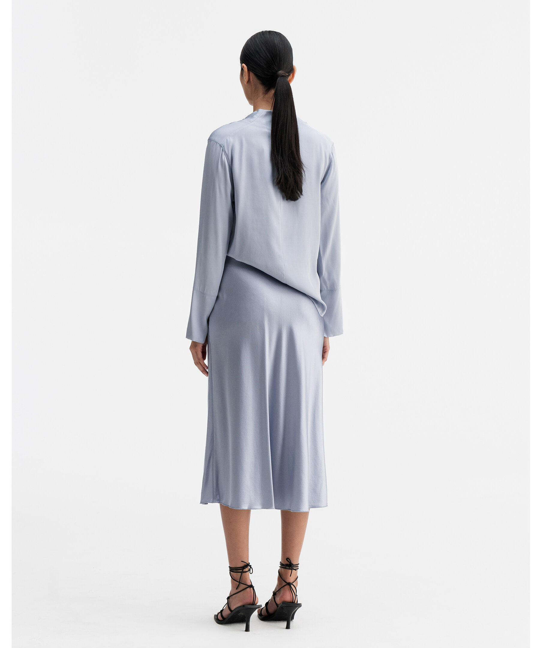 Ayumi Blouse från Ahlvar Gallery är en elegant och mångsidig blus i en exklusiv silkesstretch. Den har en mjukt draperad vattenfallsringning, signaturärmar med dubbla manschetter, slitsar och metallknappar samt en skråskuren framsida för ett vackert fall. Dold dragkedja baktill ger en ren och sofistikerad finish.