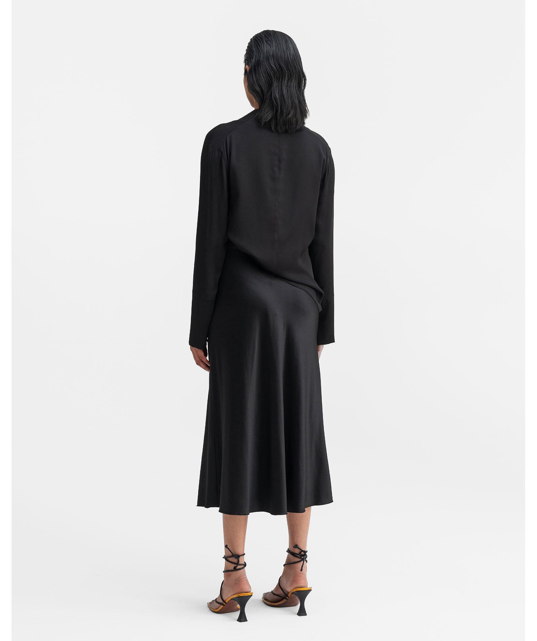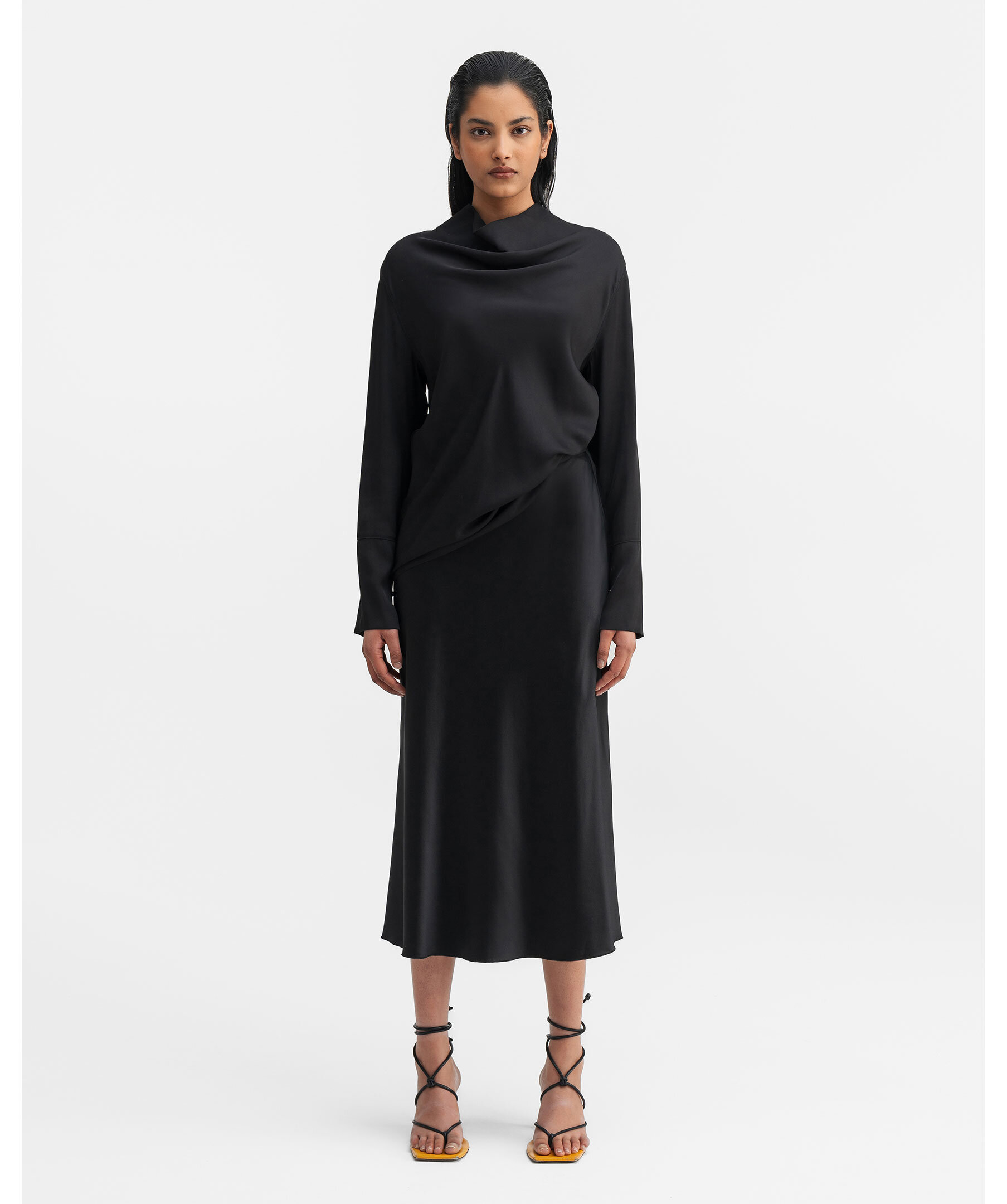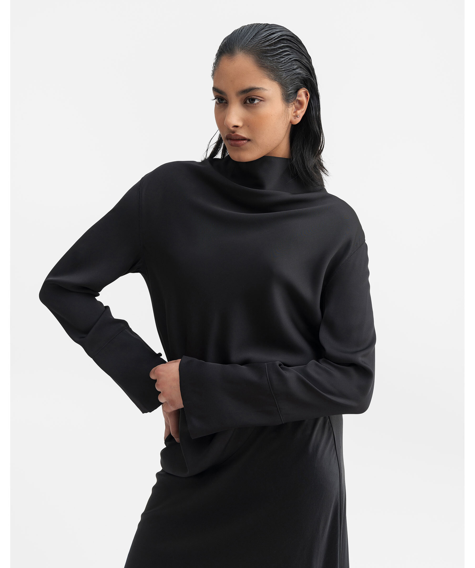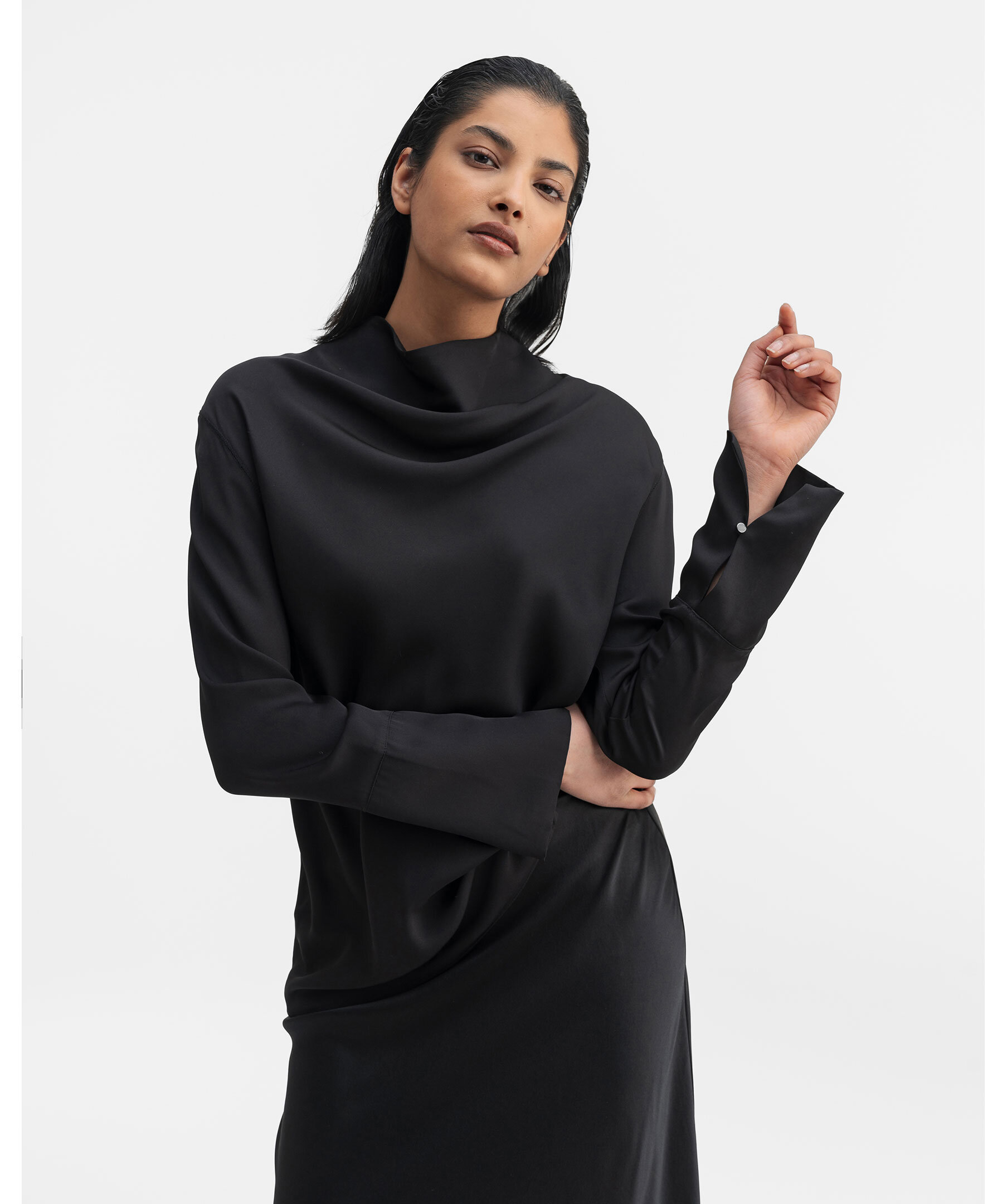 Svart blus från Ahlvar Gallery. Blusen är tillverkad i en klassisk siden/stretch-blandning och har en elegant vattenfallsdrapering vid halsen. Den kännetecknas av långa ärmar med signaturmanschetter, en slits och en metallknapp. Framstycket är skuret på skrå och har en dold dragkedja i nacken. Perfekt för både vardag och fest.