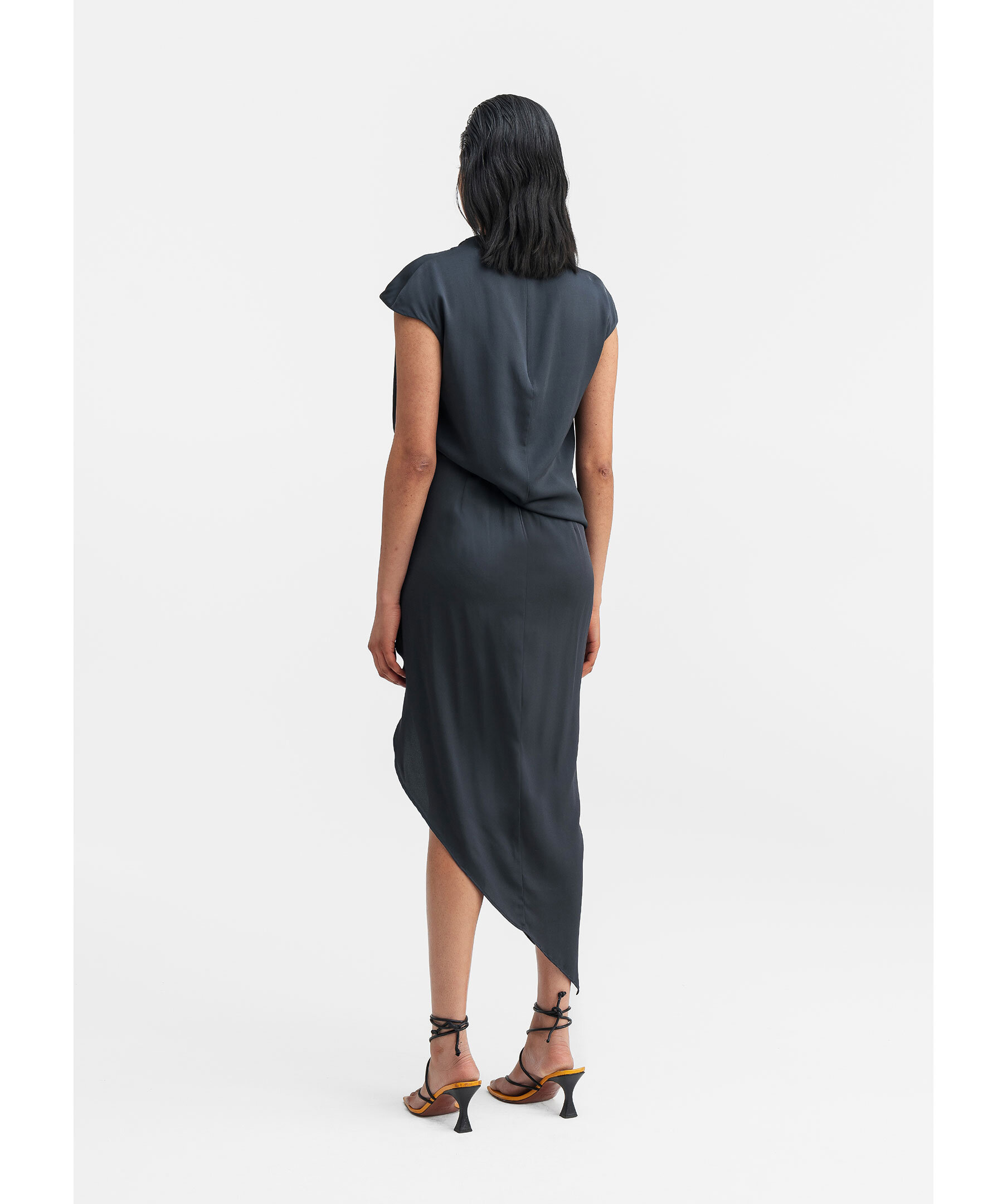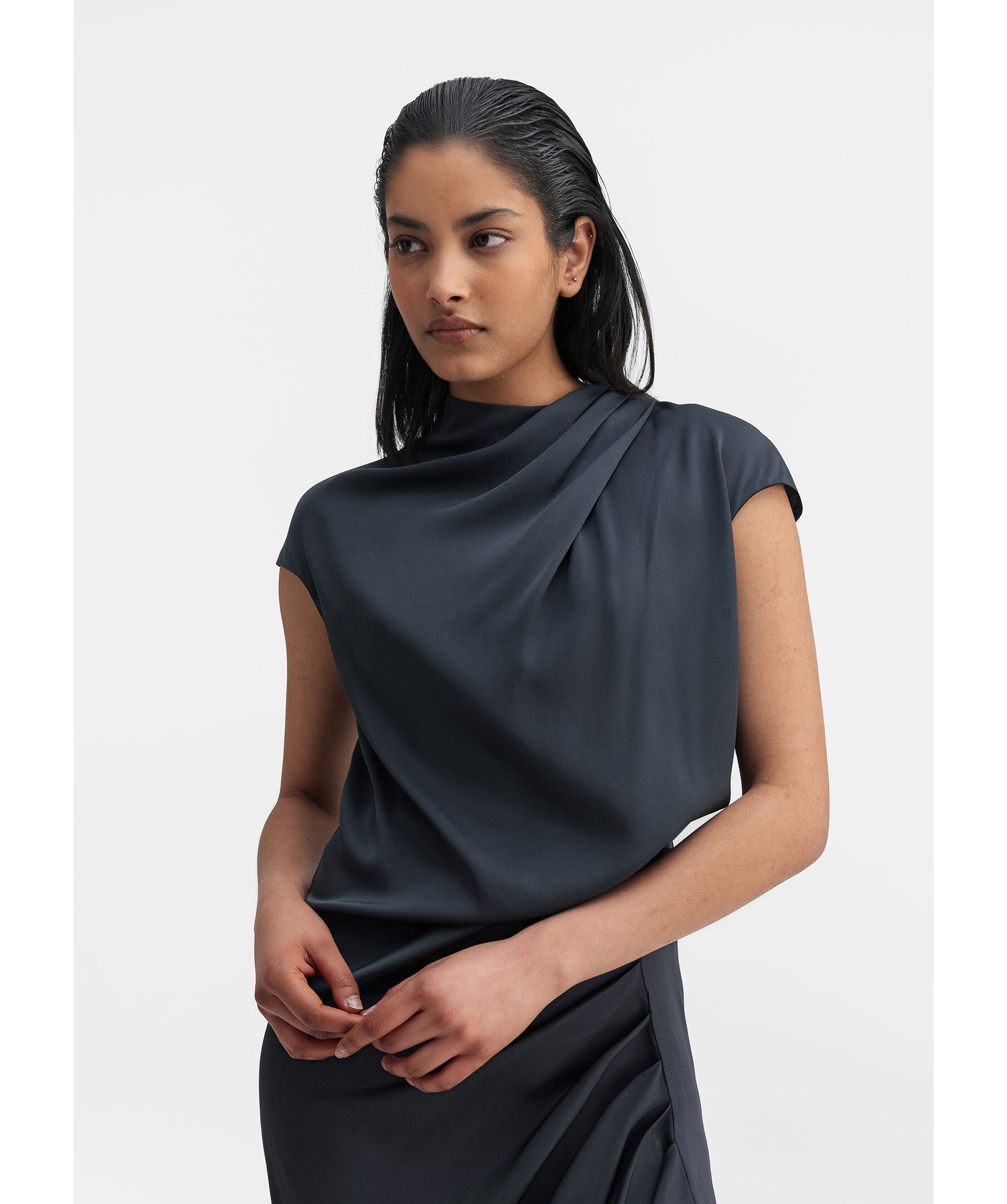 Blågrå topp i en sidenblandning från Ahlvar Gallery. Toppen har asymmetriska veck för att ge en fin drapering längs halsringningen, korta ärmar och en dold dragkedja bak i nacken.