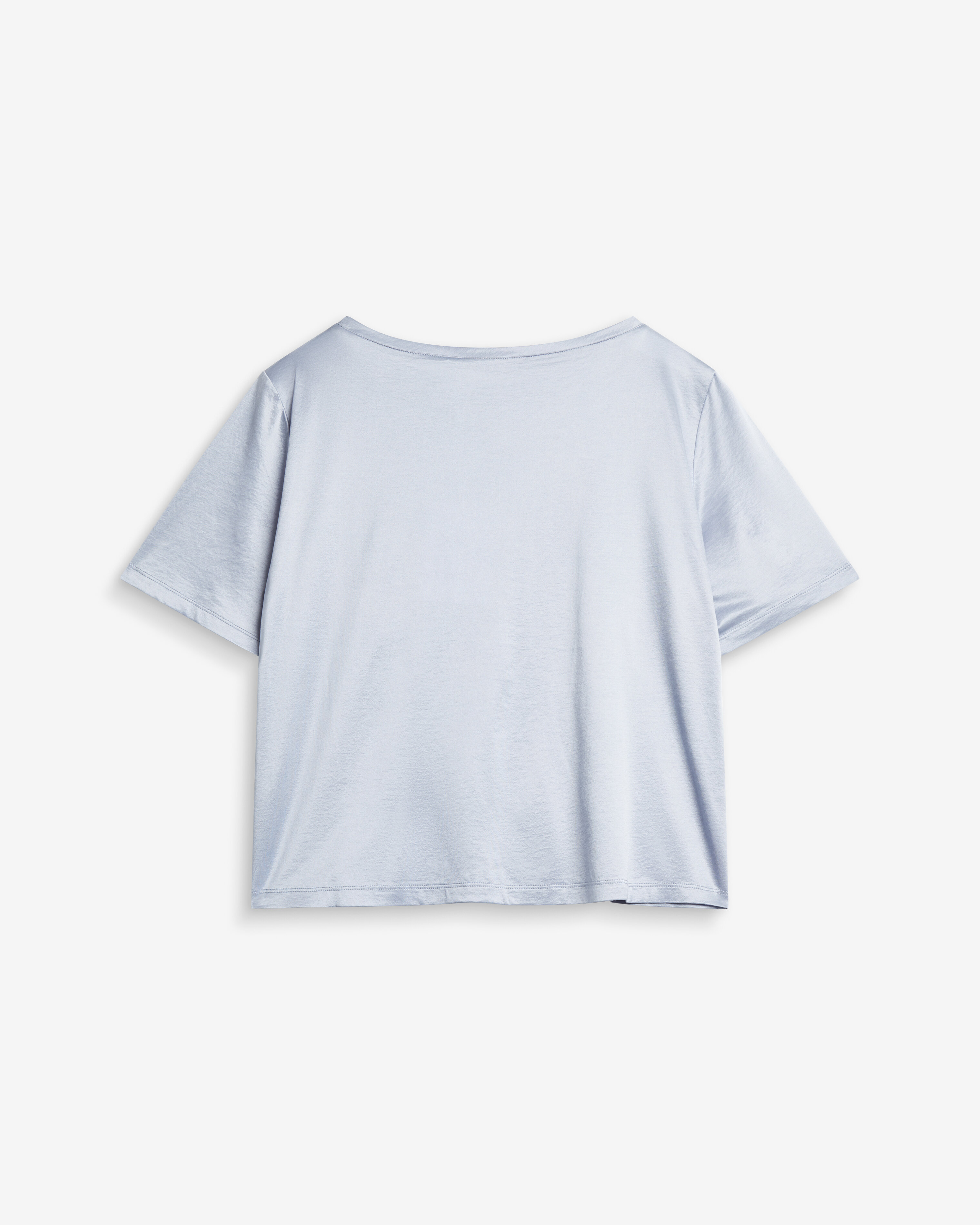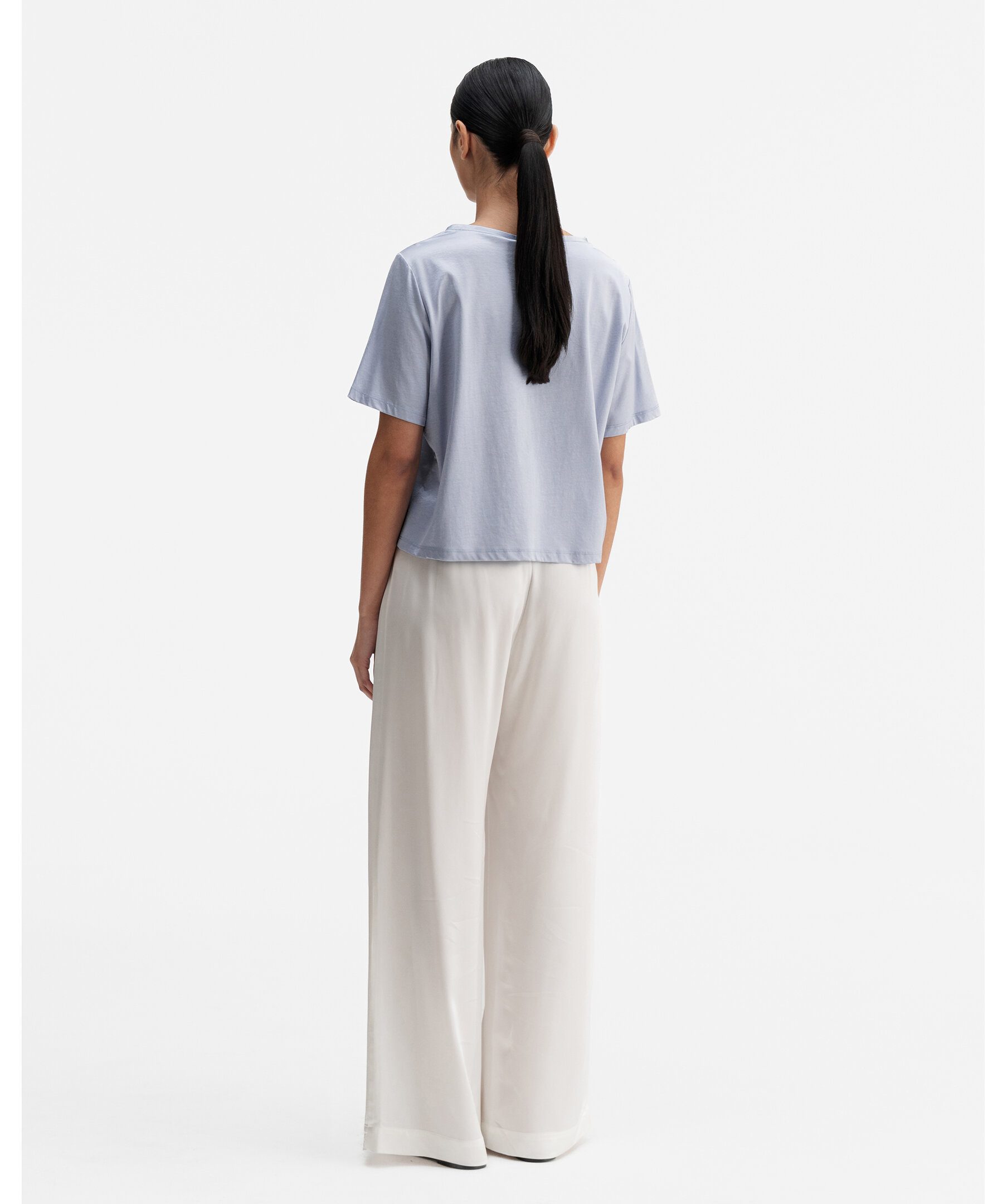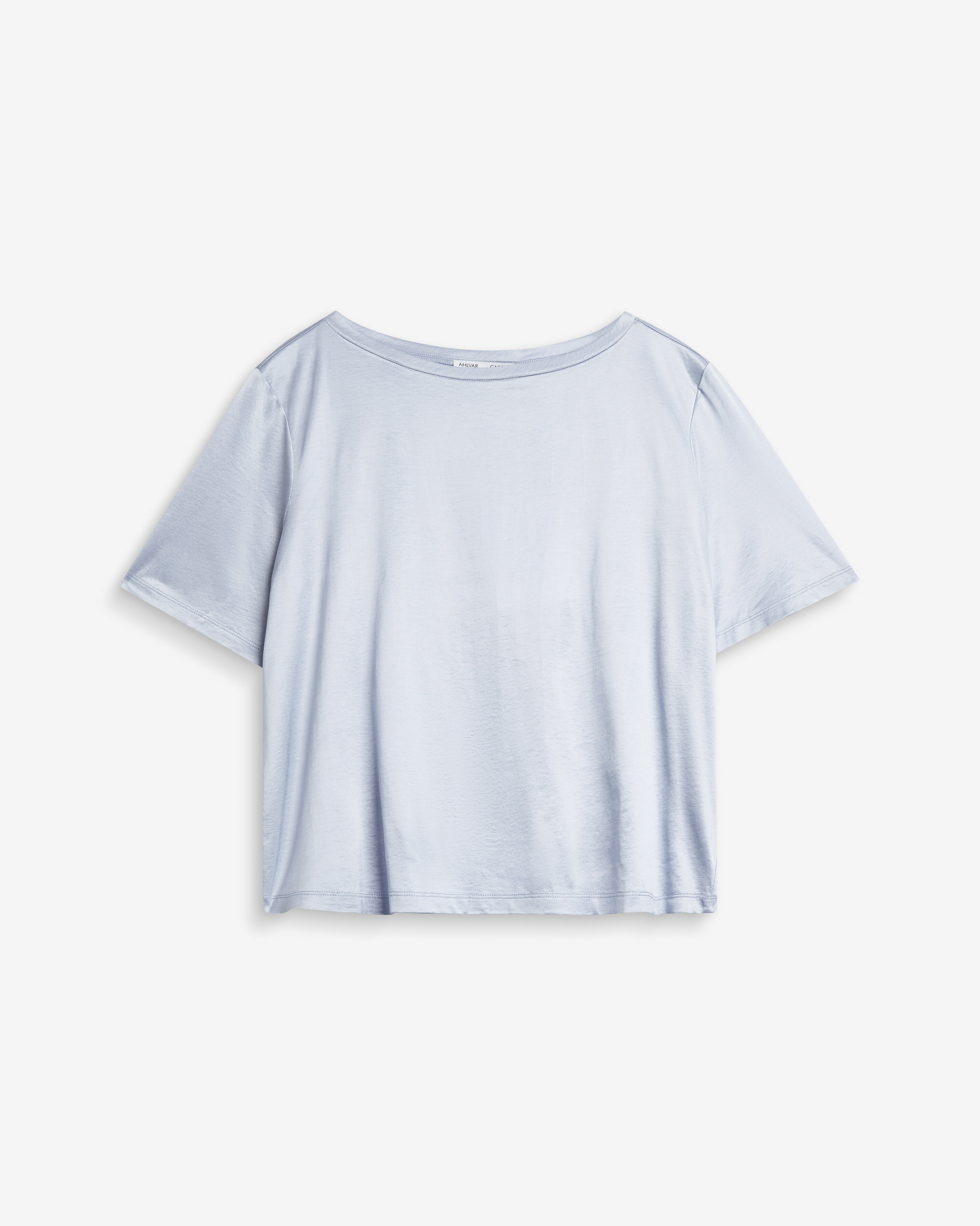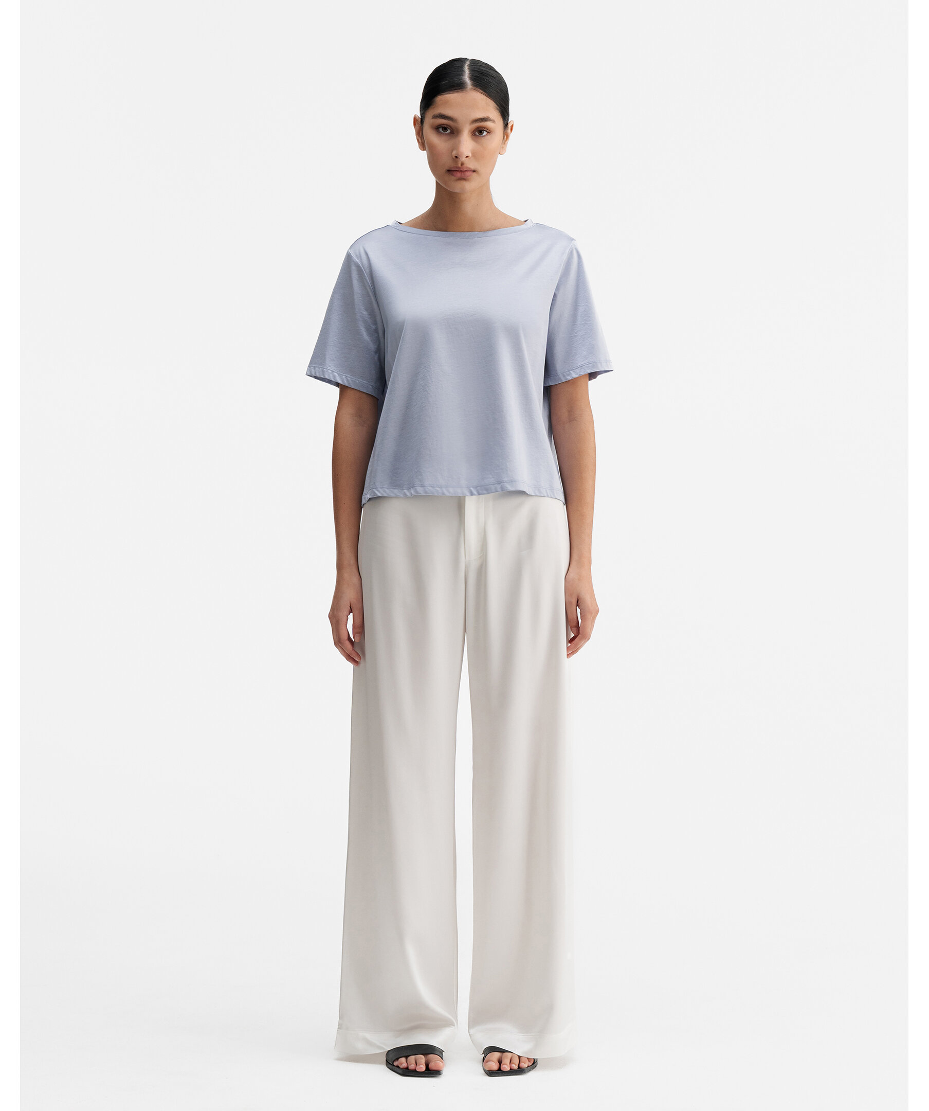 Lola jersey t-shirt från Ahlvar Gallery är skuren i en lätt transparent viskosblandning med subtil lyster. Den har en ren, minimalistisk design med smal kantning runt båtringningen och en något kortare längd. Ett mångsidigt plagg som passar alla tillfällen, året runt.