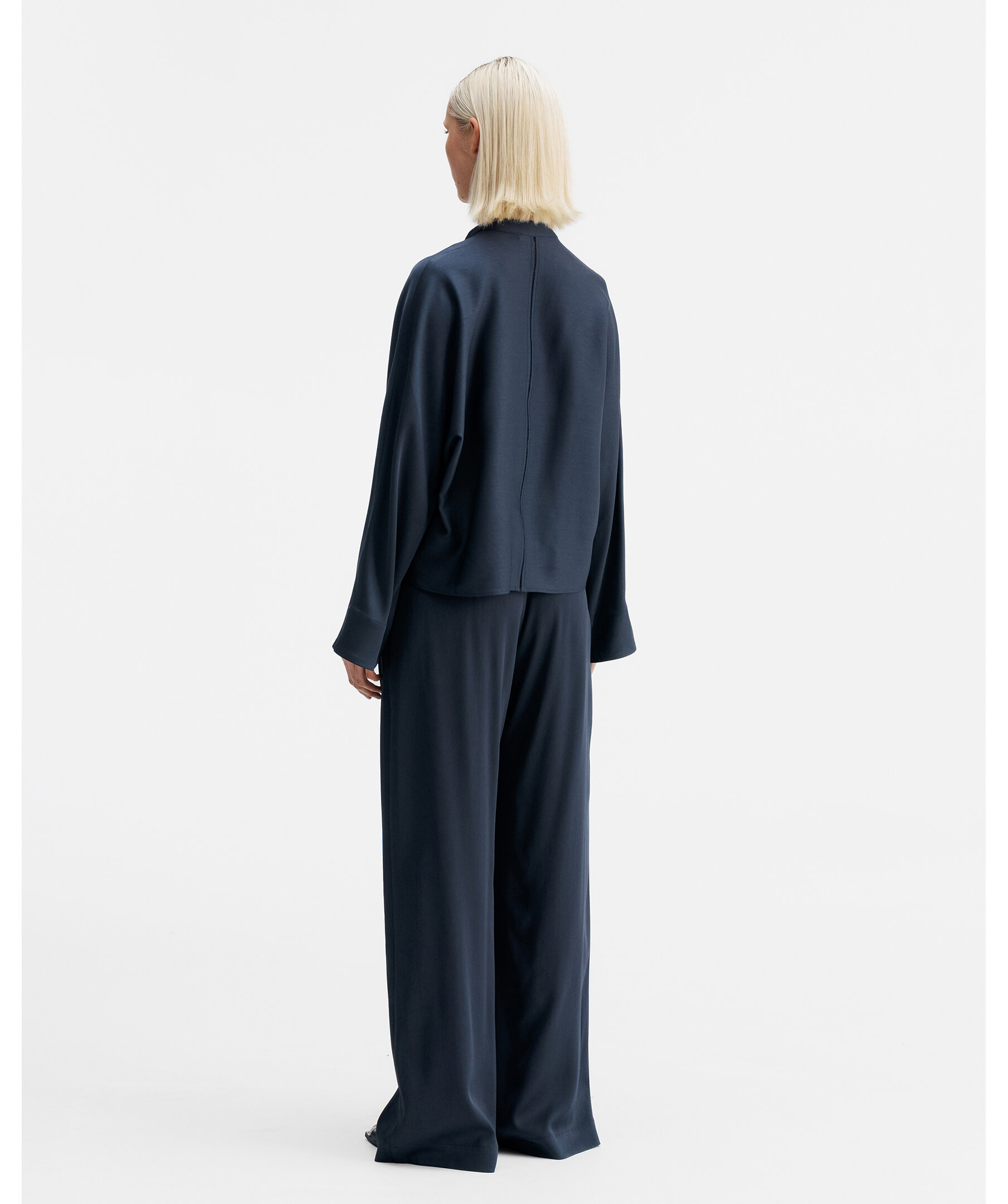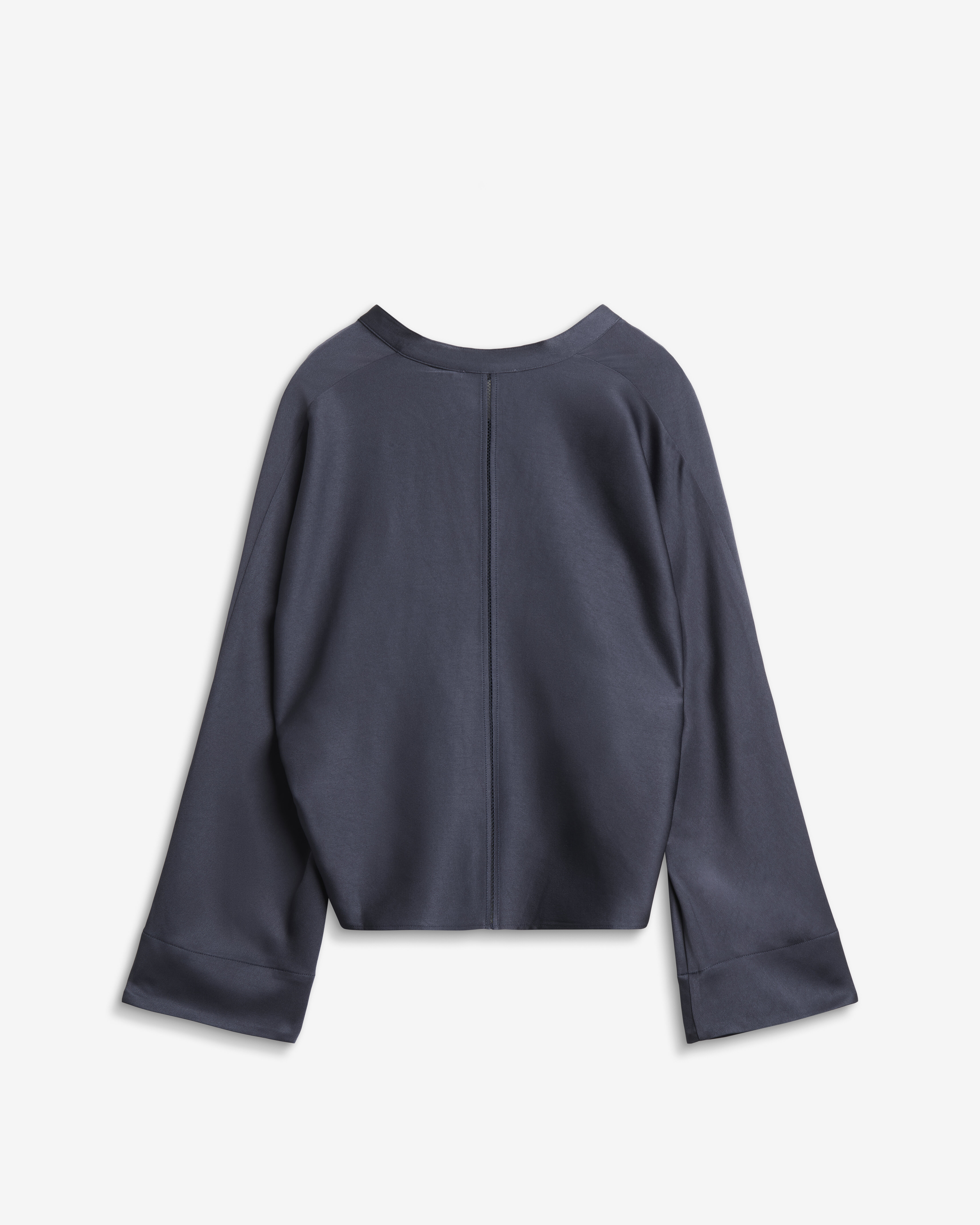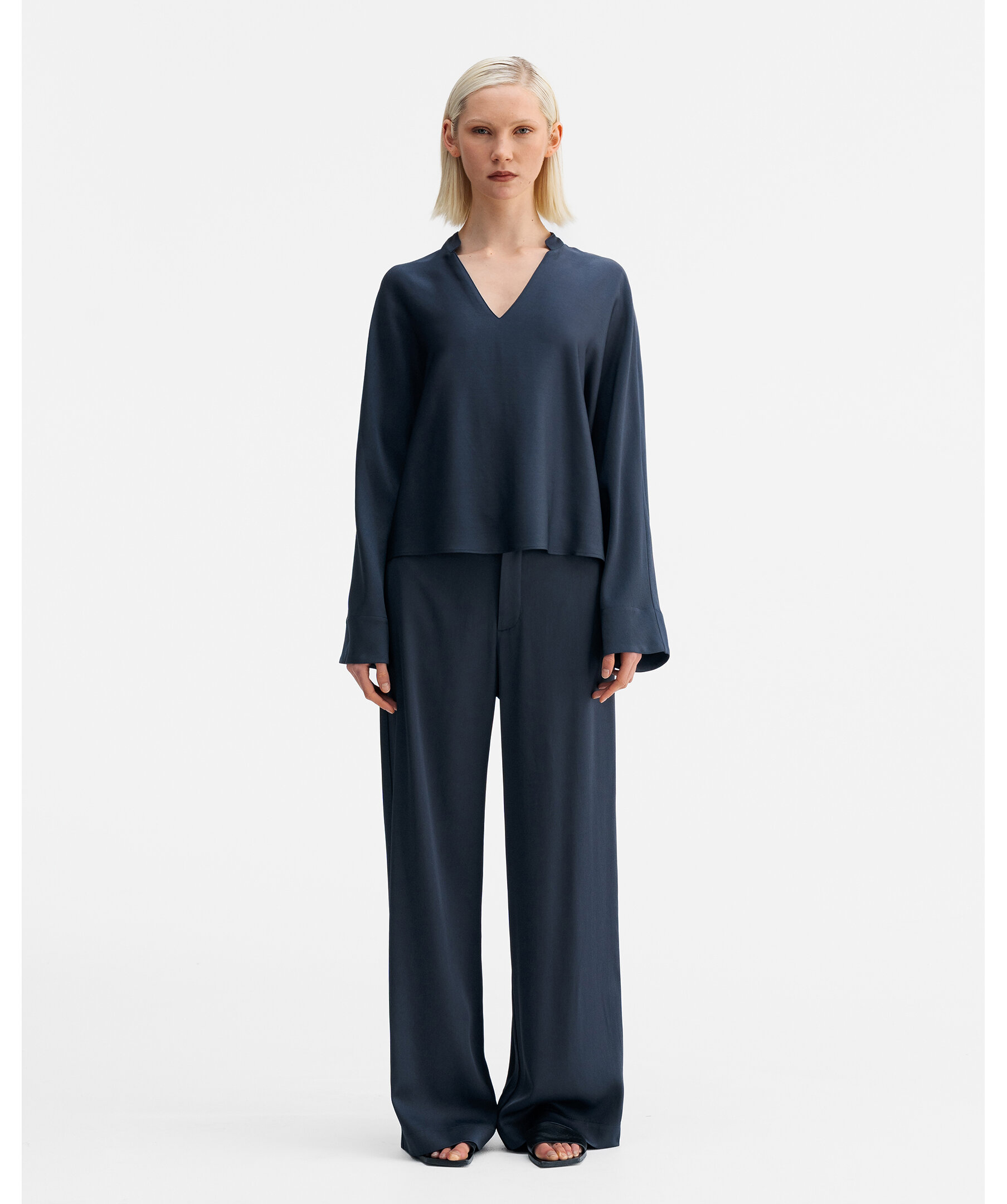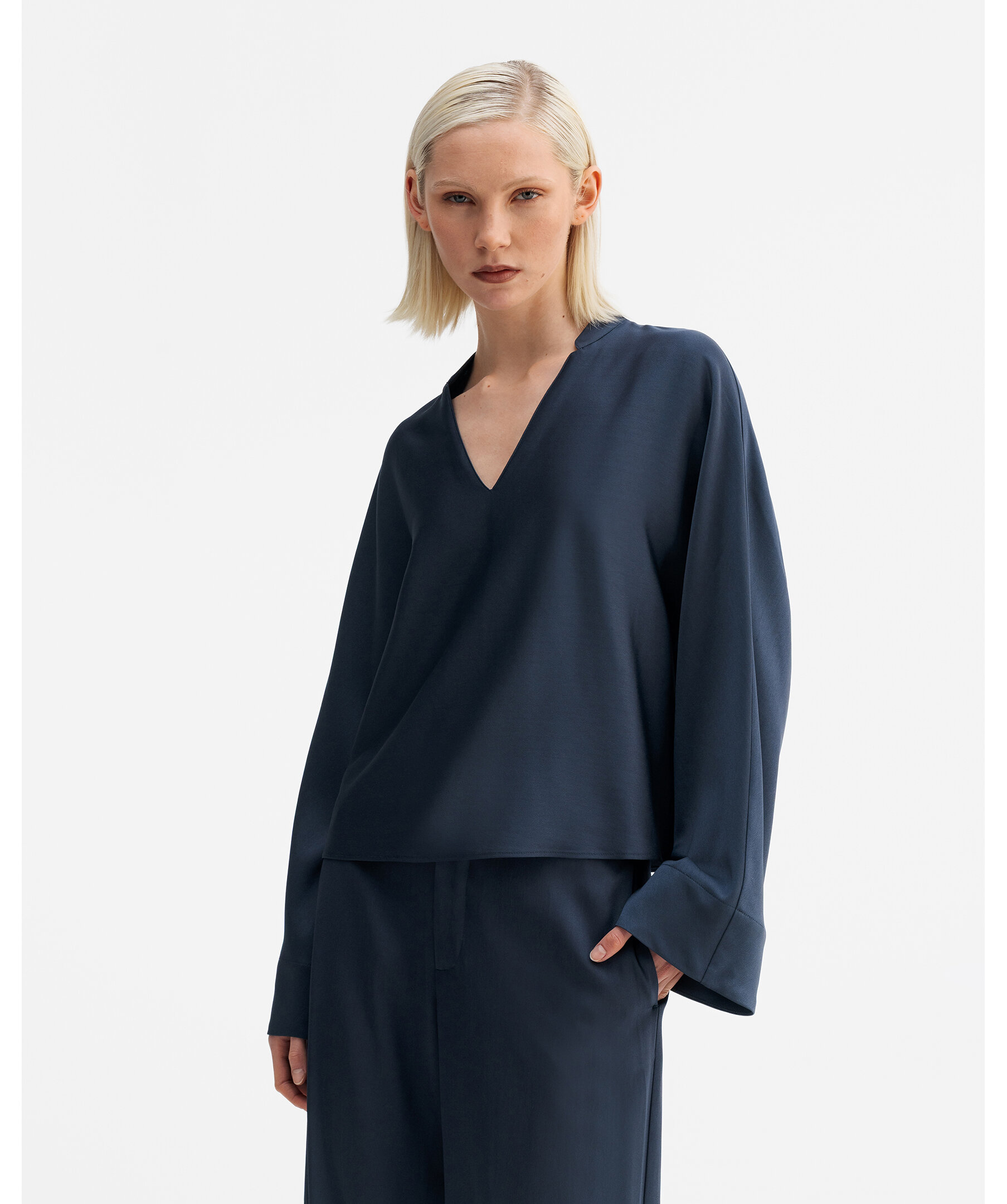 Nina V-neck blus från Ahlvar Gallery är tillverkad i en acetatblandning med strukturerad yta och har en avslappnad silhuett. Den är designad med pingvinärmar, V-ringning med liten kinakrage samt en signaturbroderad söm längs ryggraden.