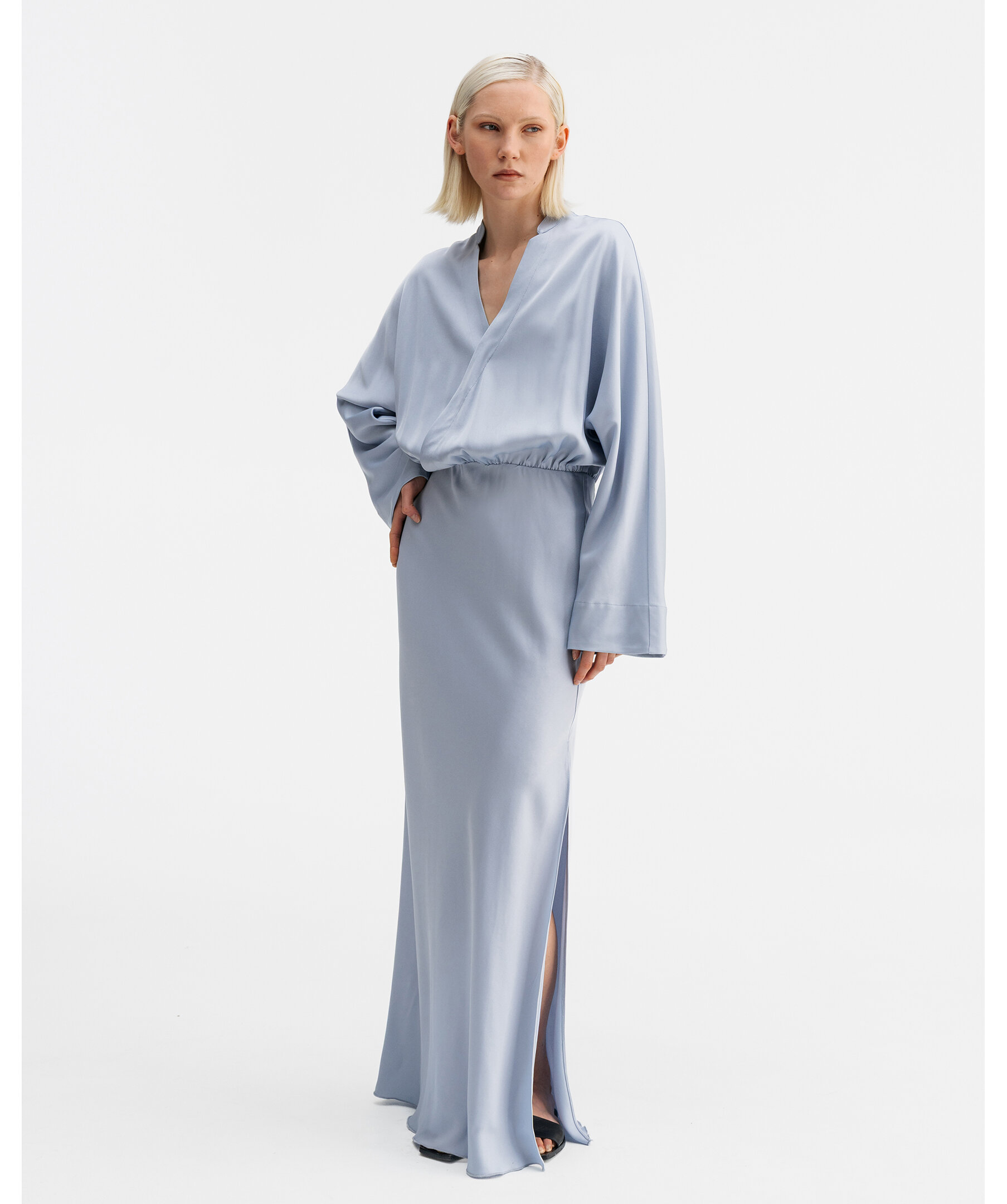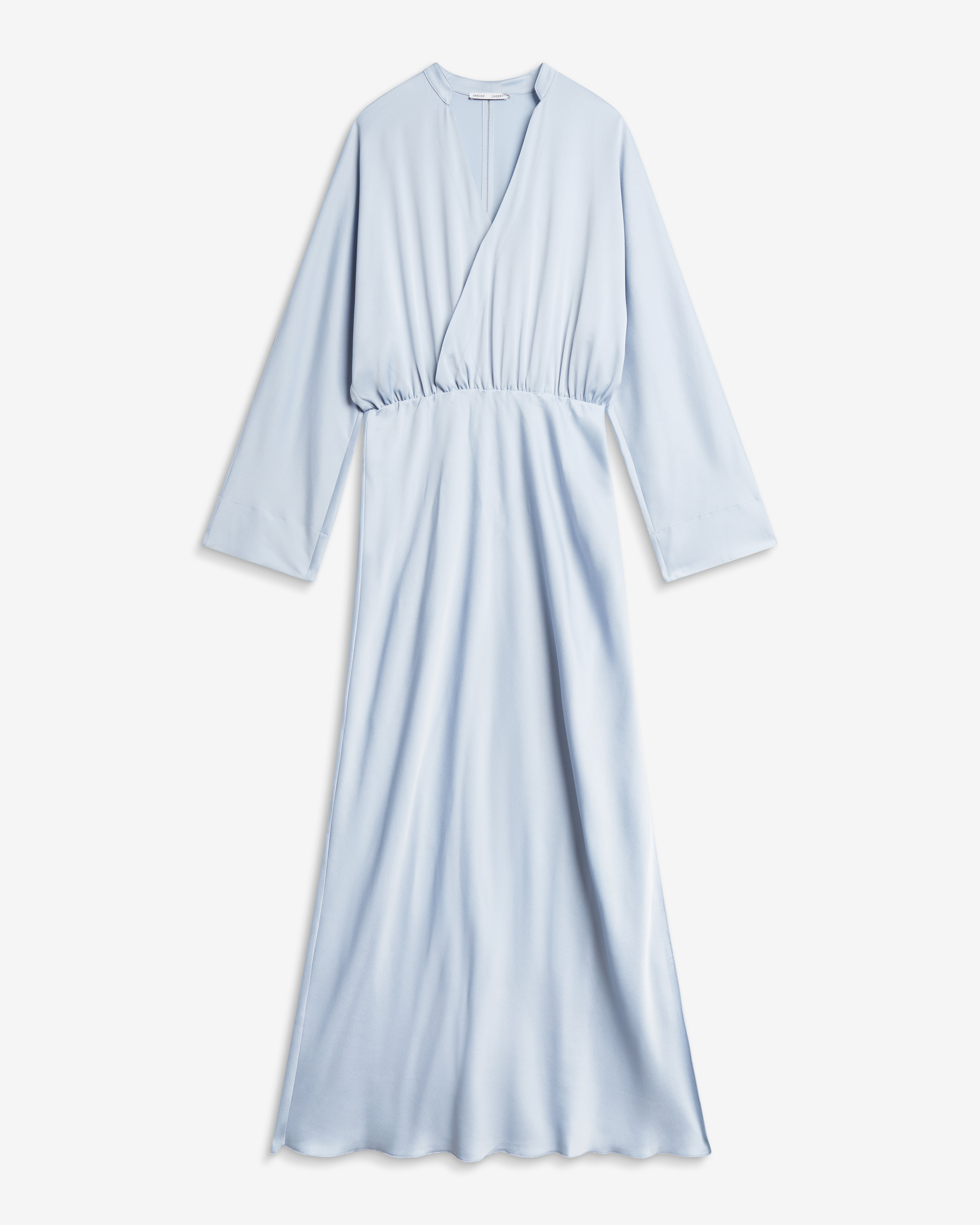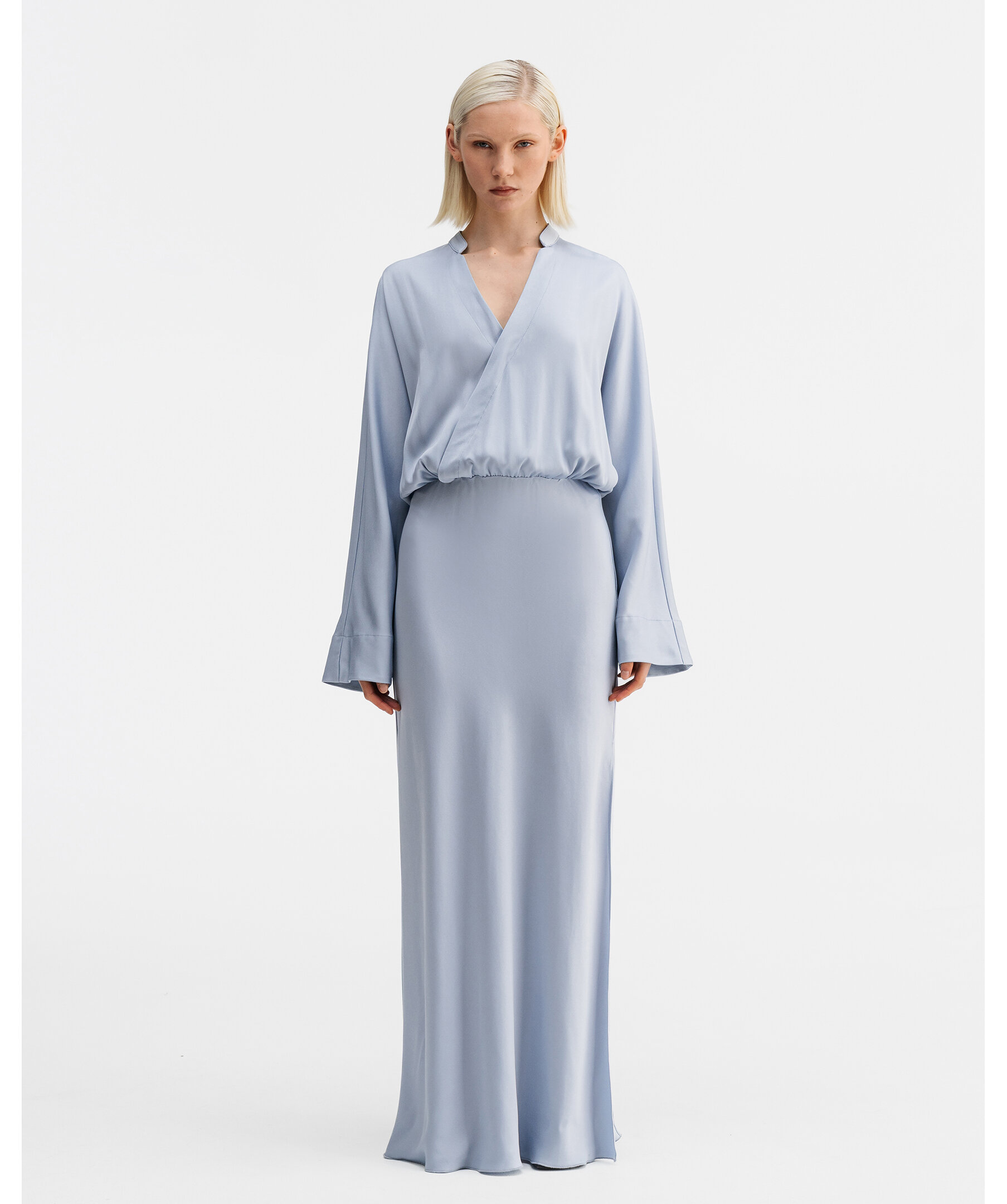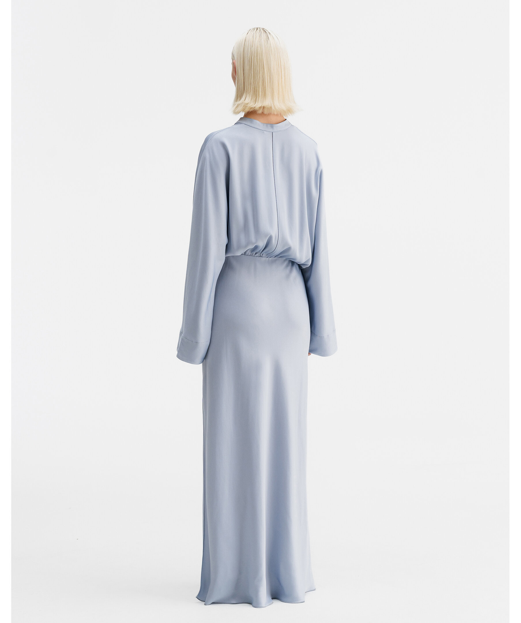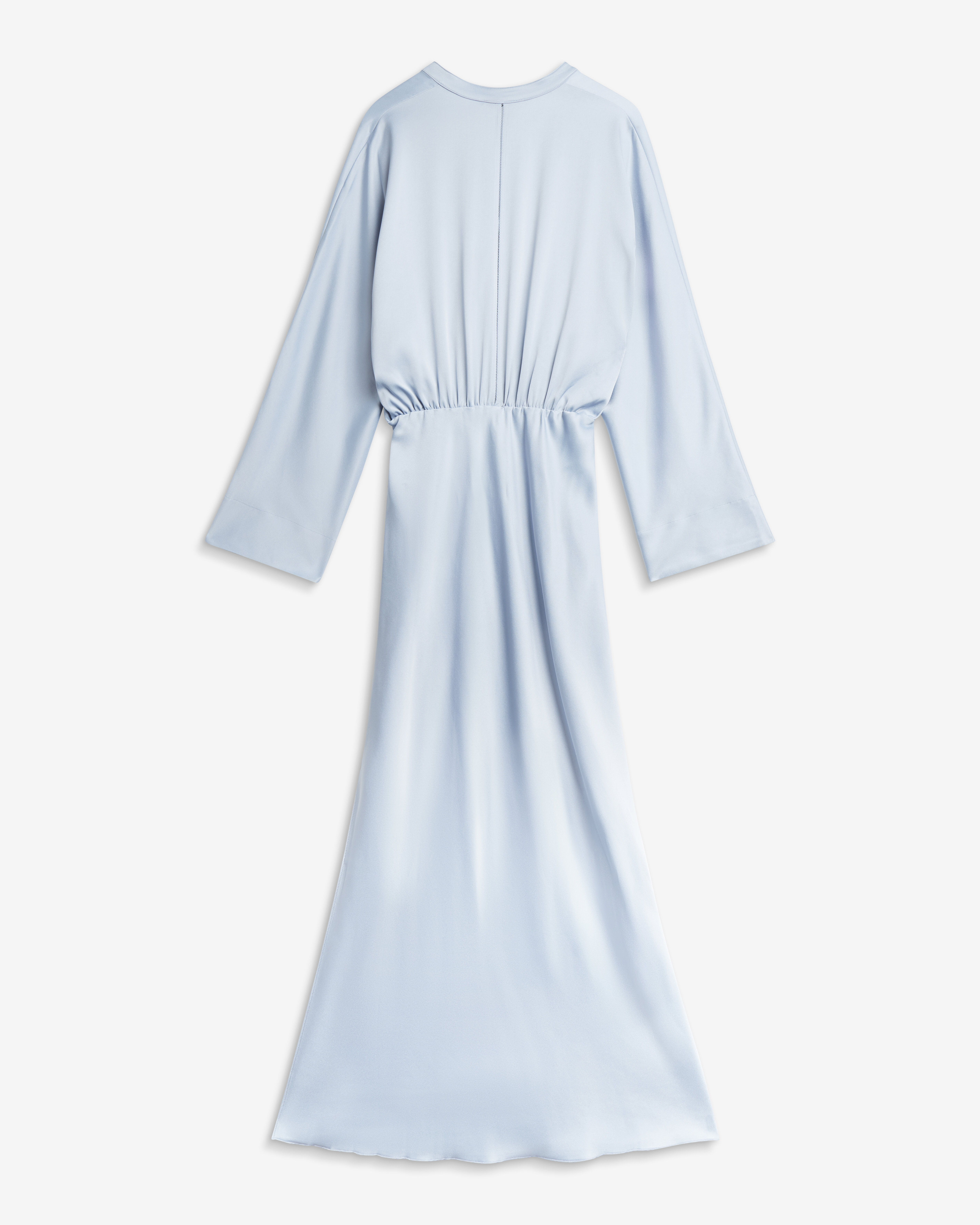 Ljusblå klänningtillverkad av en acetatblandning med en strukturerad yta. Den har en avslappnad silhuett med pingvinärmar, en v-formad halsringning med en liten kinakrage och en broderad söm längs ryggen. Det finns en resår runt midjan, en slits i vänster sidosöm och kjolen är snedskuren för perfekt form.