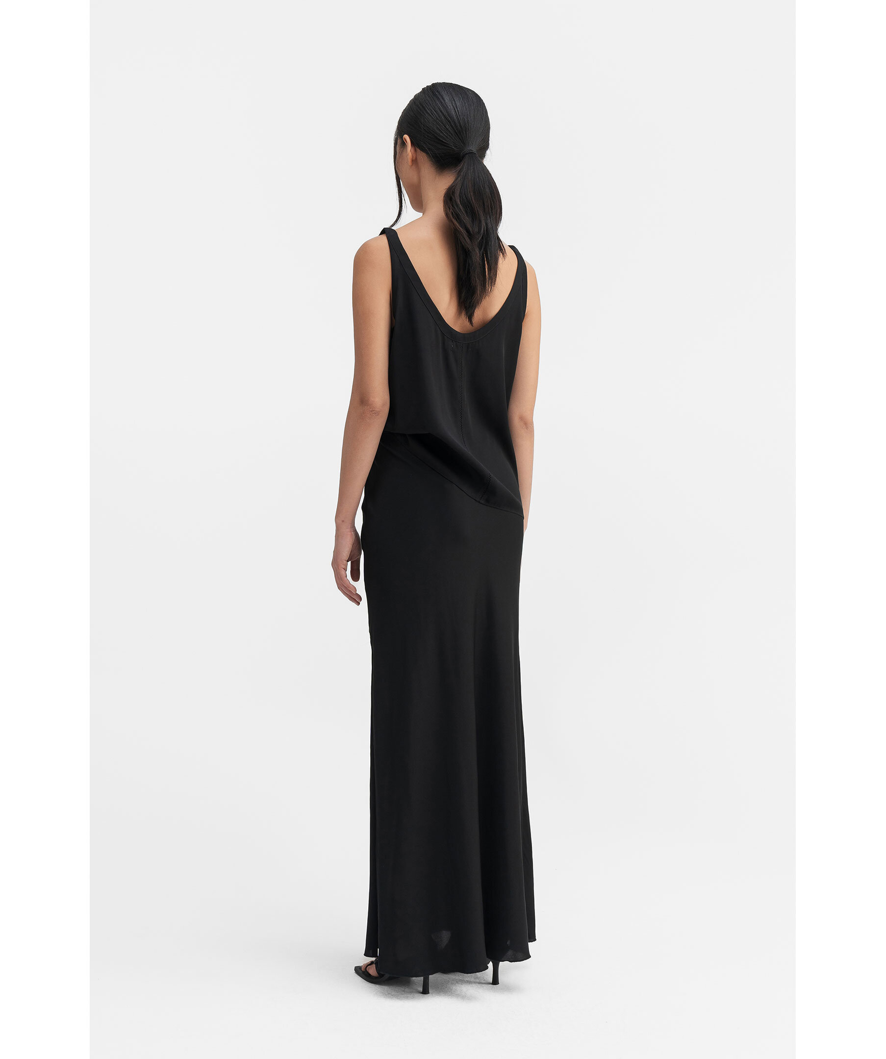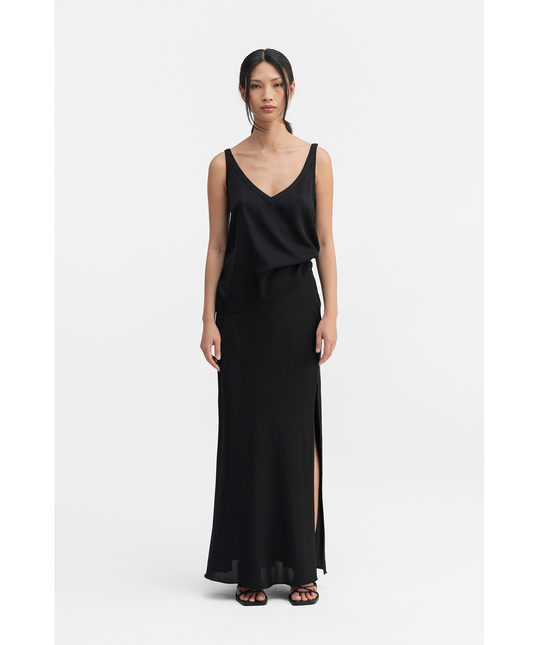 Svart linne i siden från Ahlvar Gallery. Linnet har en djup V-ringning framtill tillsammans med deras signaturbroderisöm längs ryggraden. Tillverkad i en sidenblandning.