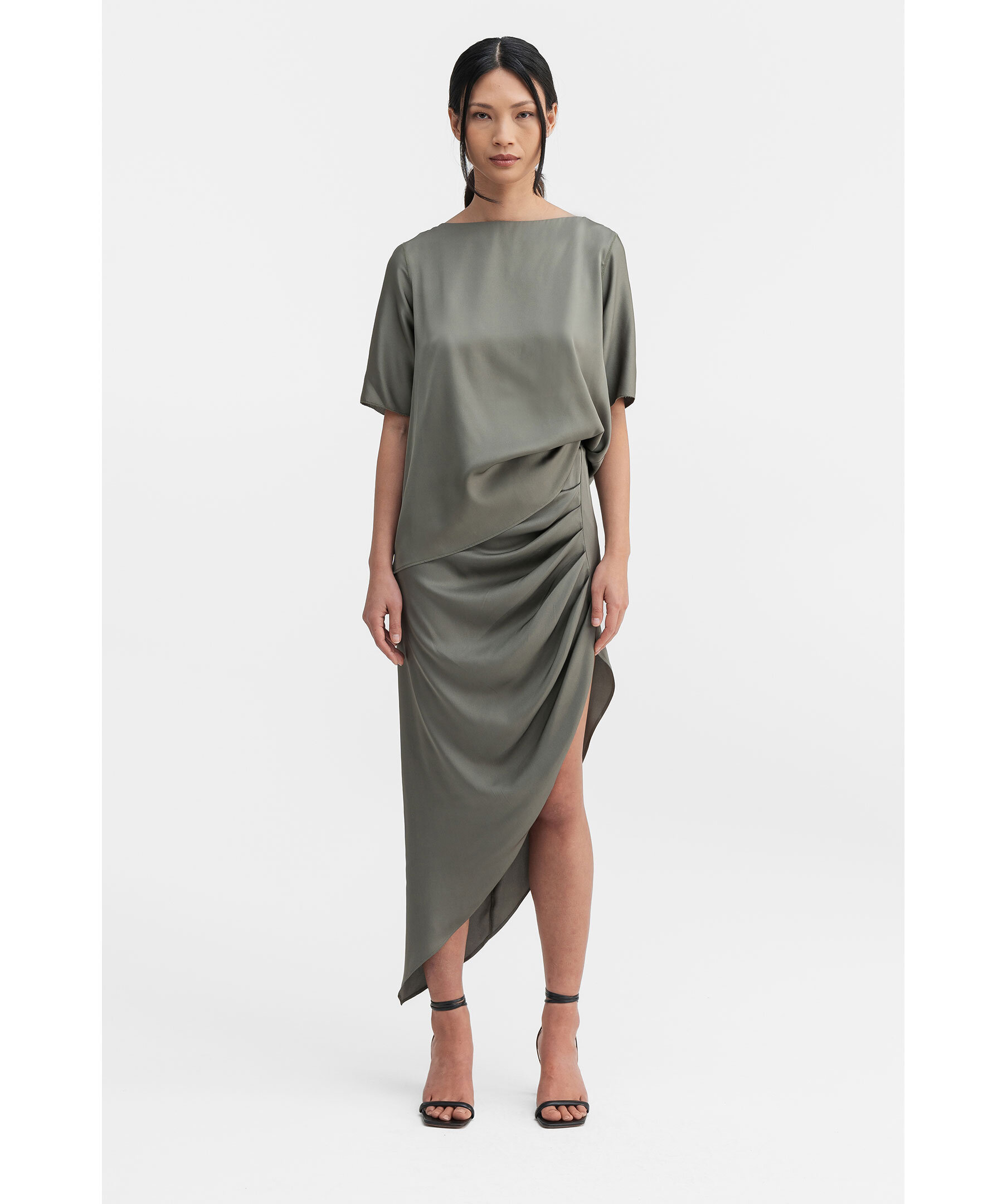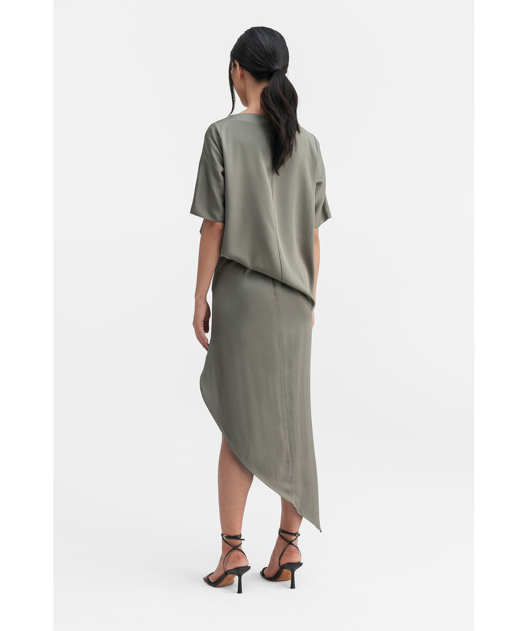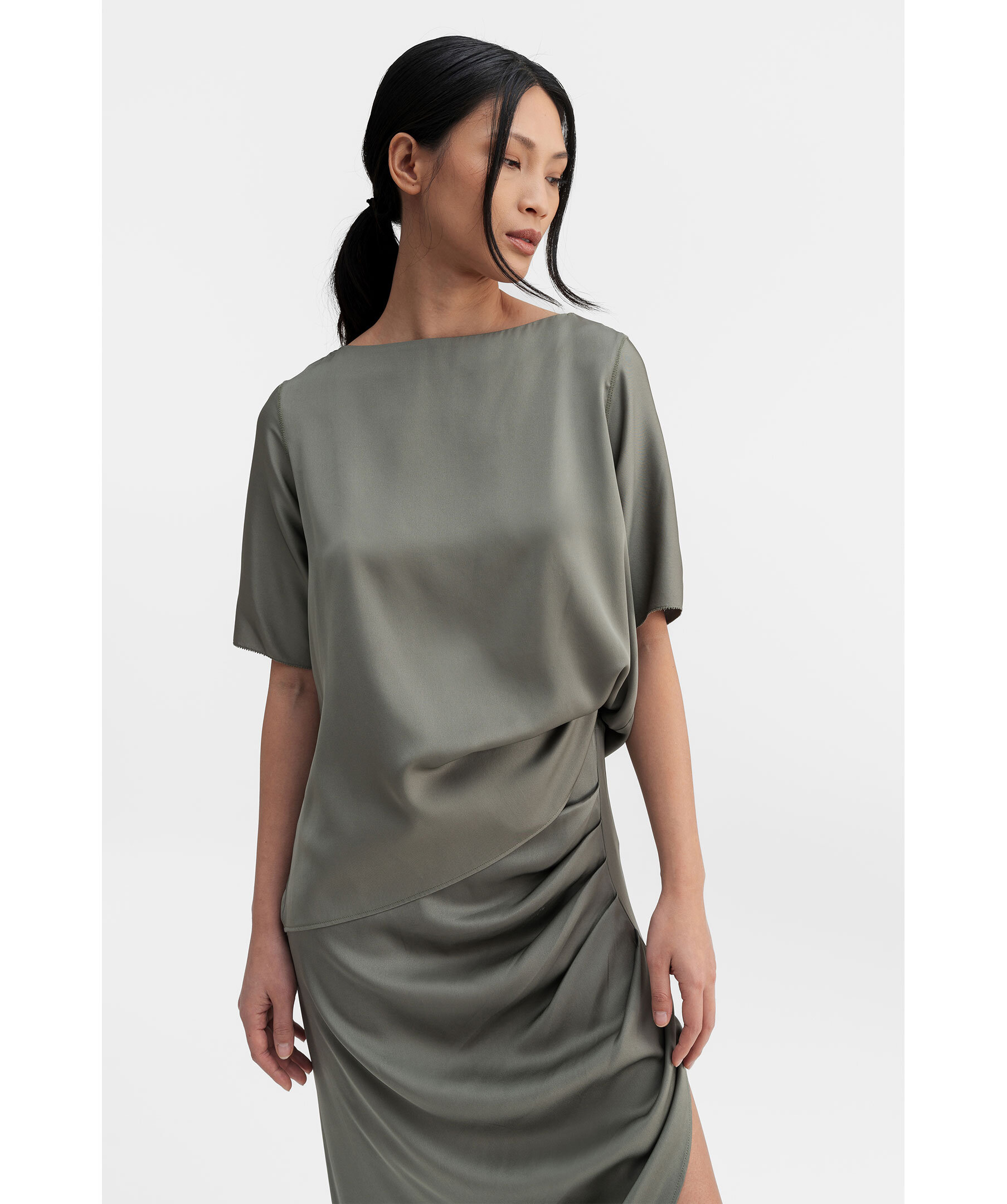 Ljus, militärgrön sidenblus från Ahlvar Gallery. Blusen har en båtringning, korta ärmar och deras signaturbroderisöm längs ryggen. Tillverkad i en sidenblandning.