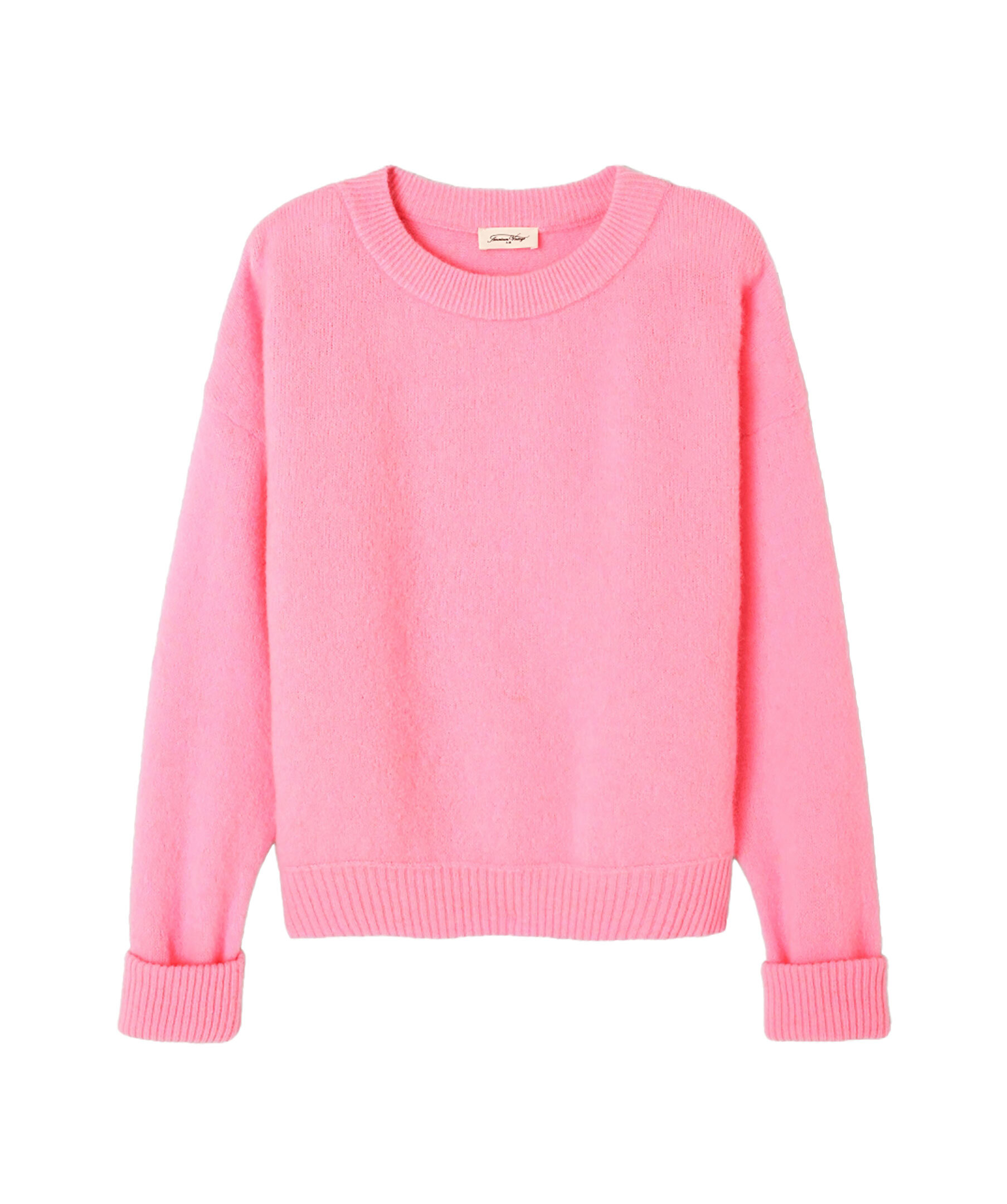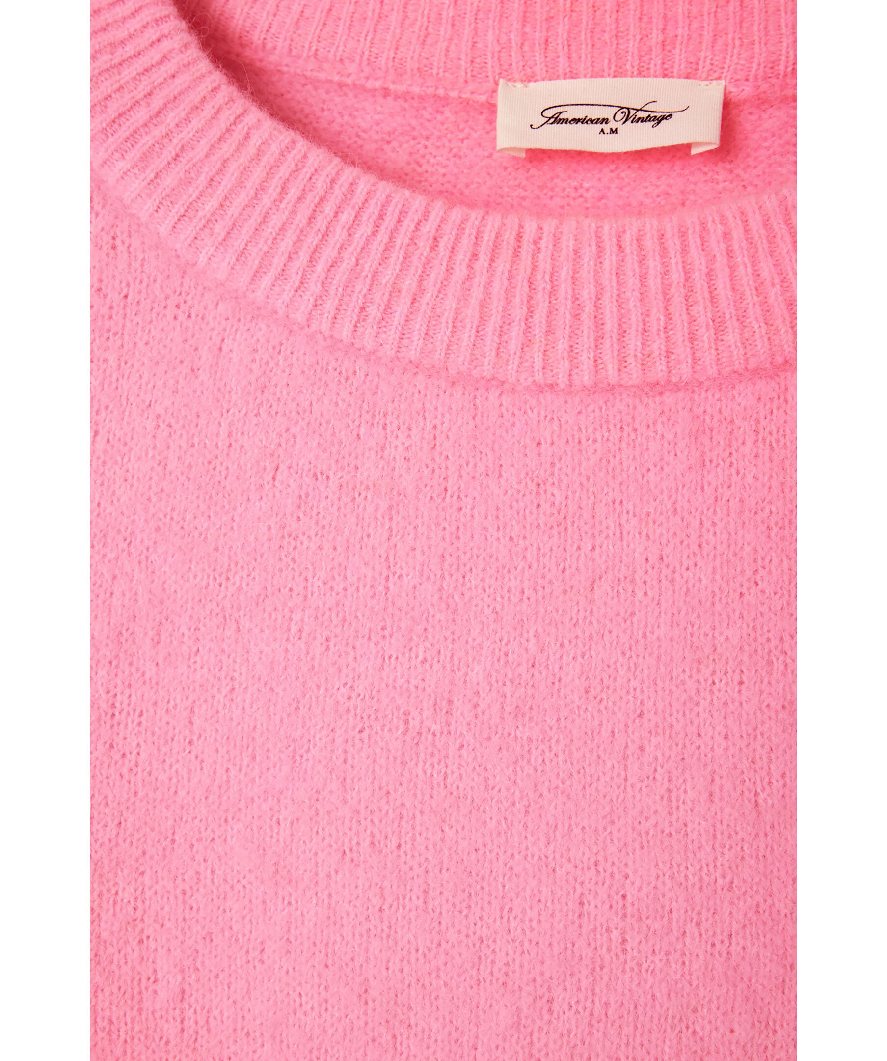Rosa, stickad pullover från American Vintage. Tröjan har rundad och ribbstickad halsringning samt ribbstickade muddar vid ärm- och plaggslut. Tillverkad i en alpacka- och ullblandning.