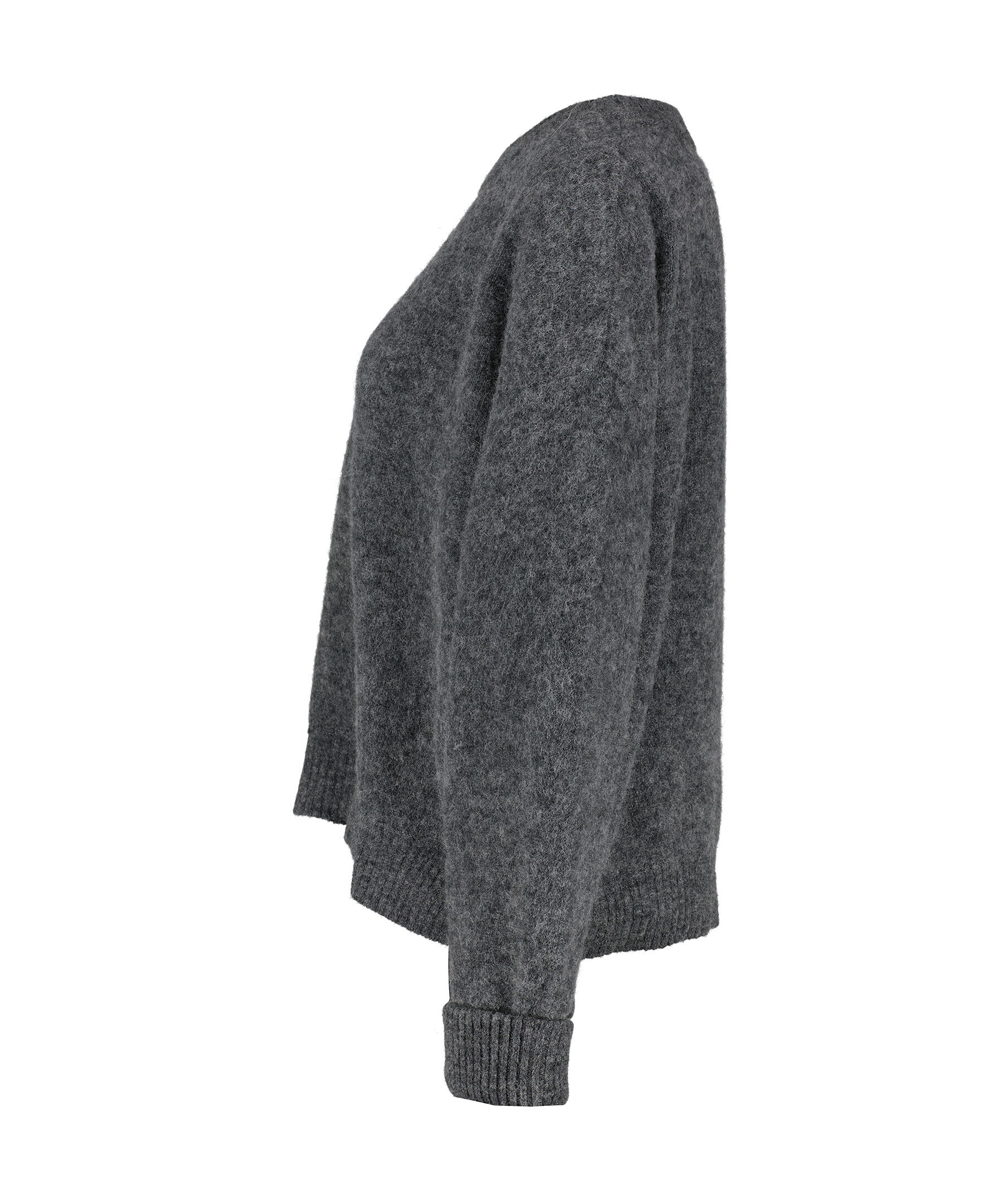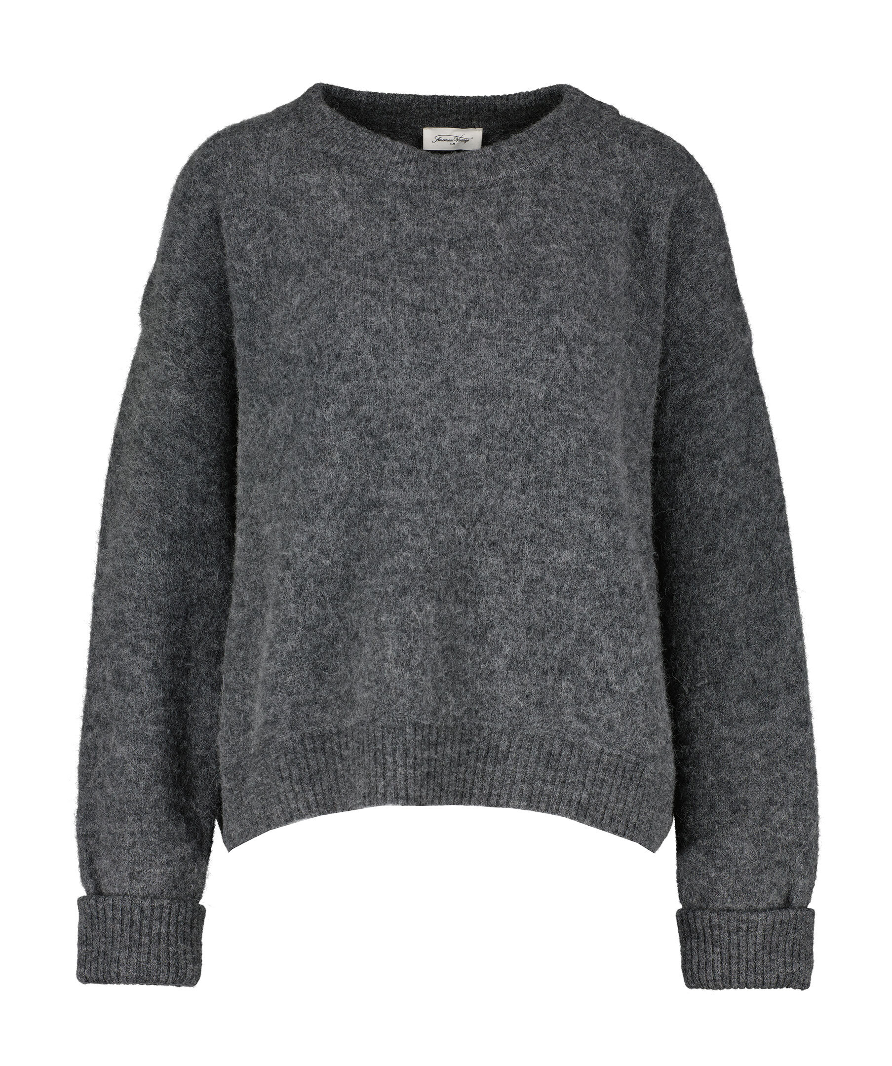 Mörkgrå, stickad pullover från American Vintage. Tröjan har rundad och ribbstickad halsringning samt ribbstickade muddar vid ärm- och plaggslut. Tillverkad i en alpacka- och ullblandning.