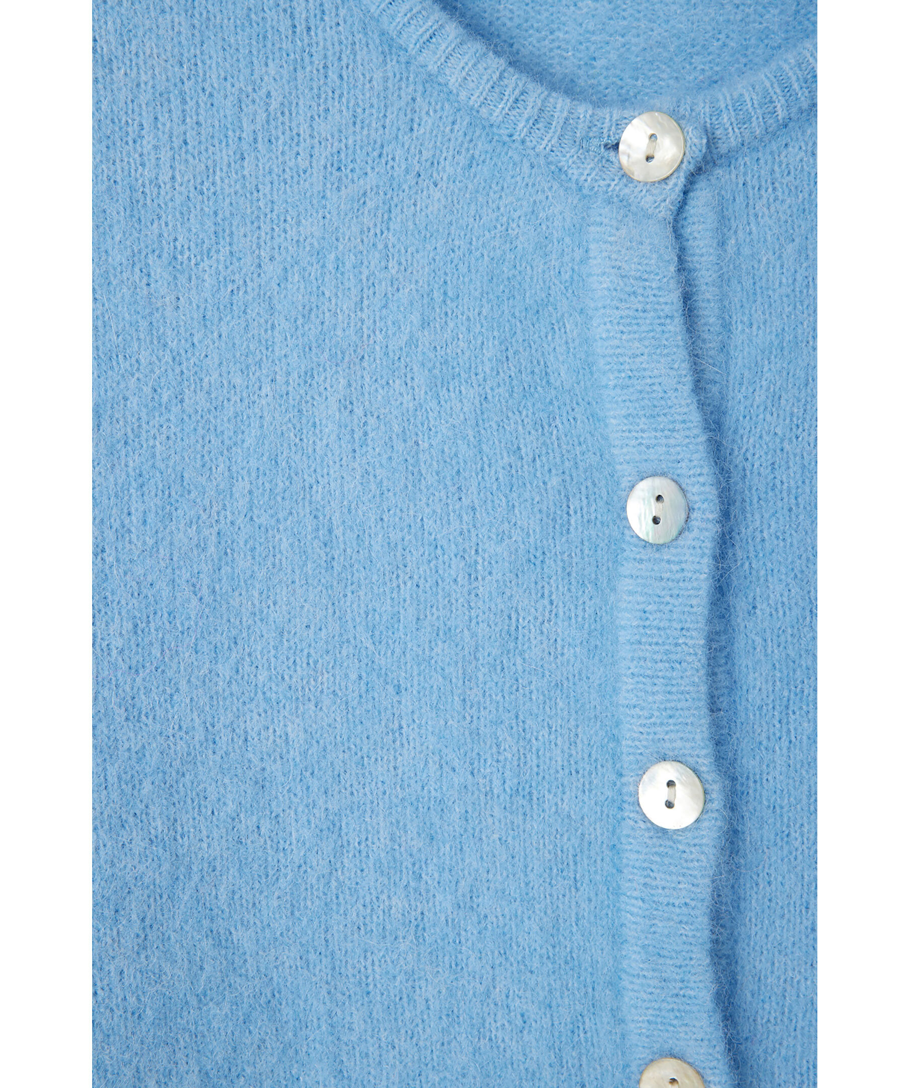 Ljusblå stickad kofta från American Vintage. Stängs framtill med knappar i pärlemor. Ribbstickad halsringning, ärm- och plaggslut. Tillverkad i ullblandning.