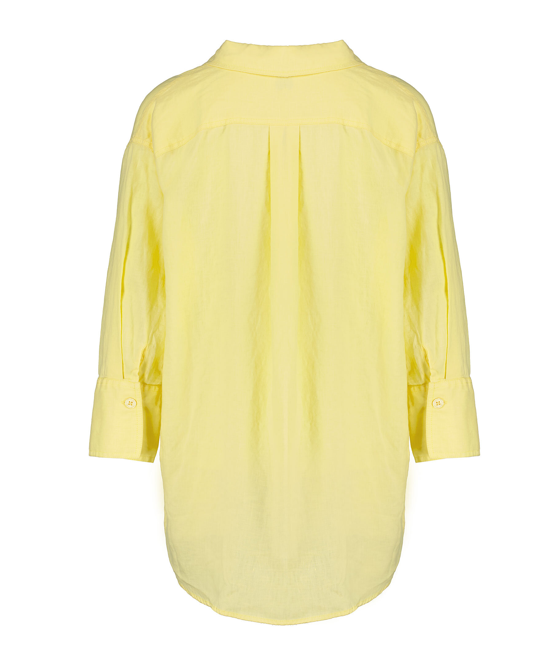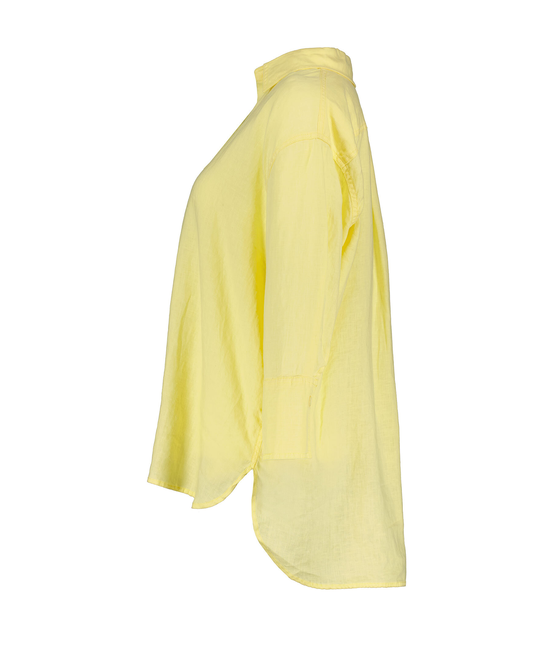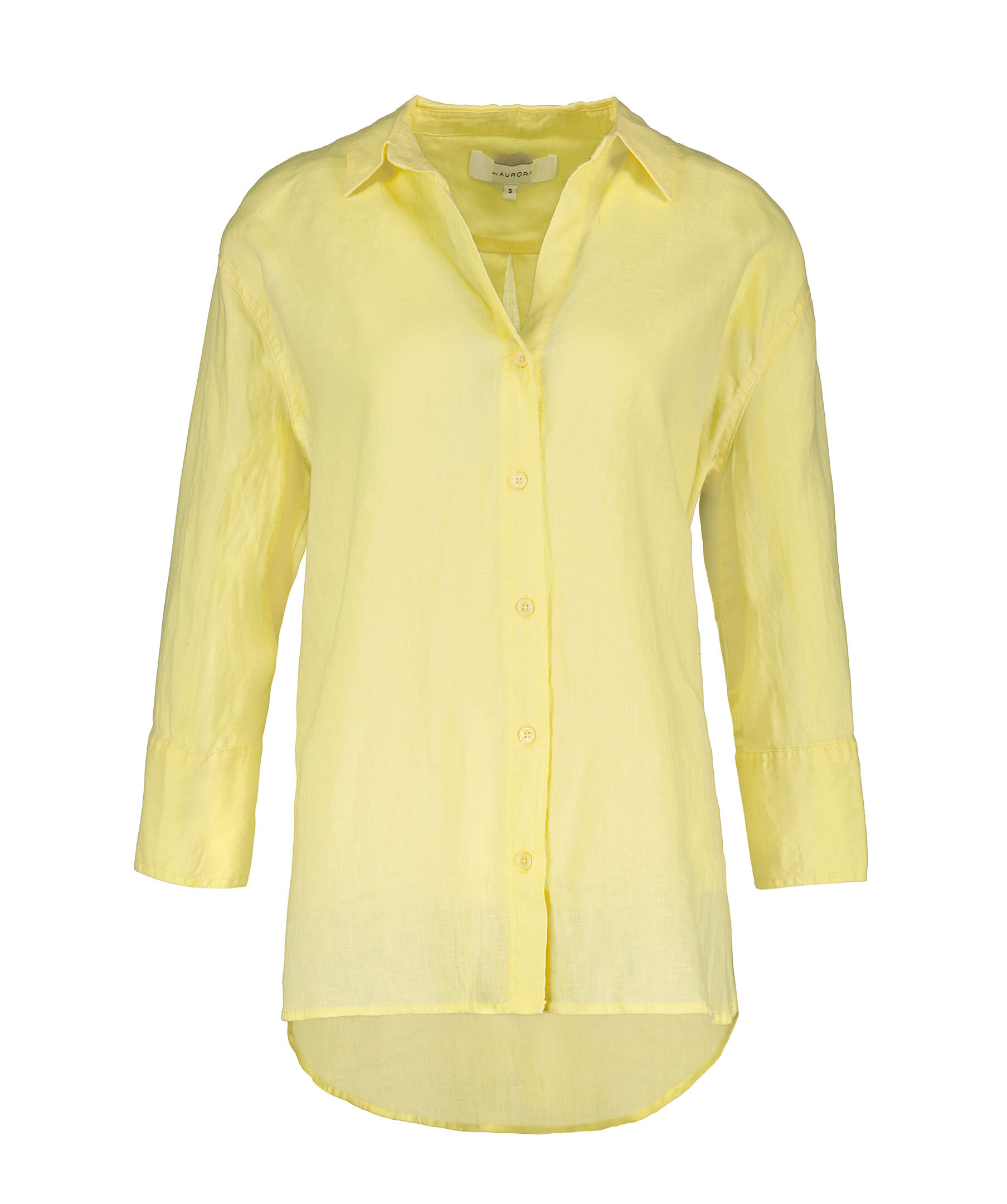 Gul, längre linneskjorta från My Aurora. Skjortan stängs med knappar framtill, är längre baktill och har där en rundad fåll. Manschetter med knapp. Tillverkad av linne.