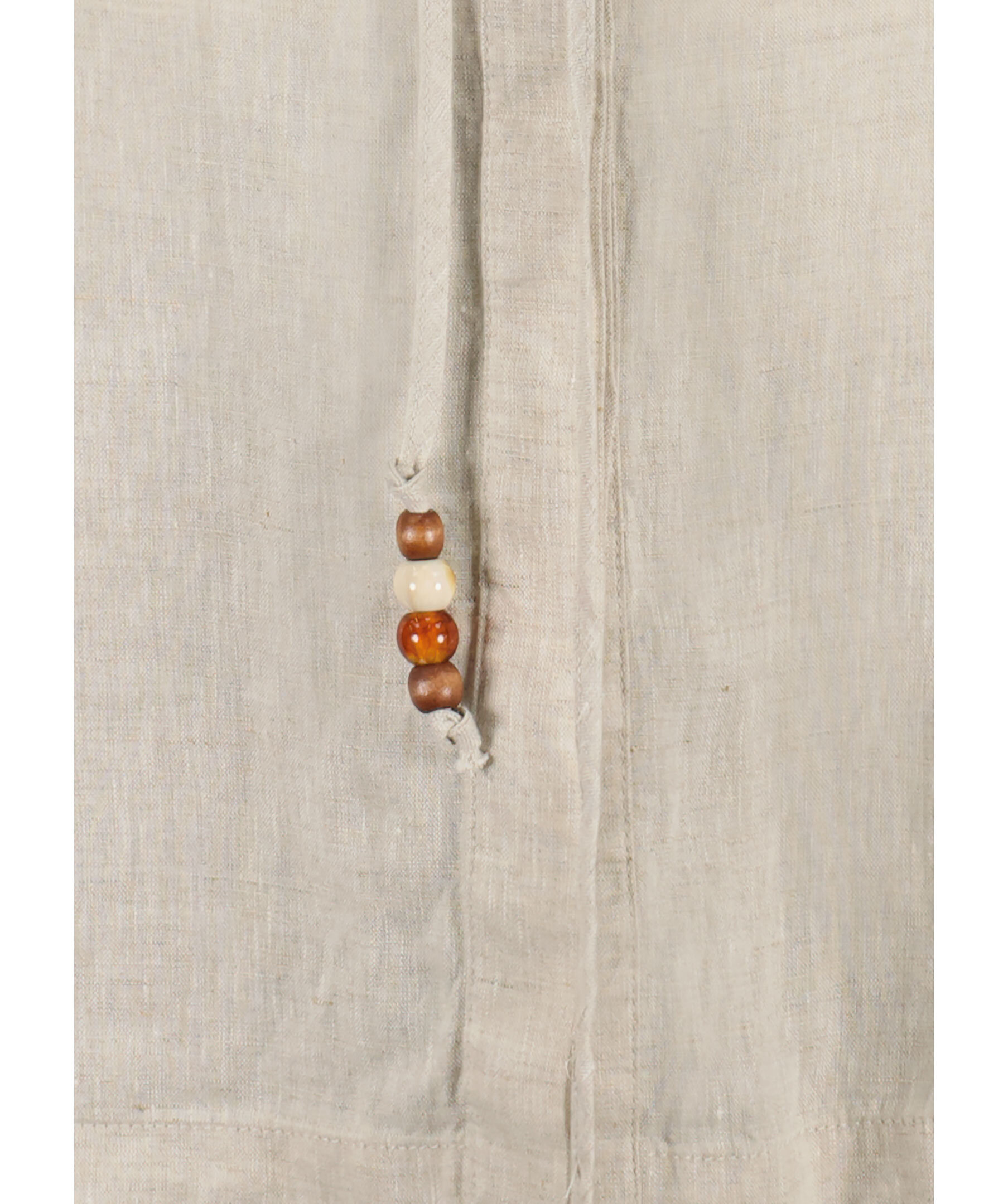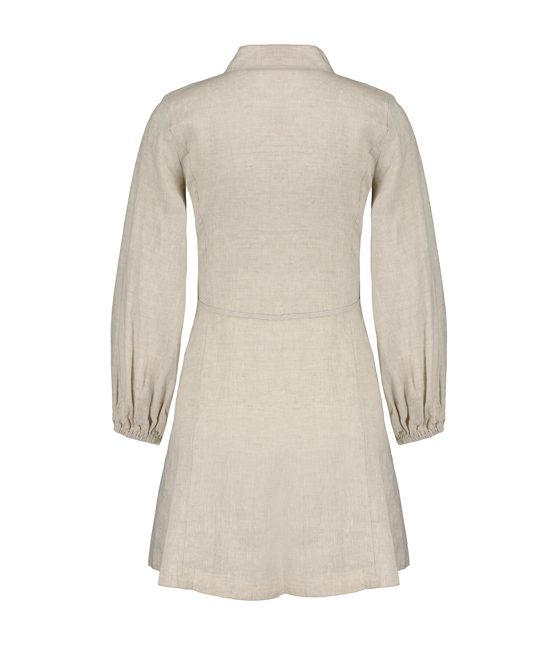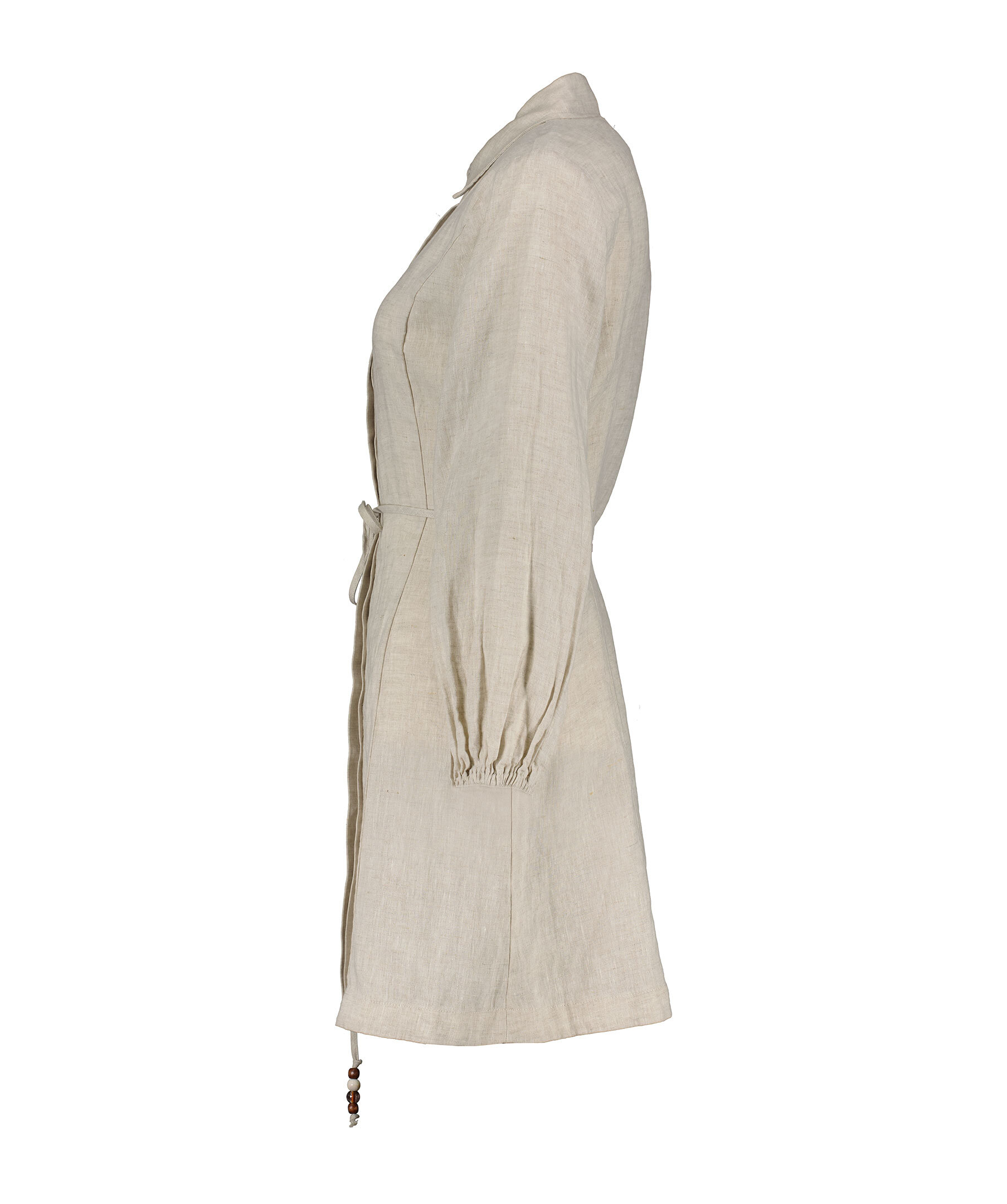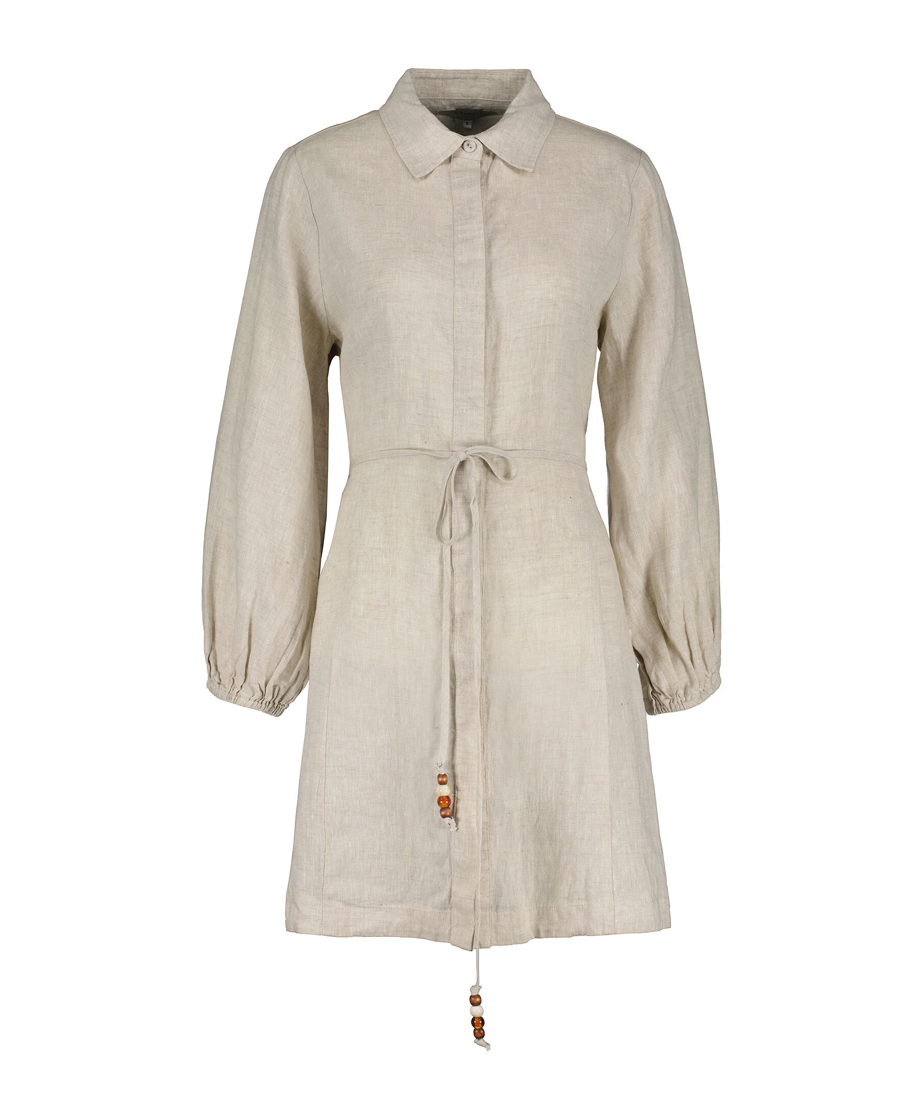 Sandfärgad, långärmad skjortklänning från My Aurora. Klänningen stängs med dolda knappar och har avtagbart snöre i midjan, snöret har dekorativa pärlor i slutet. Tillverkad i 100% lin.