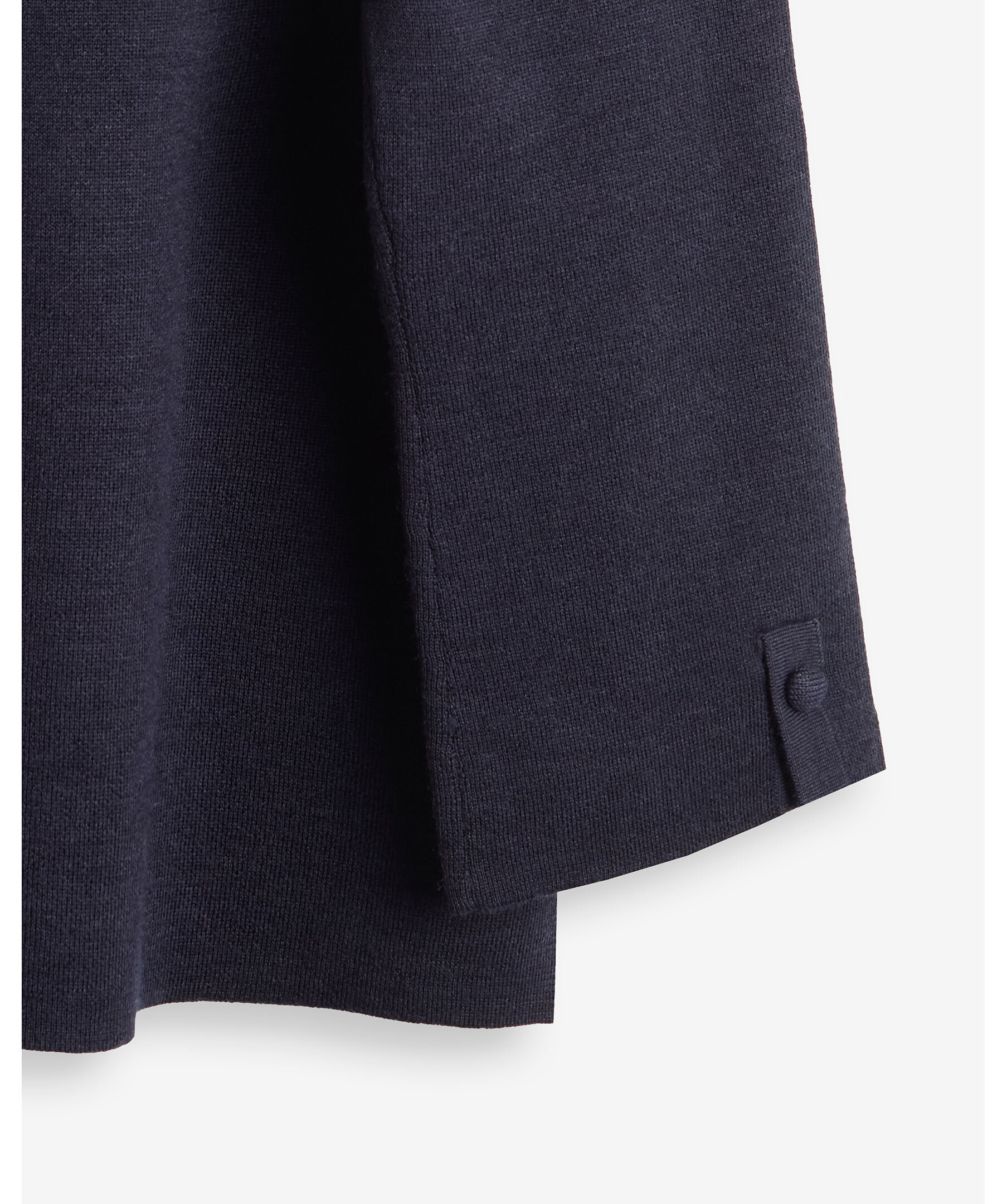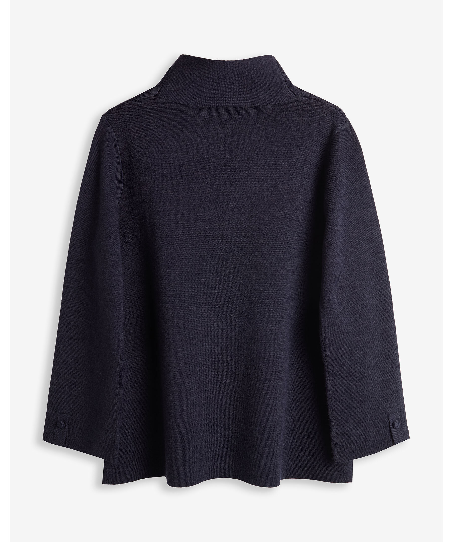 Mörkblå, finstickad pullover med hög krage och korta slitsar i sidorna från My Aurora. Tillverkad i 100% merinoull.