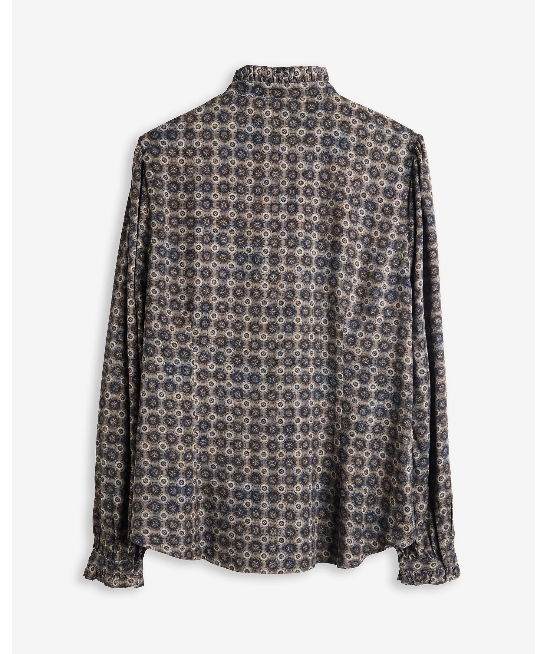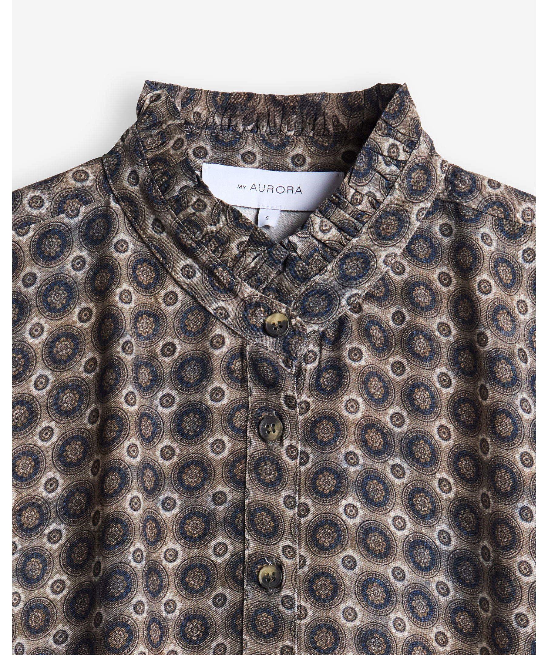 Mönstrad skjorta från My Aurora. Skjortan stängs med knappar och har volanger vid kragen. Tillverkad i 100% viskos.