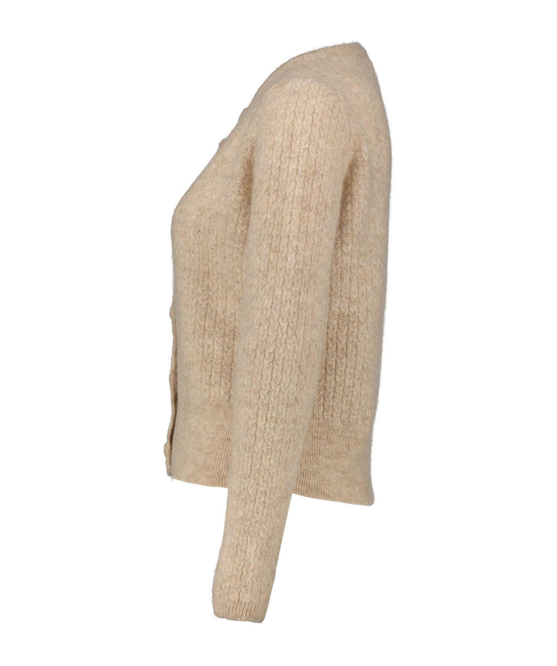 Sandfärgad, stickad kofta från My Aurora. Koftan har ett subtilt kabelstickat mönster, stängs med klädda knappar. Rund halsringning och ribbstickade avslut. Tillverkad av en ullblandning.