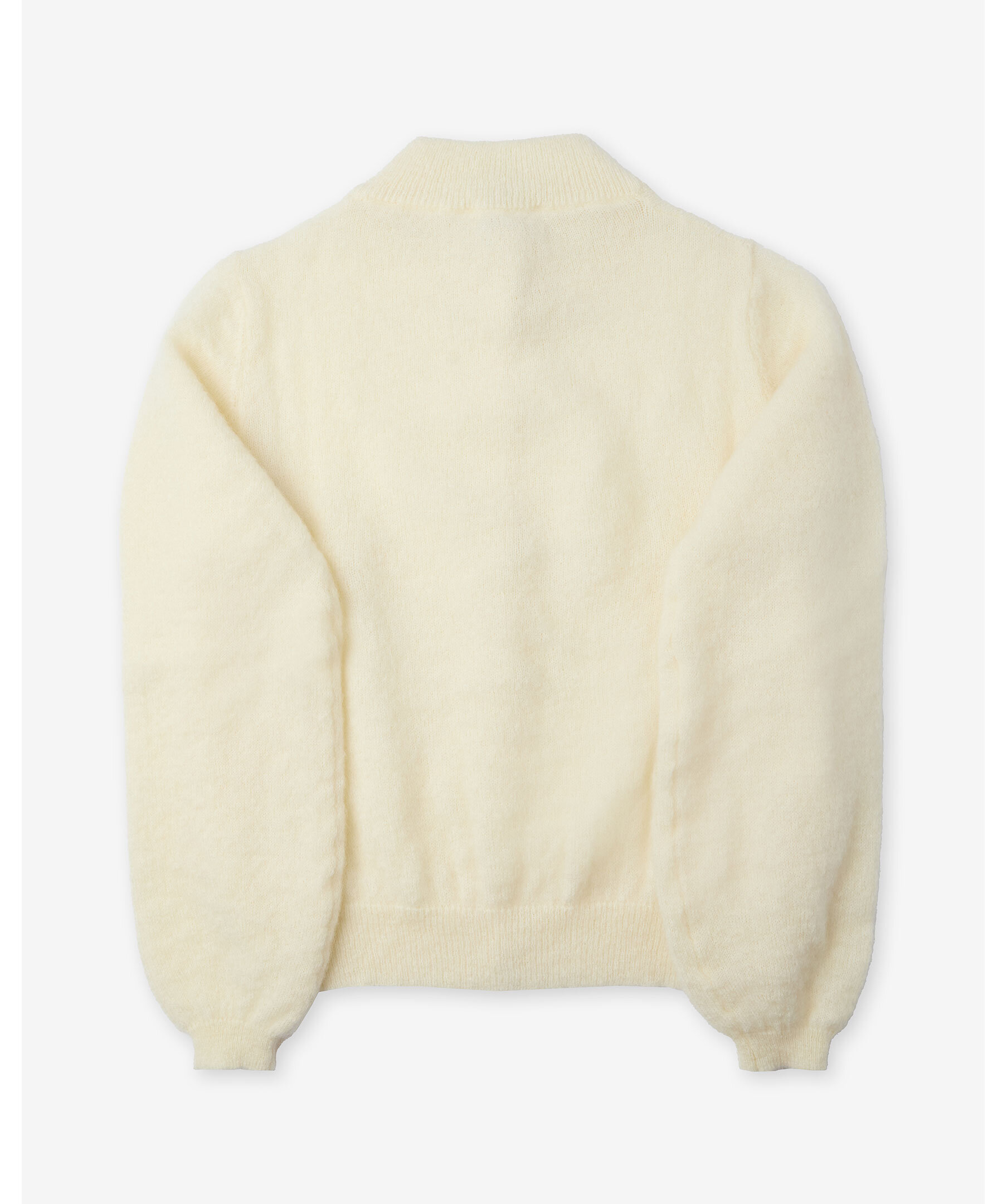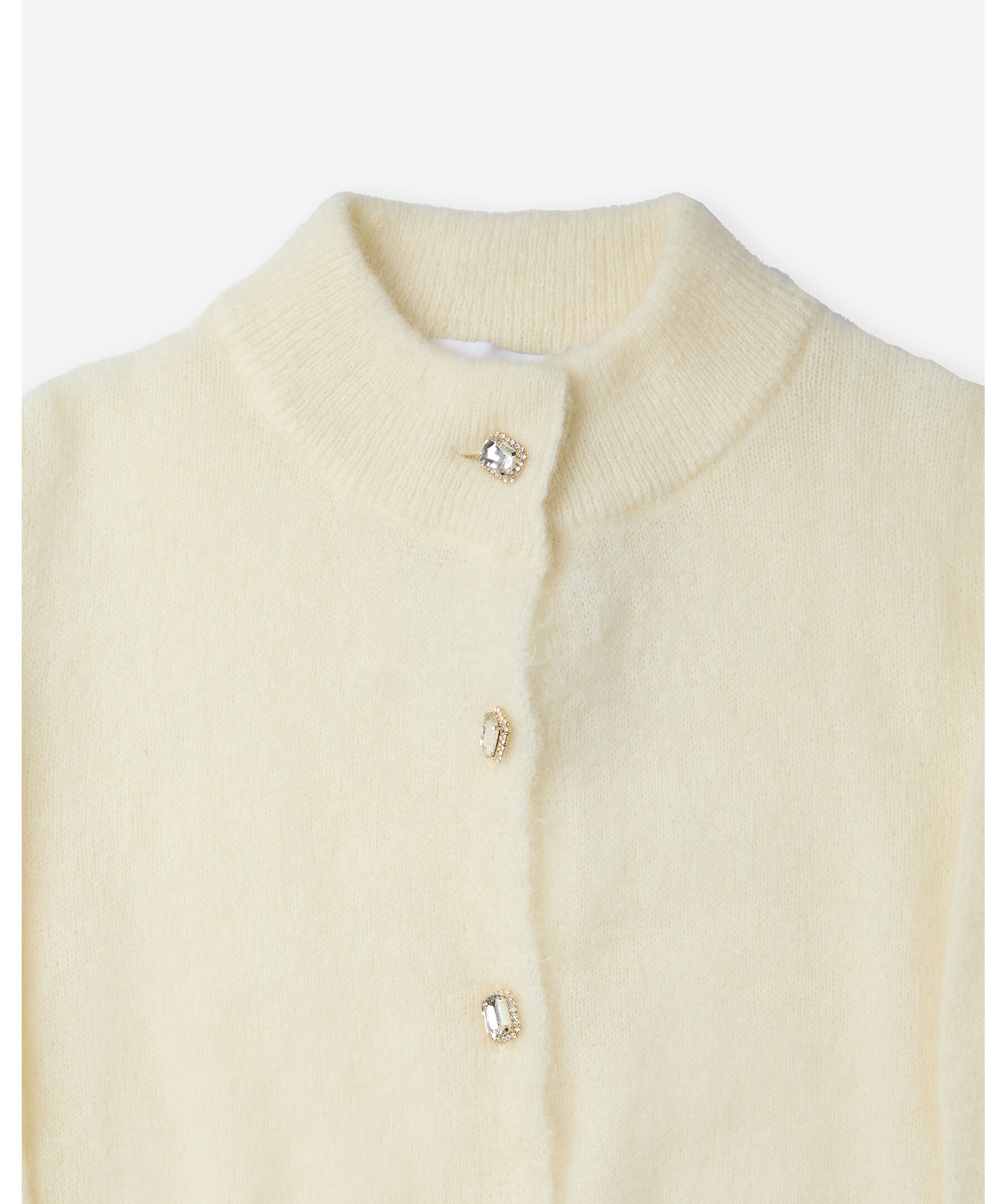 Stickad cardigan i vitt från My Aurora. Ribbstickade muddar och dekorativa knappar liknande diamanter. Gjord i en mohairmix.