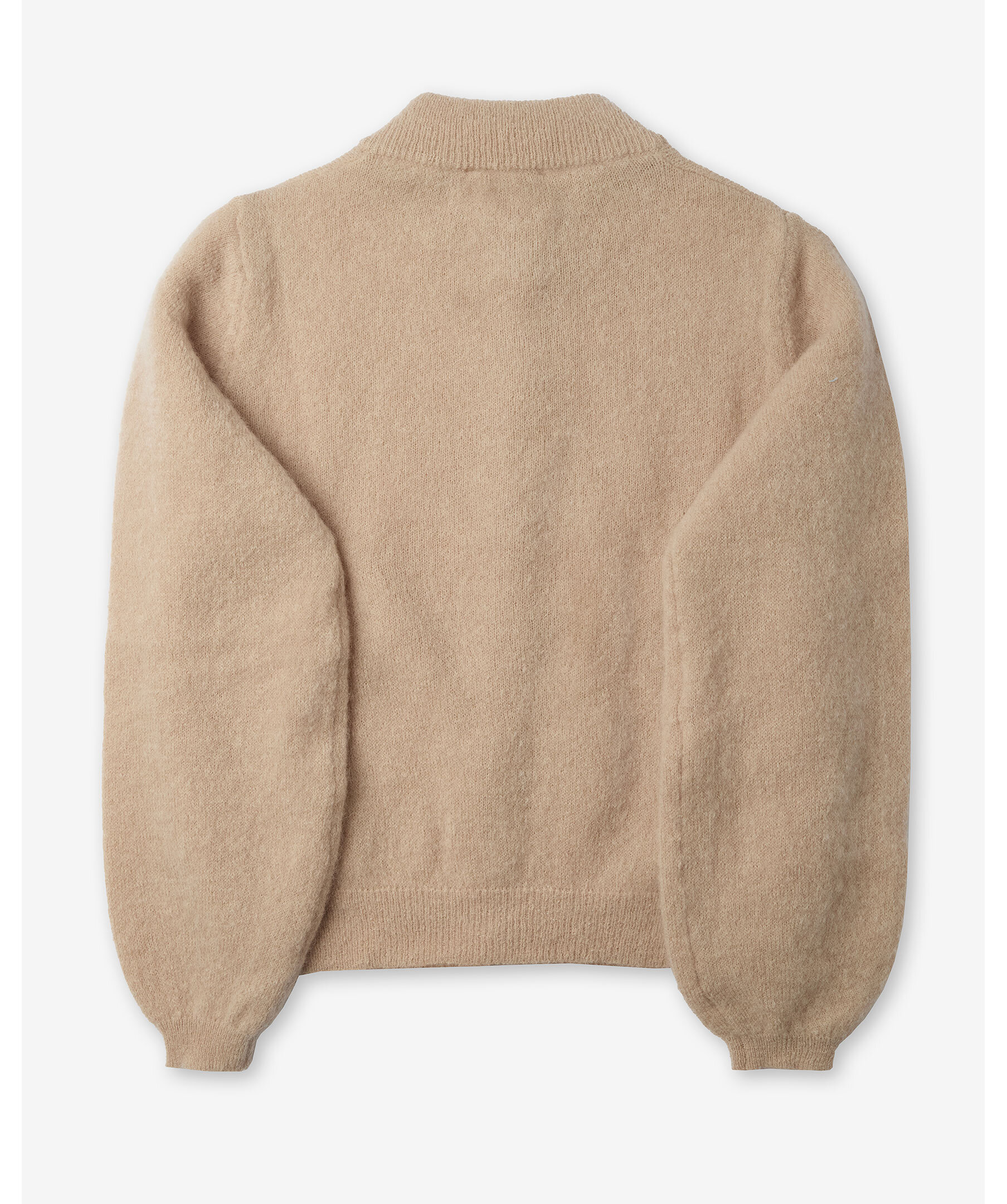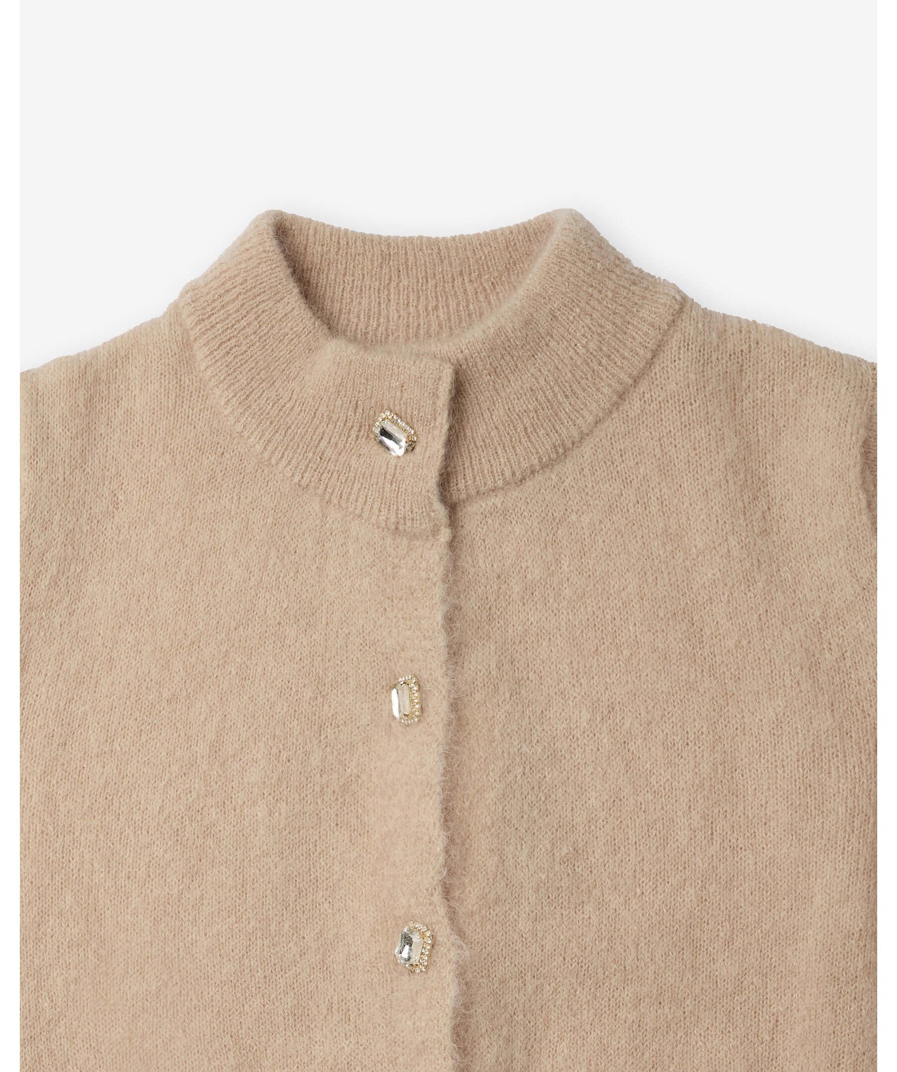Stickad cardigan i beige från My Aurora. Ribbstickade muddar och dekorativa knappar liknande diamanter. Gjord i en mohairmix.