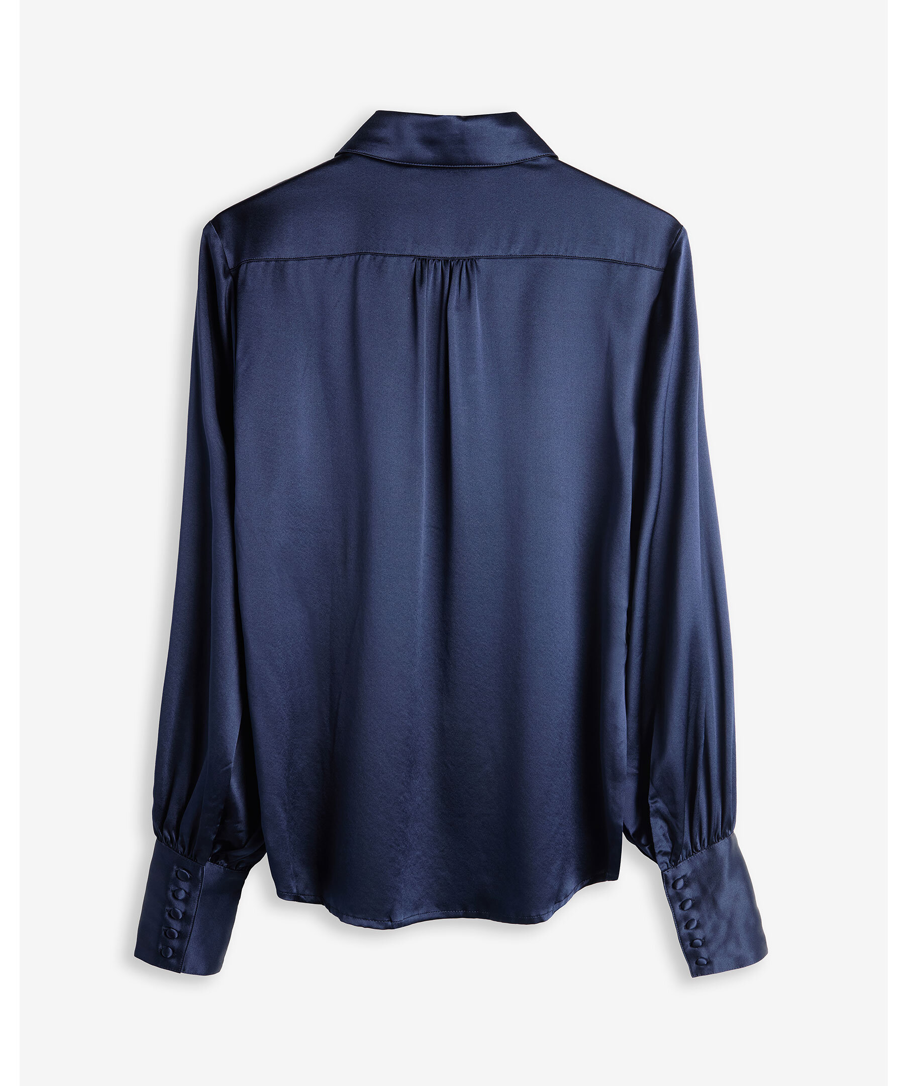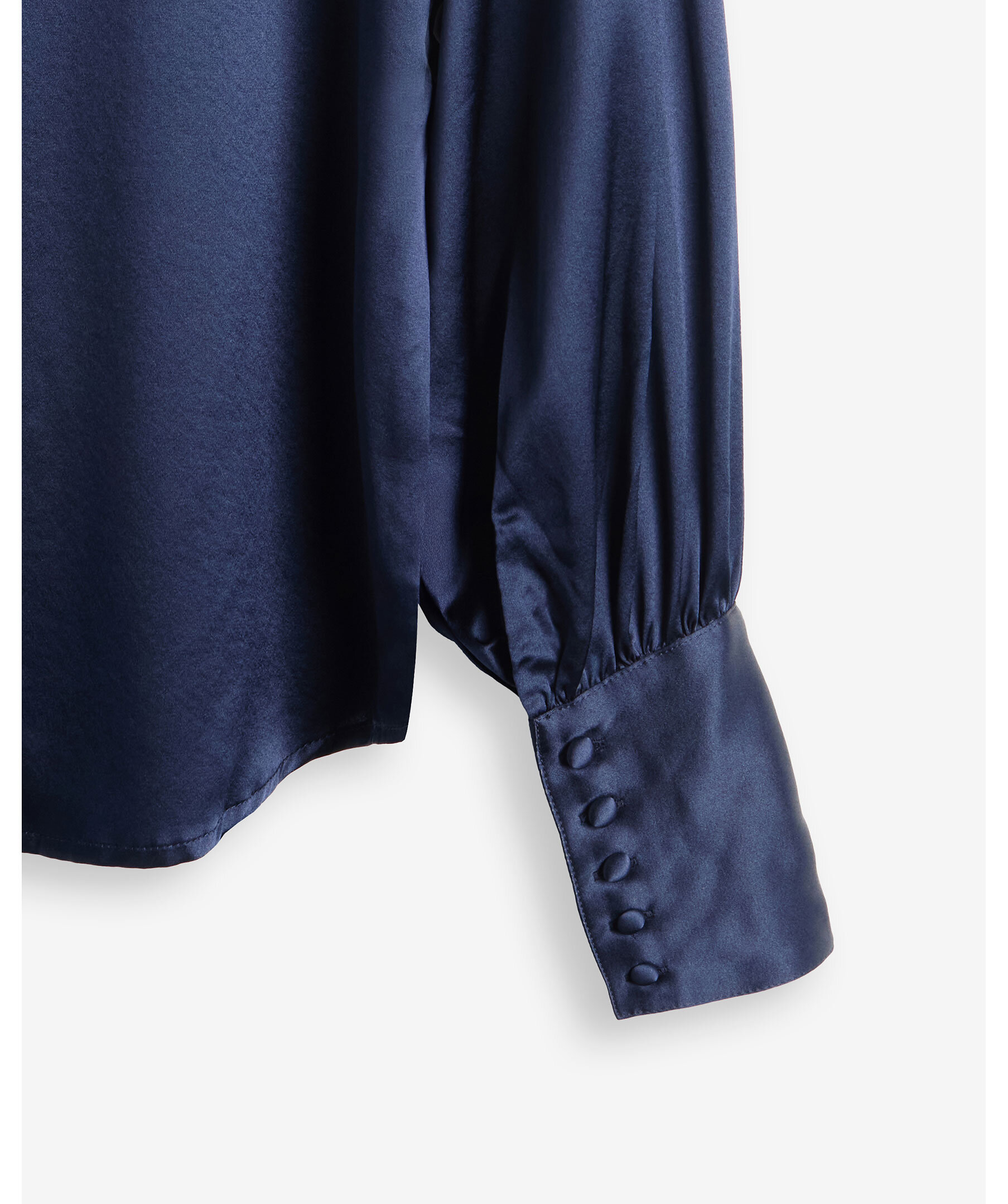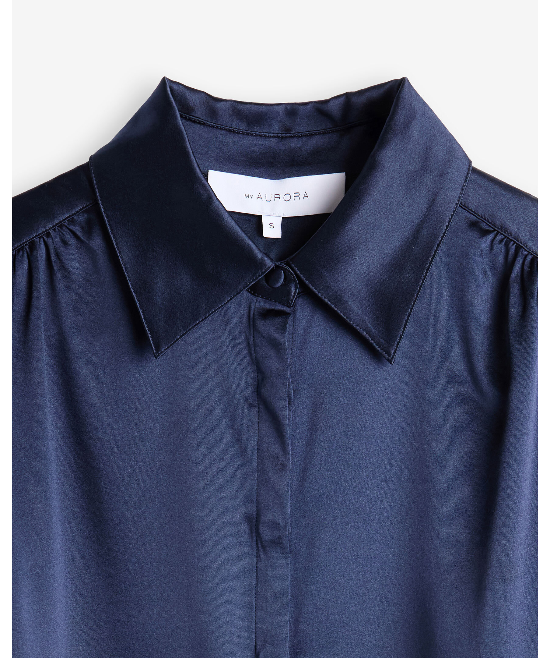 Mörkblå silkblus från My Aurora. Blusen har dolda knappar framtill, ballongärmar och klädda knappar på manschetterna. Tillverkad i en silkblandning.